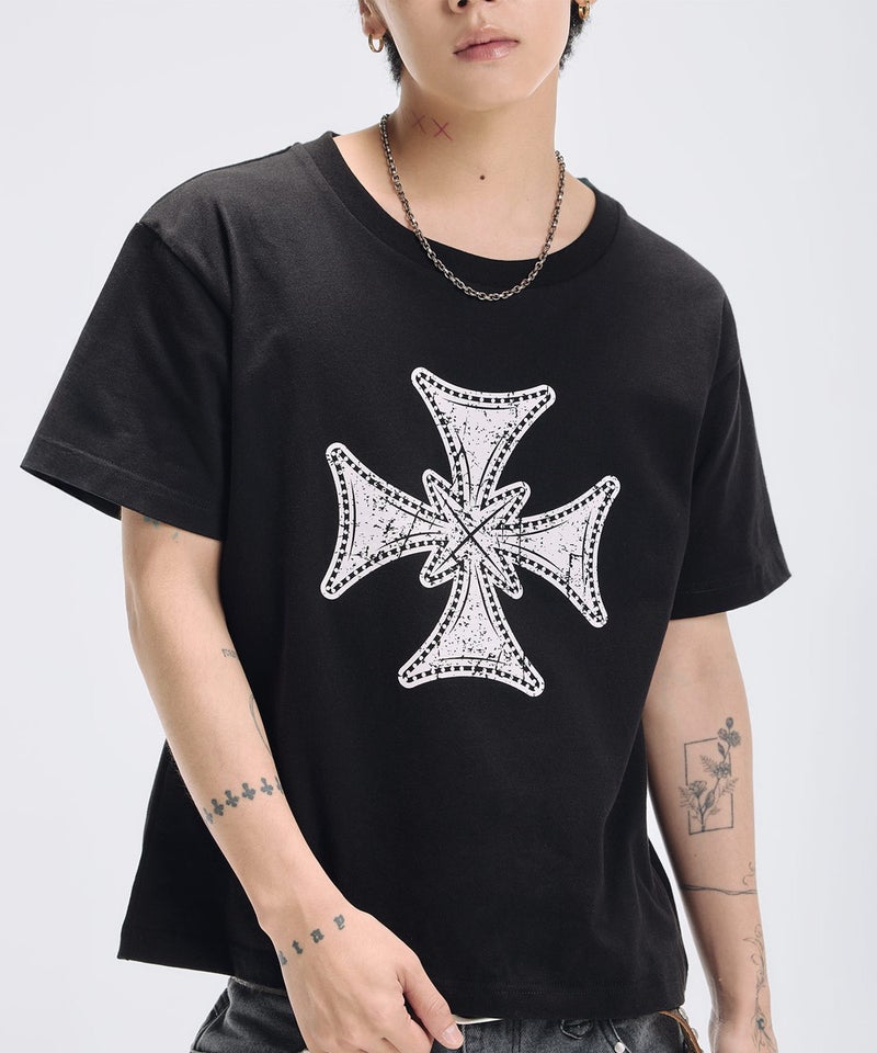 グラフィックプリント短丈半袖スラブTシャツ