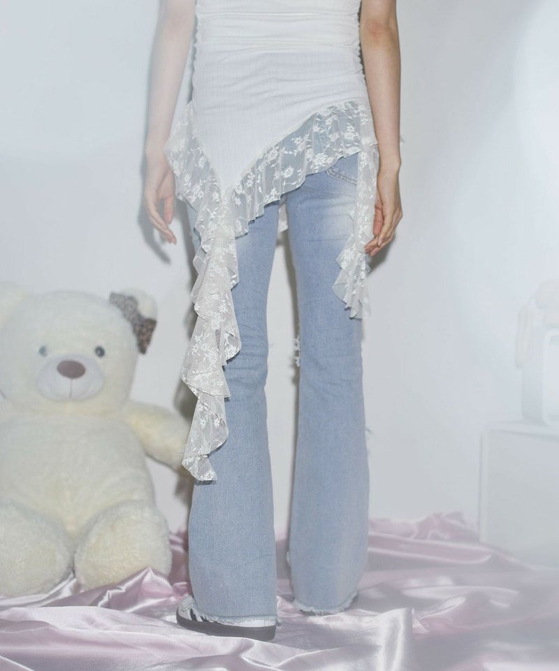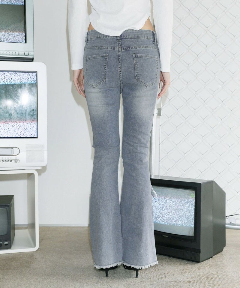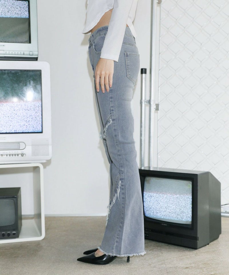 ・エッジの効いたディテールが今っぽいフリンジフレアデニム。