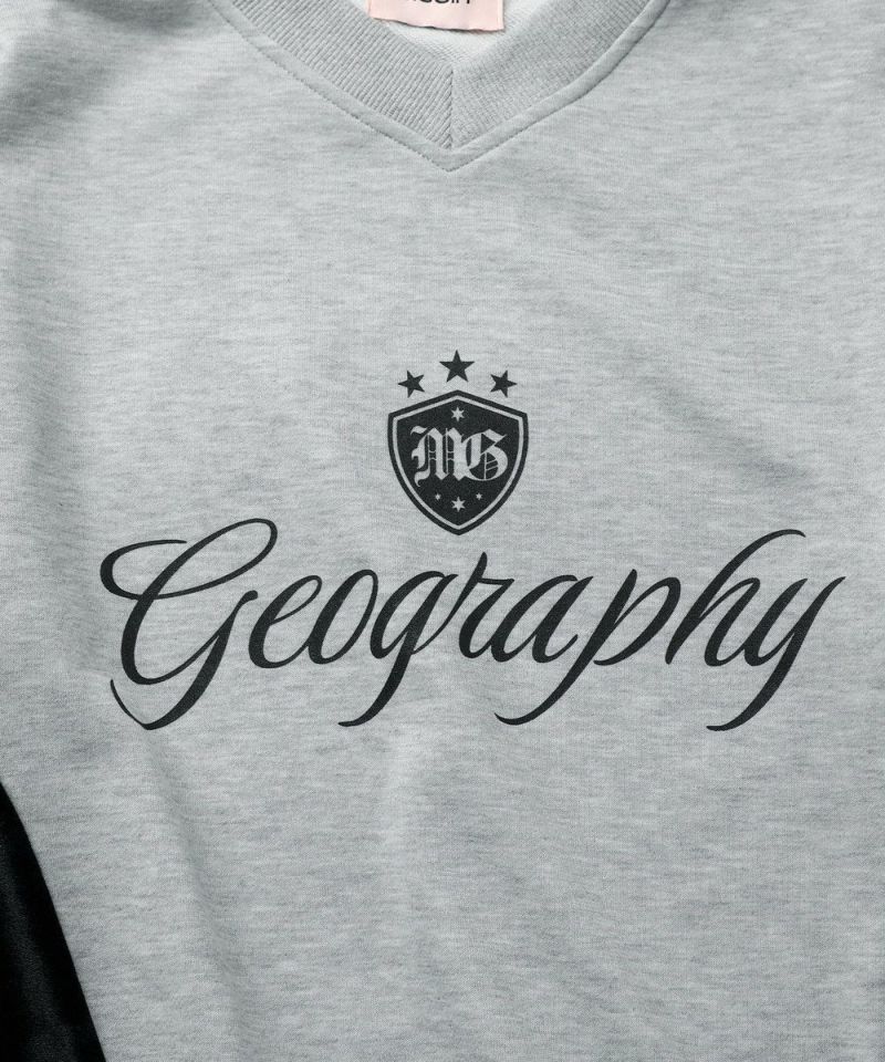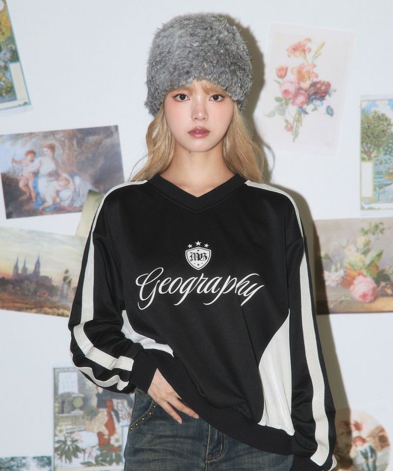 ・フロントの「Geography」ロゴが目を引く、韓国ストリートムード漂うスポーティなゲームスウェット。