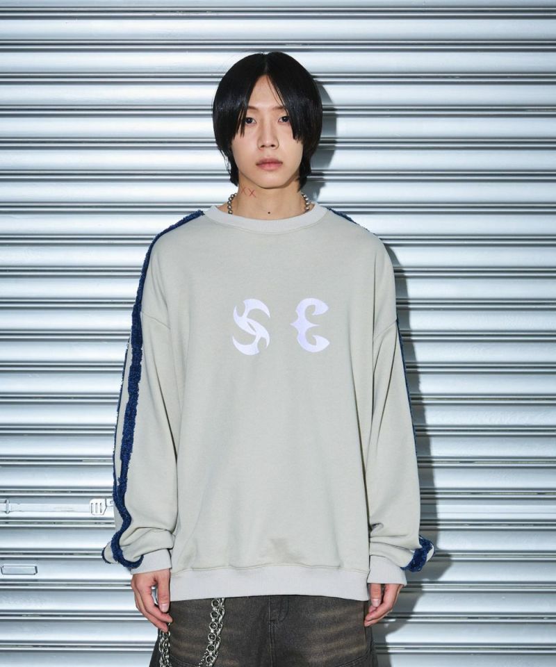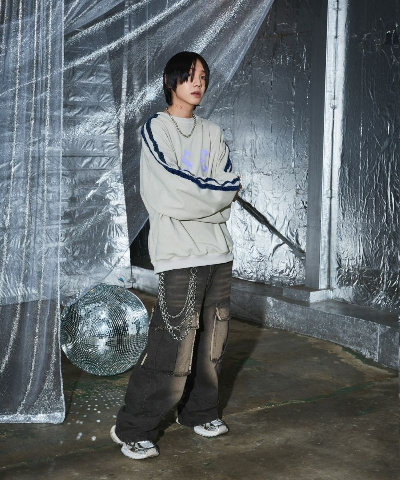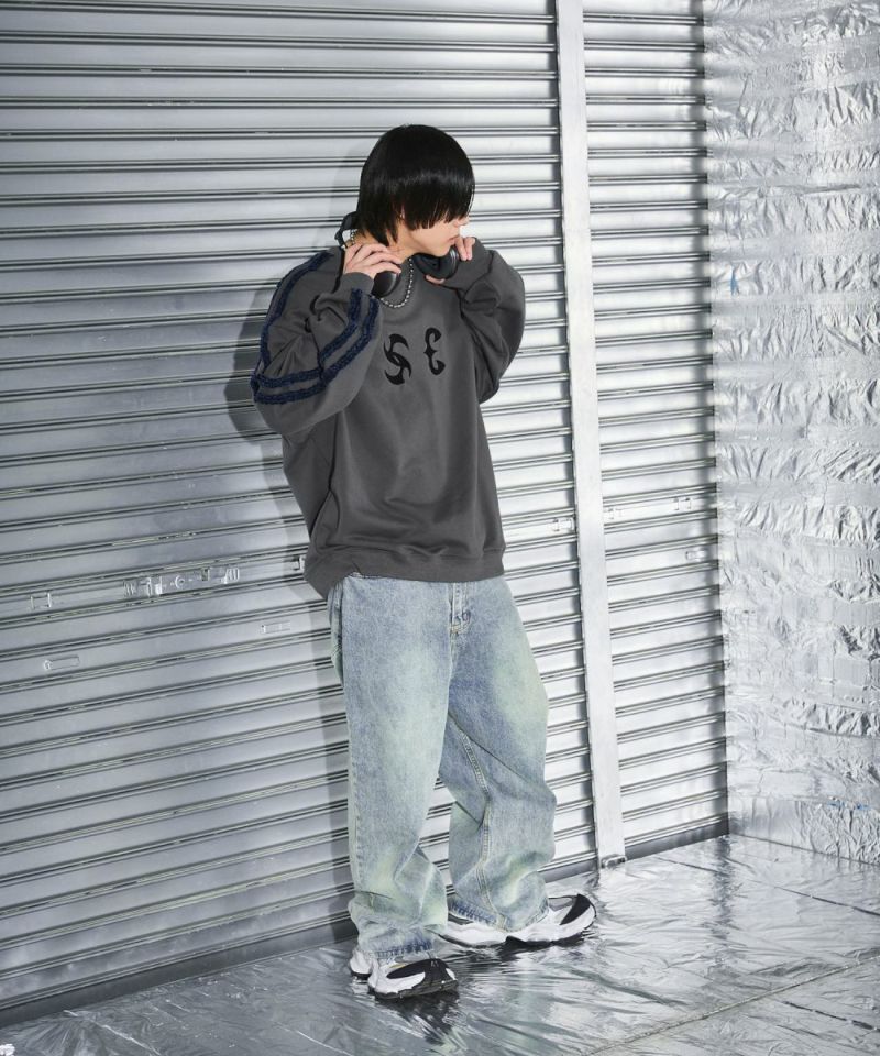 サイドのデニムフリンジラインが特徴のクルーネックスウェット。フロントにはメタルのロゴ刺繍が施しており、アクセントに。ややワイドな身幅&ドロップショルダーでリラックス感溢れるビッグシルエットで仕上げました。袖は大きくゆとりを持たせ、裾は程良くたまりができるバルーンシルエットのデザイン。着回しのしやすい、グレーとチャコールの2色展開。メンズ・レディース問わず着ていただけるユニセックス対応アイテムです。