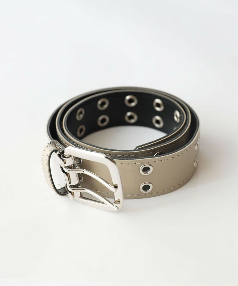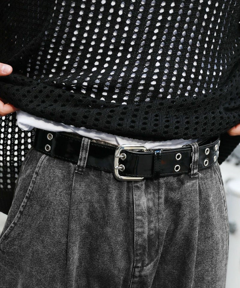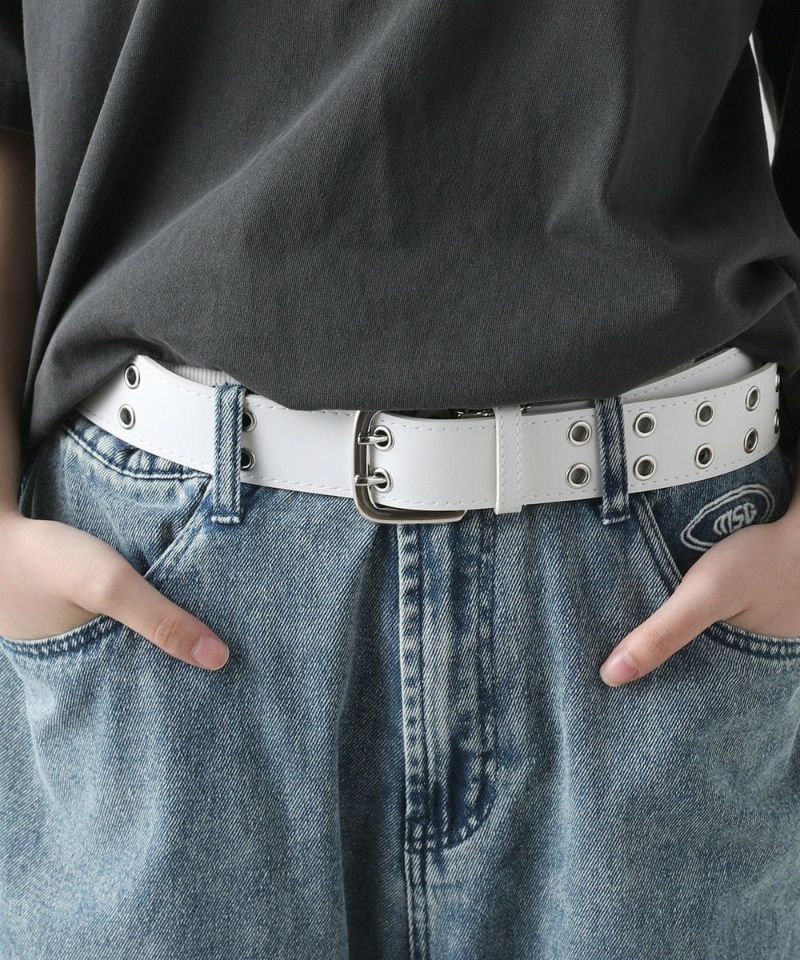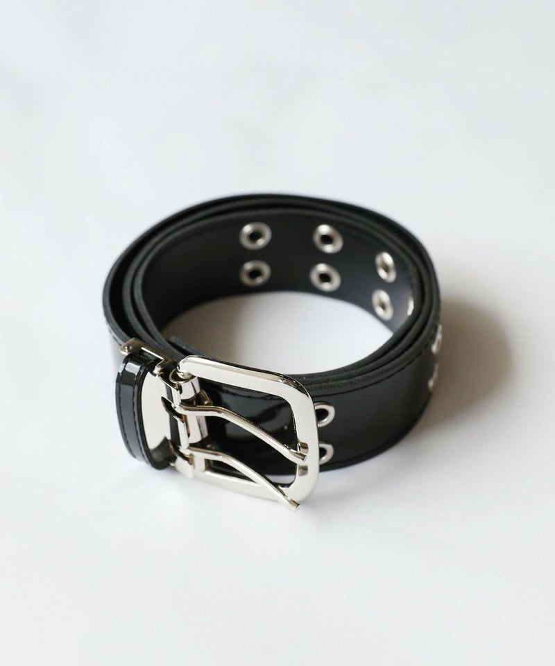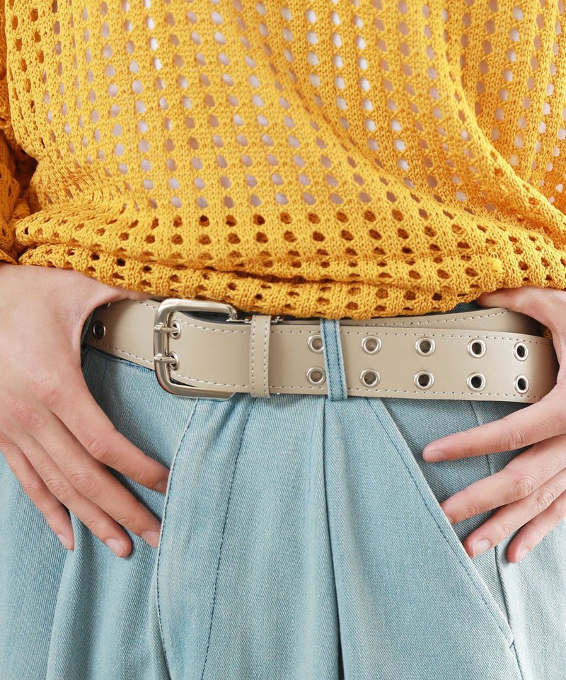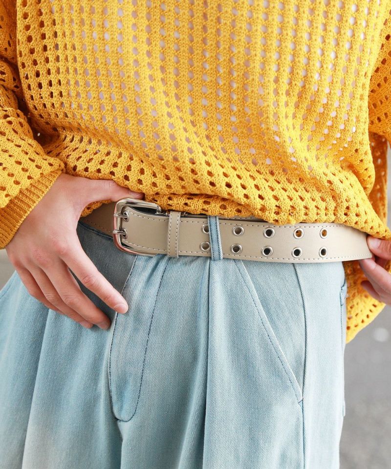 ダブルピンが存在感たっぷりな幅広のアイレットベルト。全面に配したアイレットで後ろ姿も抜かりなし。