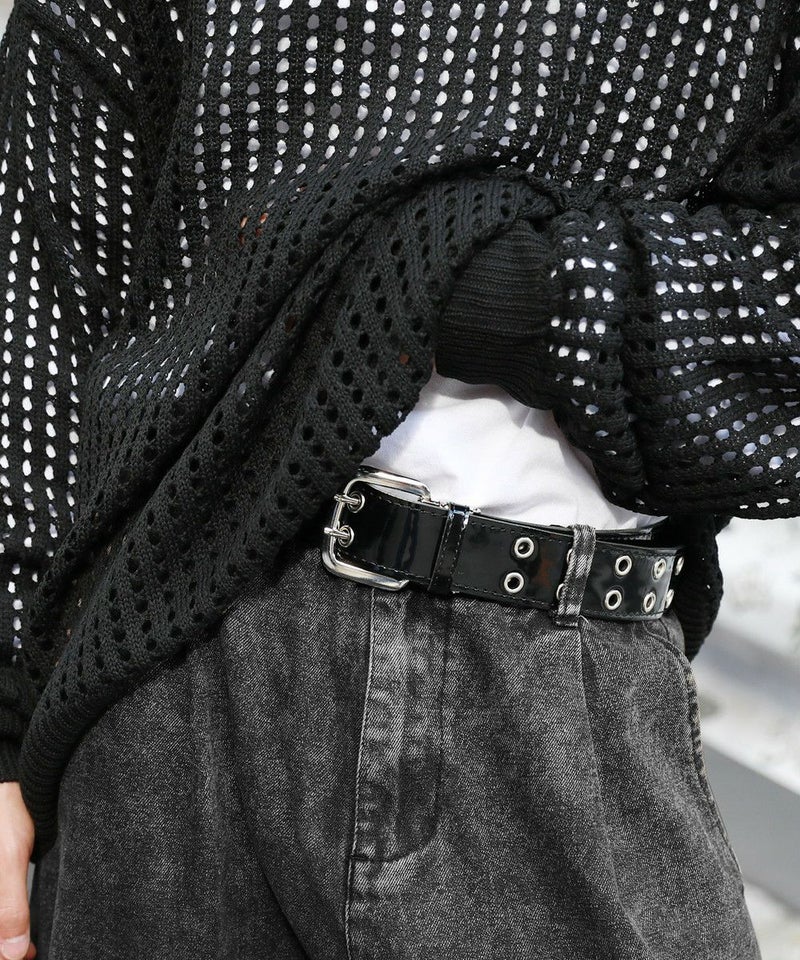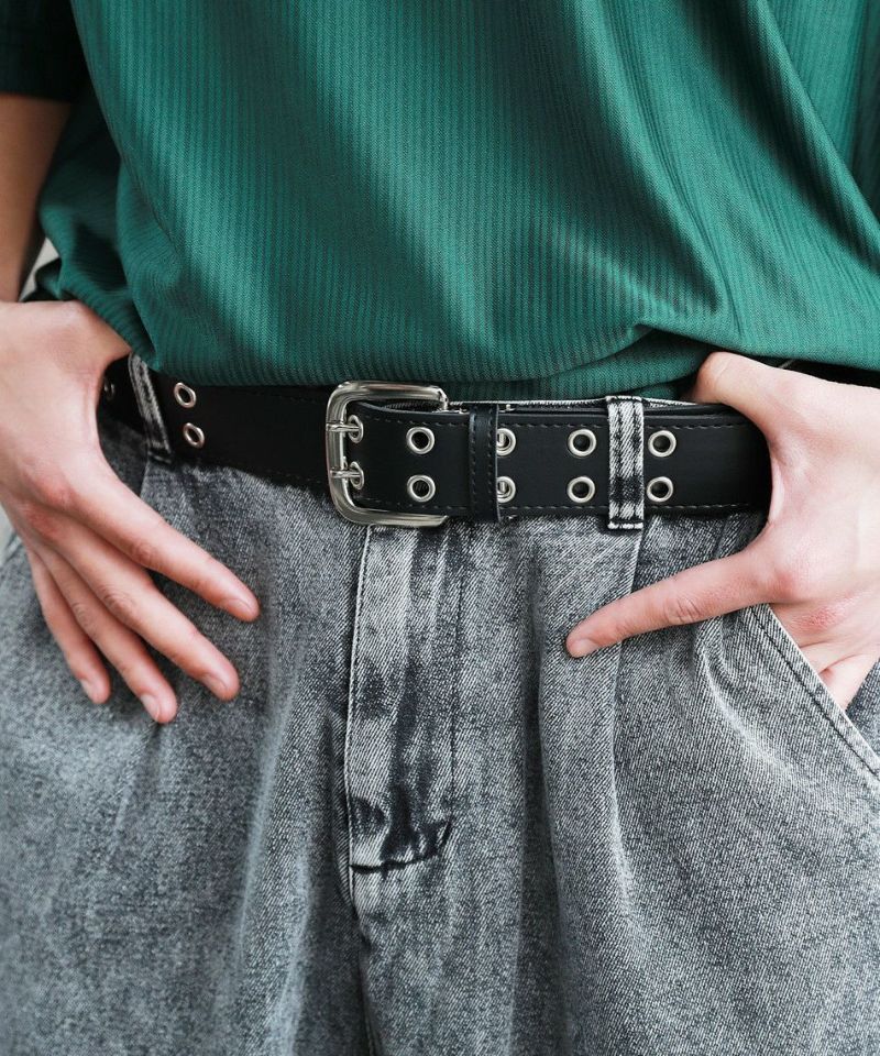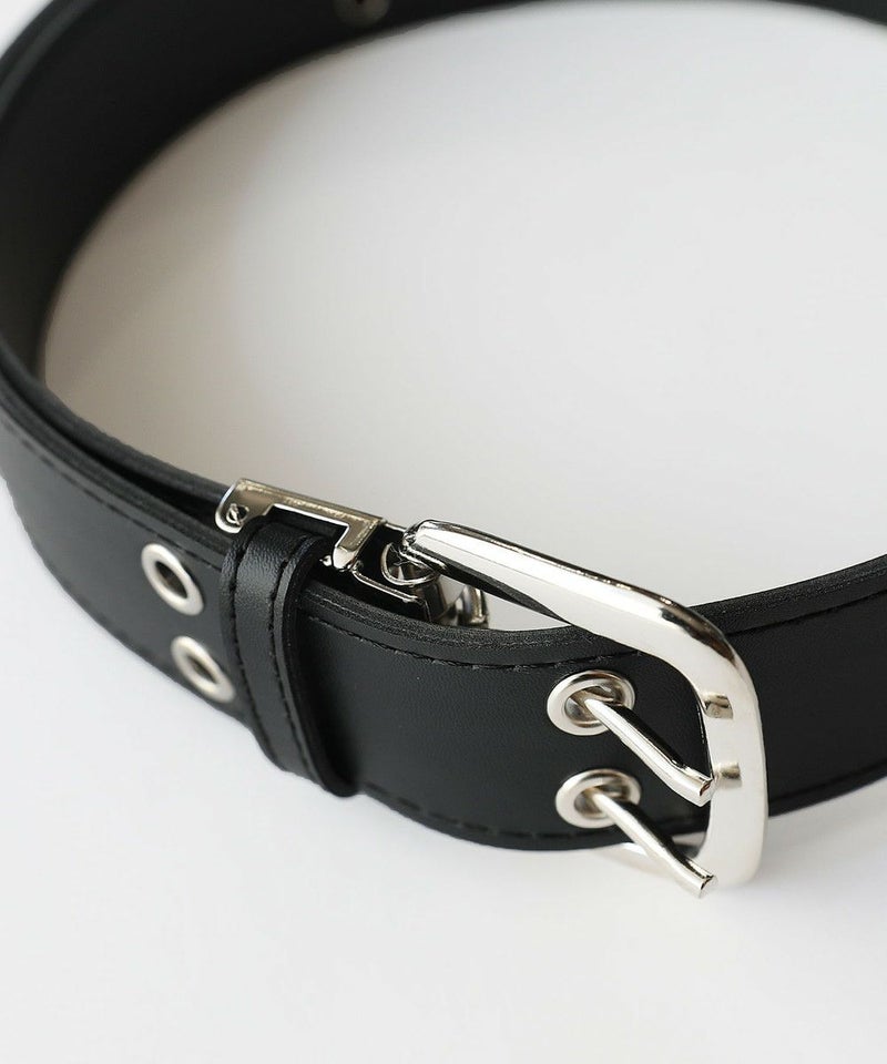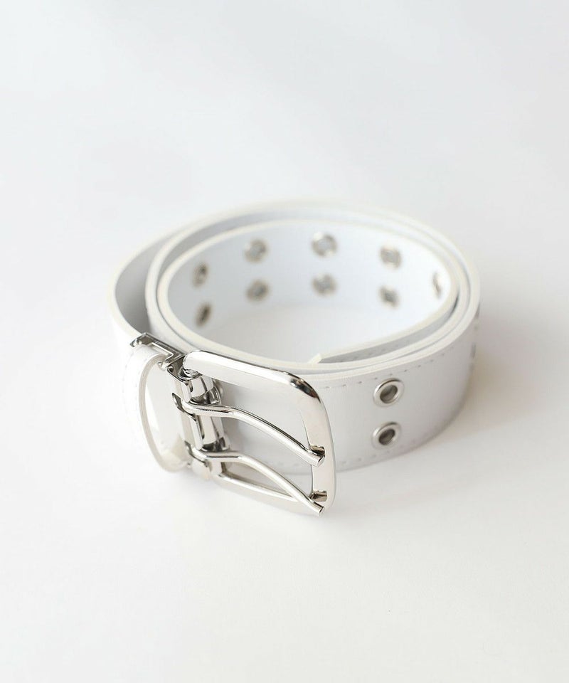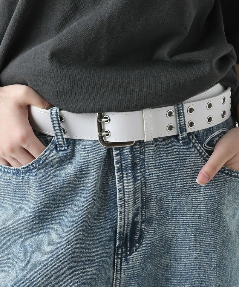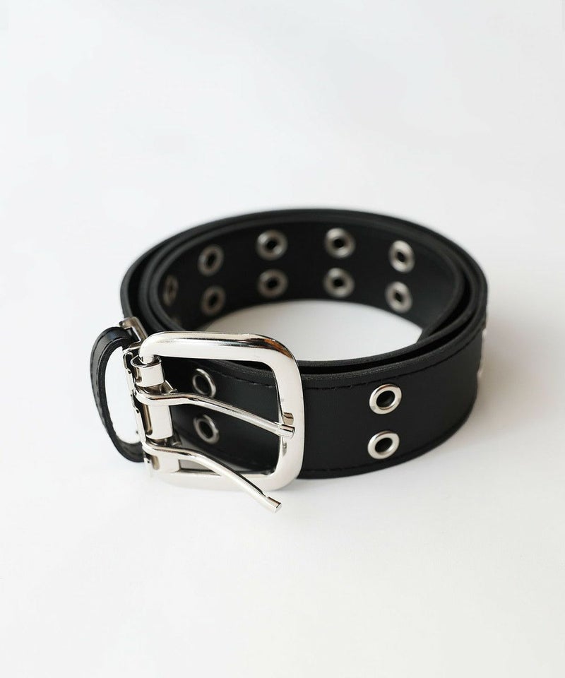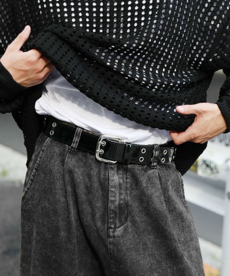 ダブルピンが存在感たっぷりな幅広のアイレットベルト。全面に配したアイレットで後ろ姿も抜かりなし。