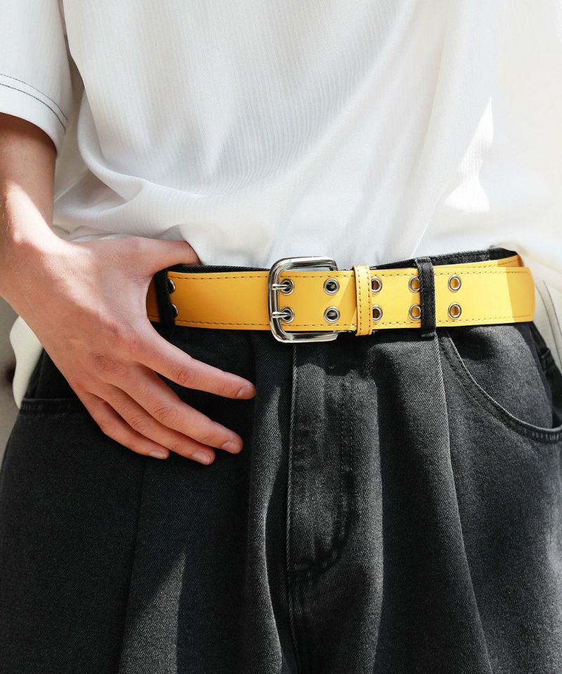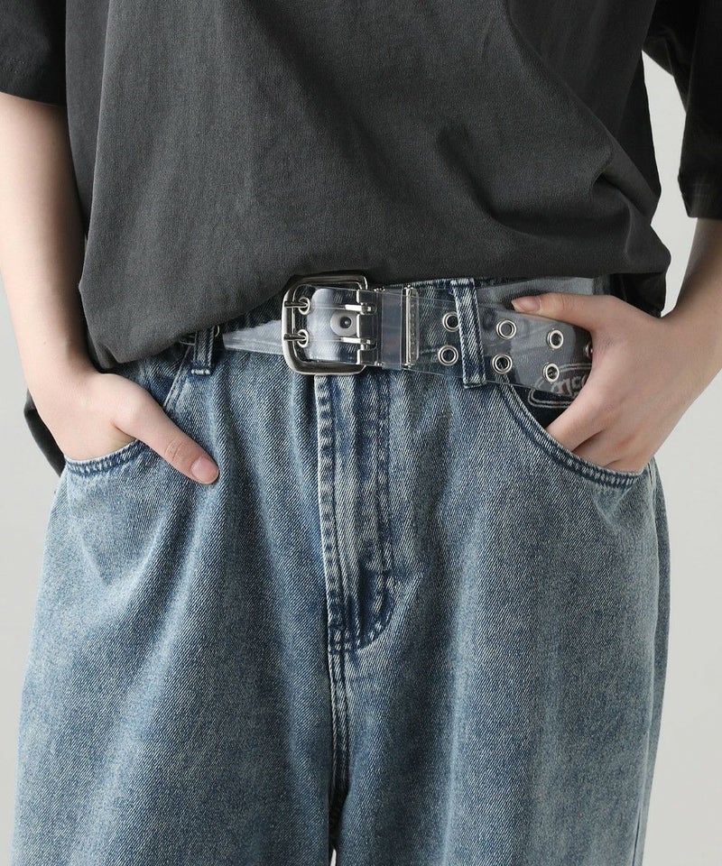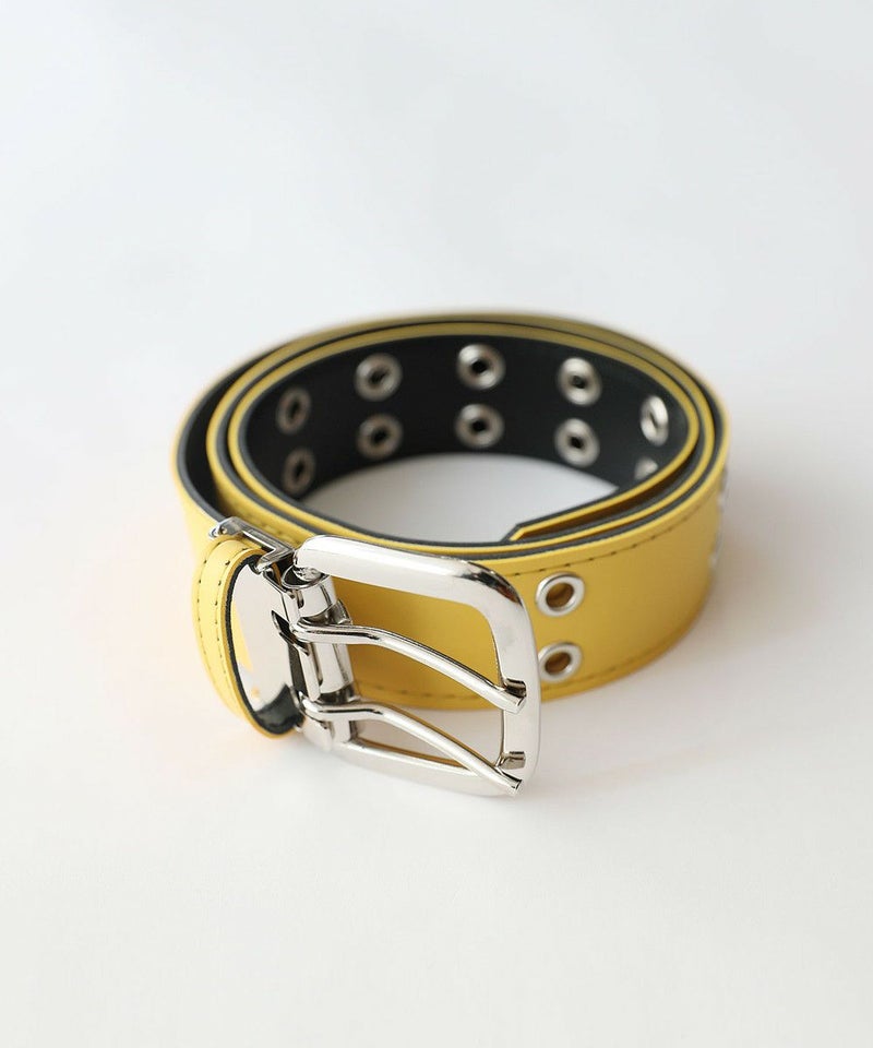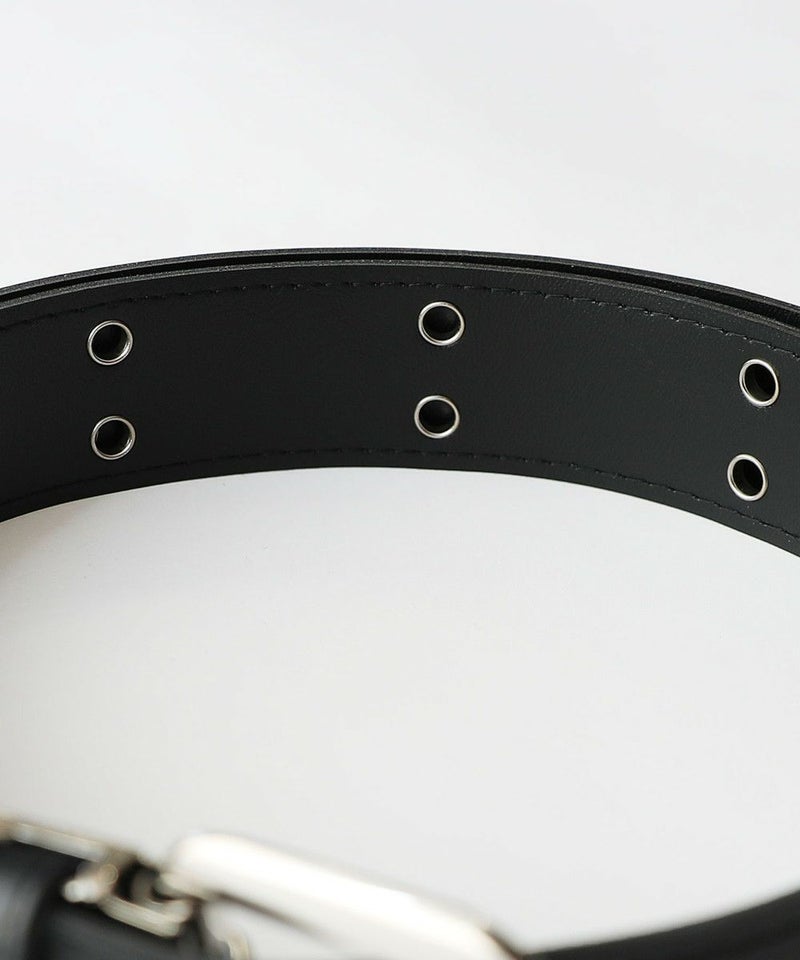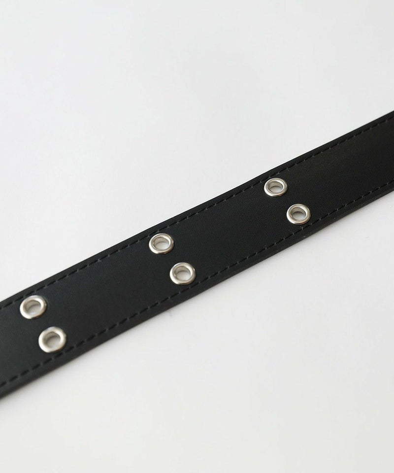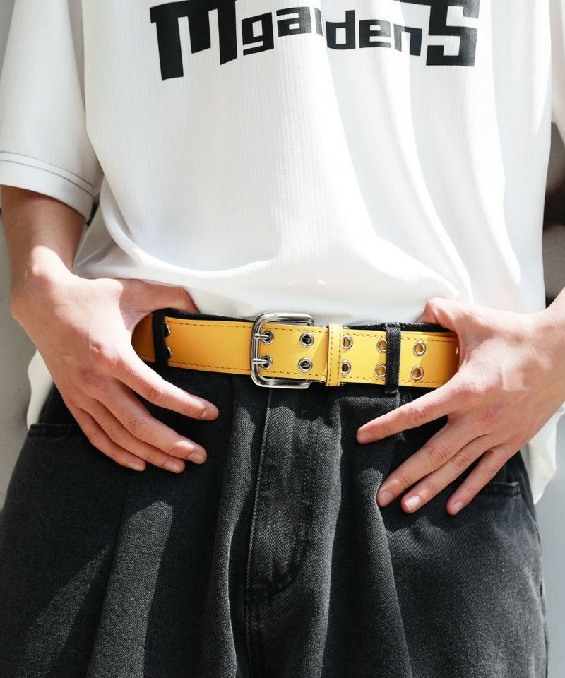 ダブルピンが存在感たっぷりな幅広のアイレットベルト。全面に配したアイレットで後ろ姿も抜かりなし。