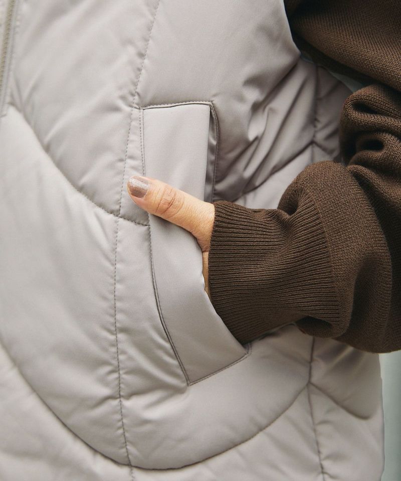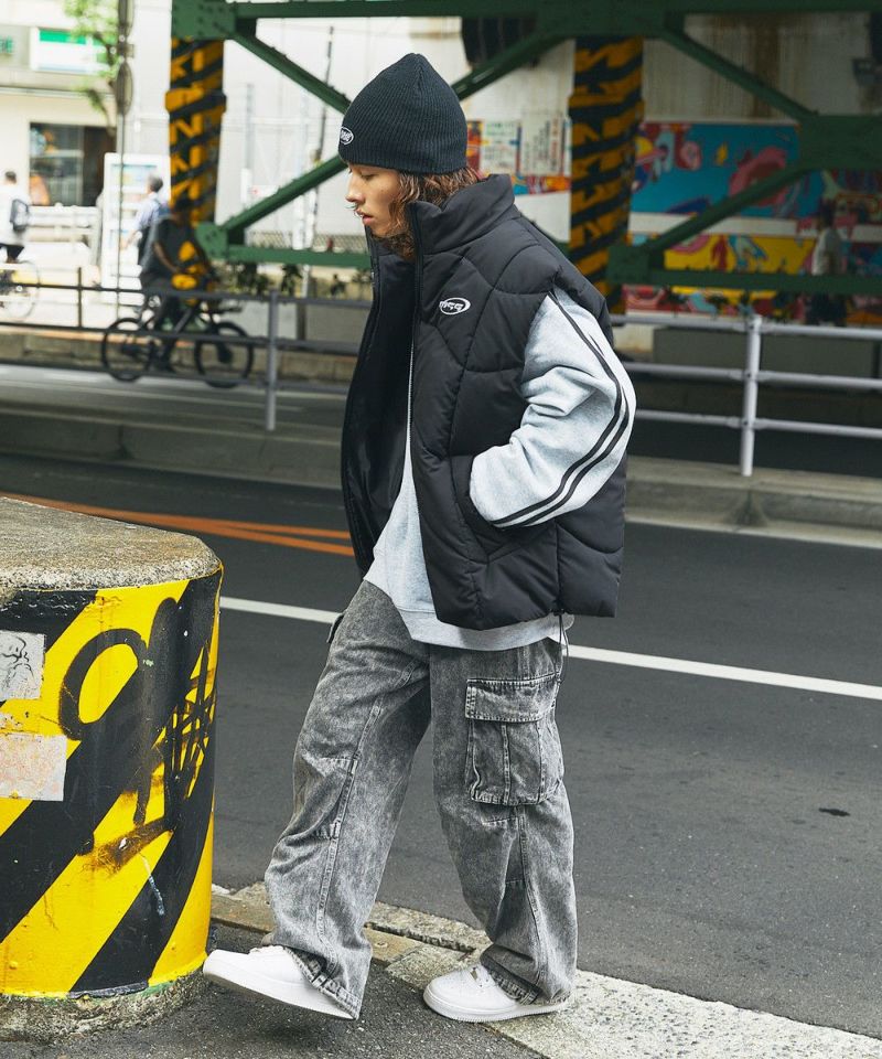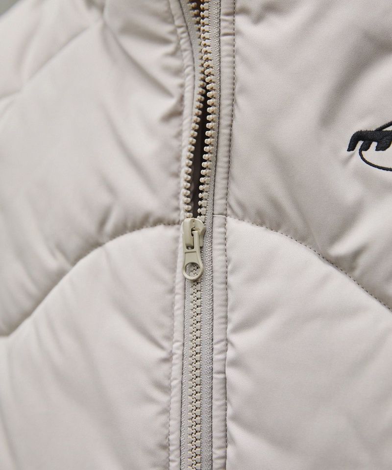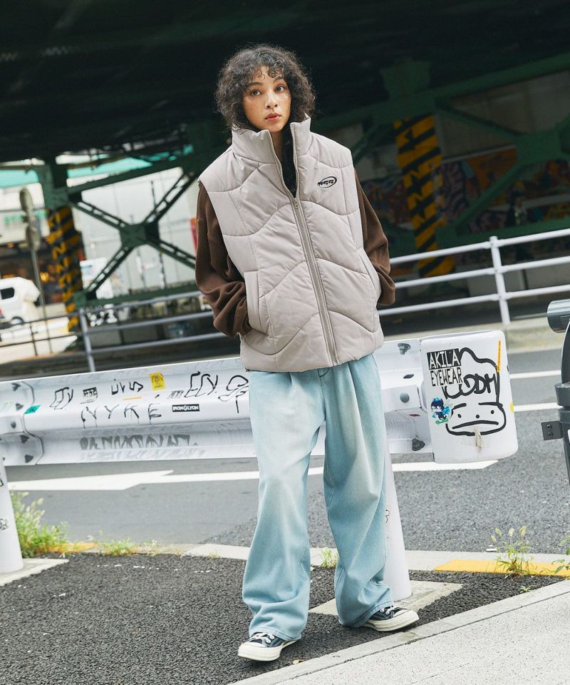 フロントジップ仕様の中綿キルティングベスト。中綿入りで温かさキープできるのはもちろん、波型のキルティングが目を引くデザインです。広めに取った身幅やゆとりのある腕ぐりなど、オーバーサイズに着こなせるベストは旬なムードでカジュアルスタイルにピッタリ。首元はジップアップすればハイネック仕様になり、防寒性も抜群。左胸のブランドロゴ刺繍がさり気ないアクセントになり、着こなしのワンポイントになります。どんなアイテムとも合わせやすいベーシックなブラック、チャコール、ネイビーに、ニュアンスカラーのライトカーキ、グレージュを合わせた5色展開。ユニセックスで着用可能なので、男女問わず手軽に旬のコーディネートが楽しめるアイテムです。