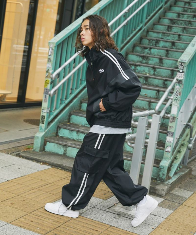 ストリートや旬な古着ミックスコーデと相性抜群。インナーには、Tシャツやカットソー、肌寒い時期にはスウェットやパーカーを合わせるのが◎。シンプルな配色なため、ワイドパンツを合わせたり、アクセサリーなどの小物をプラスしてもバランス良くキマります。ラインの入ったカーゴパンツを穿いてセットアップコーデもおすすめです。