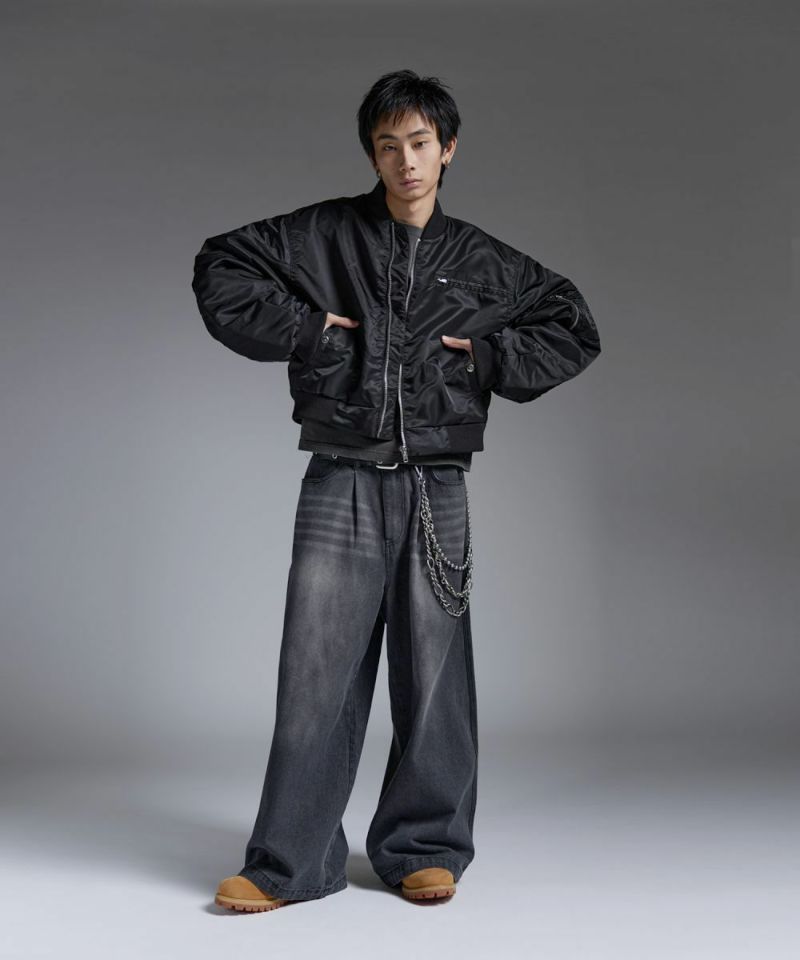 ・ボトムにはワイドめのデニムやスウェットパンツを合わせると今っぽいスタイリングが完成します。