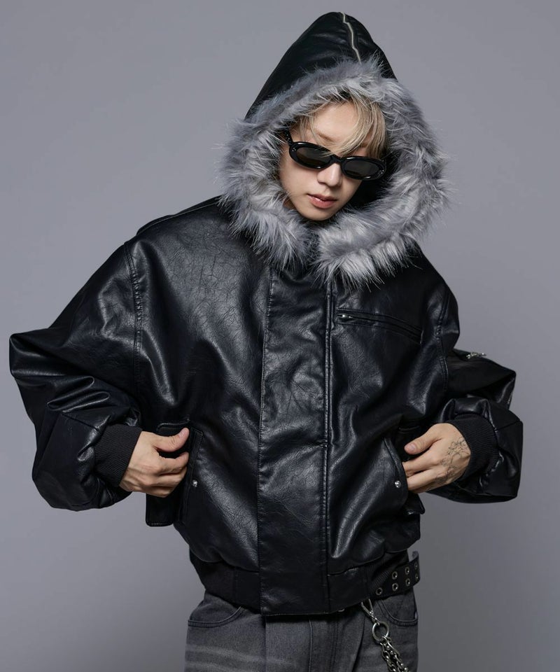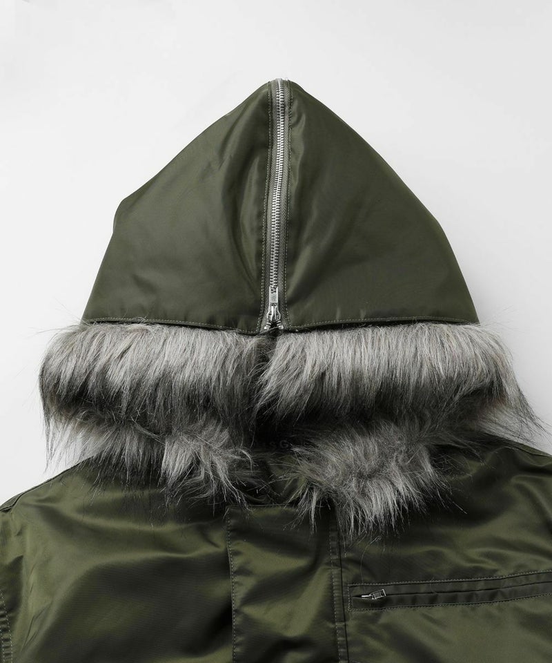 ・また取り外しの可能なファーを取り付け、開閉のできるジッパー付きの大きめのフードが特徴的な一着。