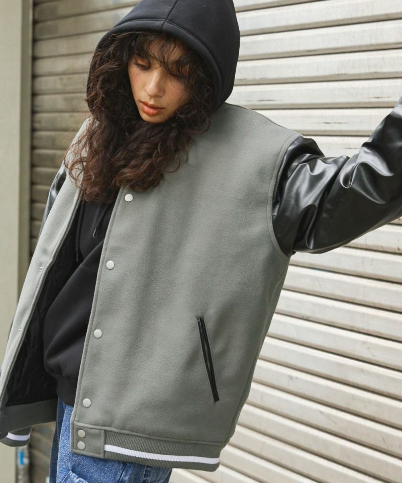 ボディは厚手のメルトン、袖はPUレザーの切り替えデザインのスタジャン。スタジャン本来のクラッシックかつストリートな雰囲気をキープしつつ、オーバーサイズで現代のニーズに合った一着です。袖と裾はラインリブ仕様で丸みのあるバルーンシルエットが魅力的なアイテムです。肩を落としたビッグシルエットとたっぷりのアームホールで、パーカーやニットなど厚手のインナーもゆったりと合わせられます。裏地が中綿入りのキルティングなので保温性に優れており、真冬にも対応できる本格アウターです。S〜XLサイズの幅広いサイズ展開で女性にもおすすめなユニセックスアイテムです。