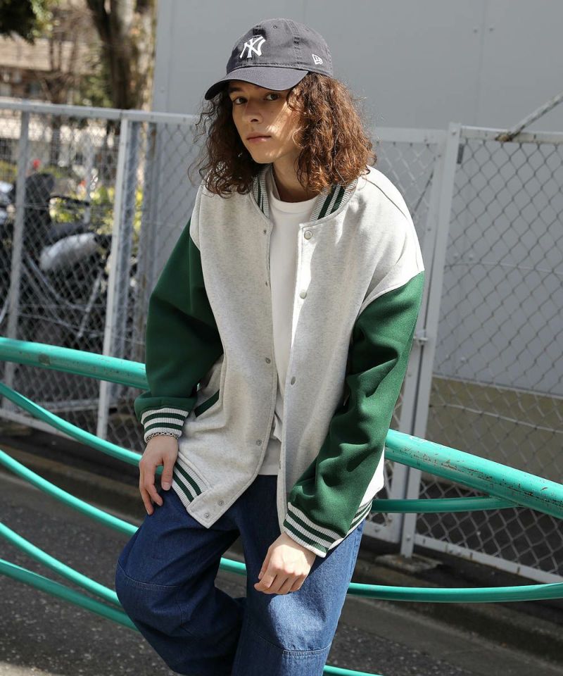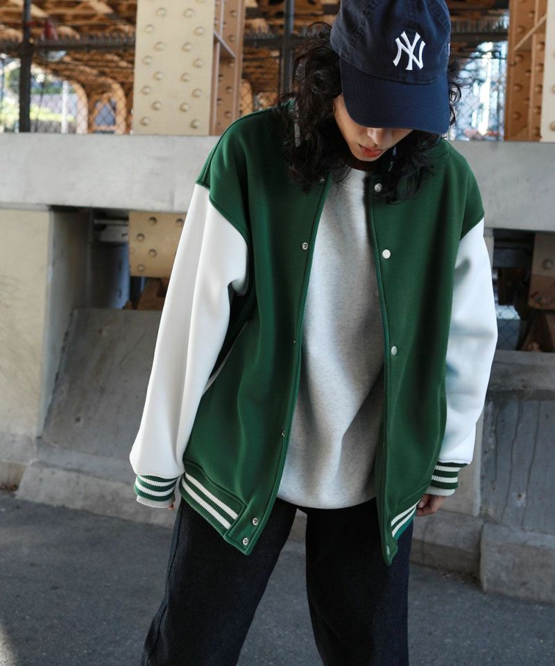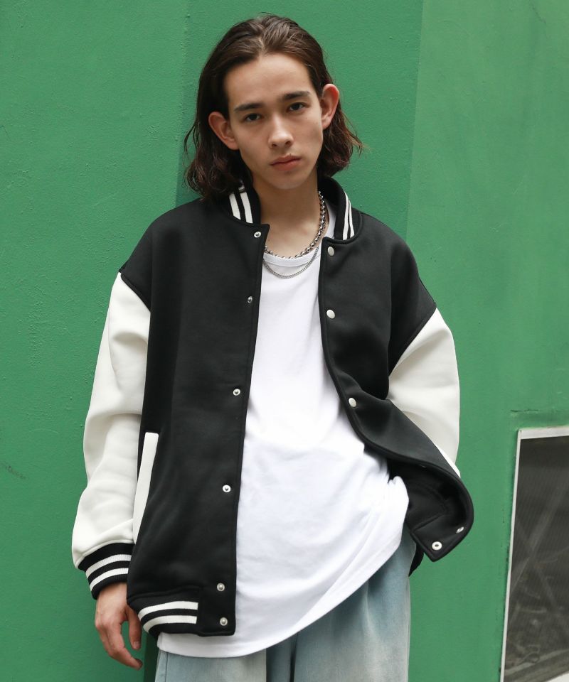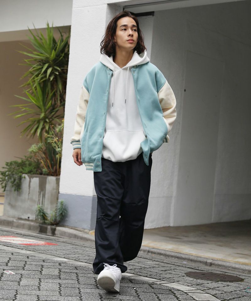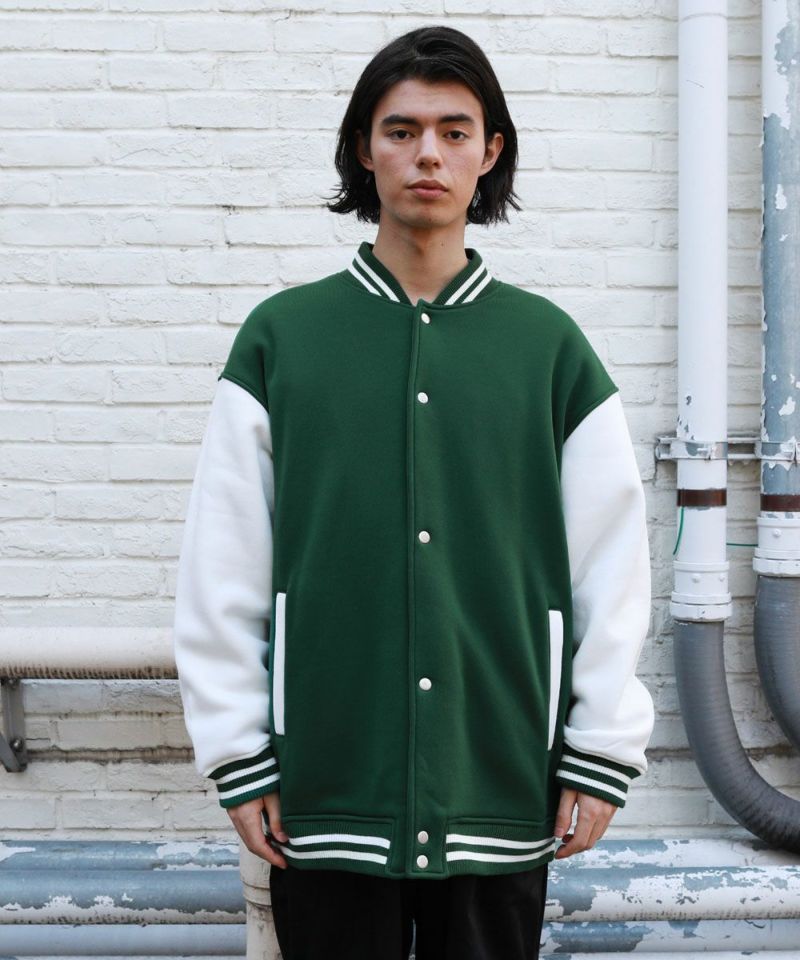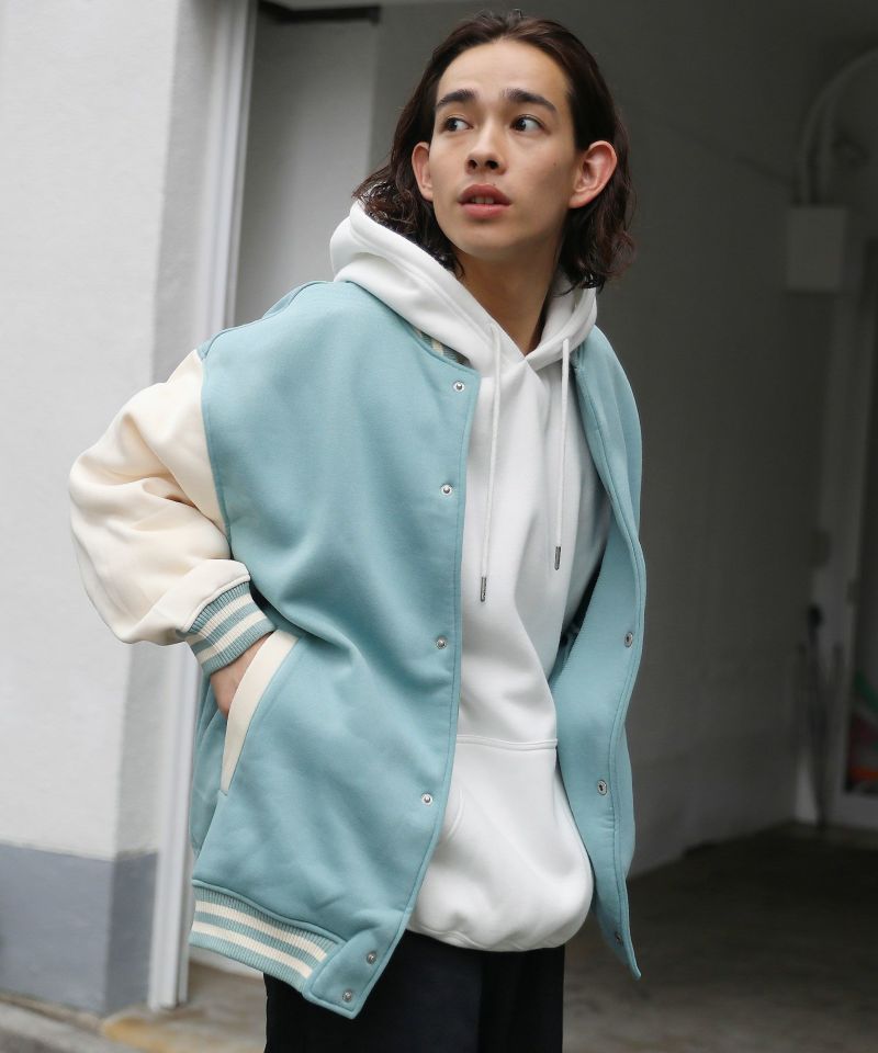 厚手の裏起毛スウェットを使用したスタジャン。オーバーサイズで現代のニーズに合った絶妙なサイジングとスウェット生地を用いることでプルオーバー感覚で使える着やすさで汎用性の高い1着です。生地にしっかりとした厚みとハリがあるので、着用時にボリュームのあるシルエットになるのがポイント。着回しのしやすい無駄のないデザインながら、袖の切替やリブ部分のラインなどストリート感が特徴的です。