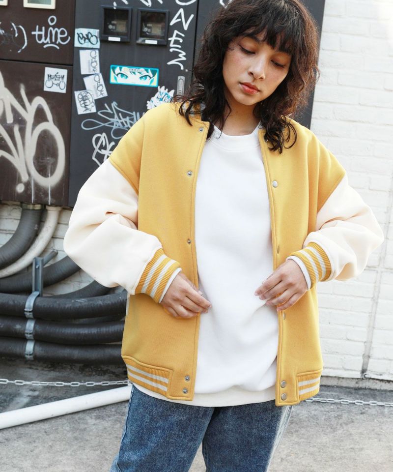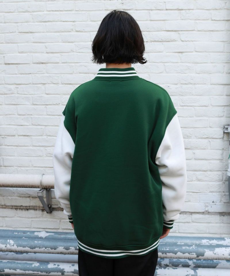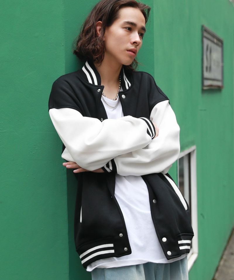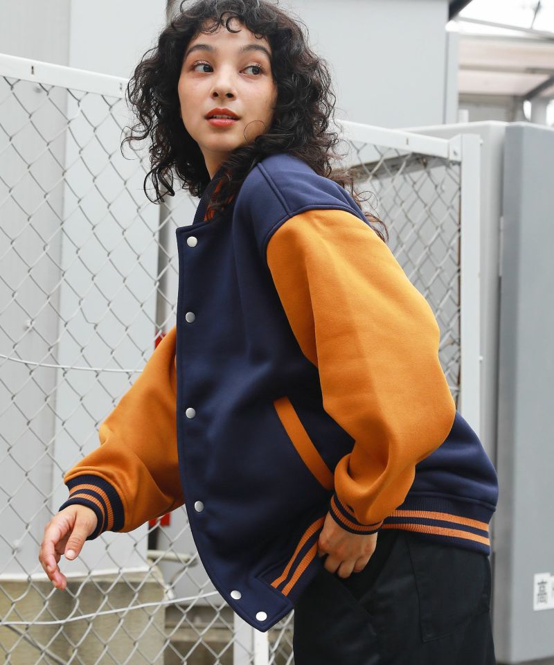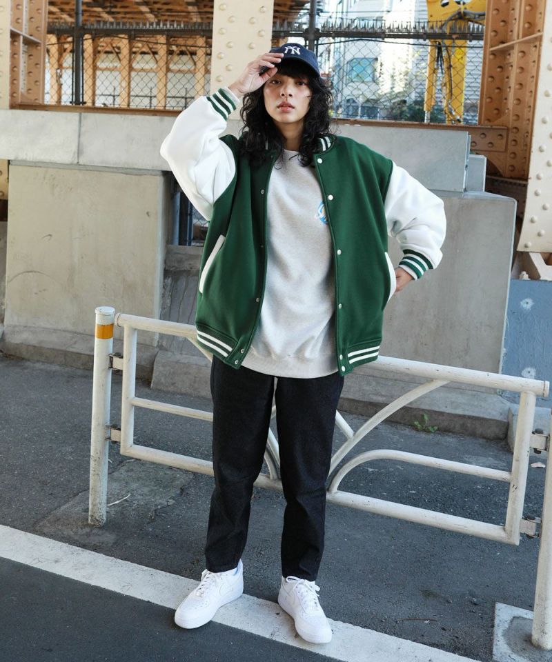 厚手の裏起毛スウェットを使用したスタジャン。オーバーサイズで現代のニーズに合った絶妙なサイジングとスウェット生地を用いることでプルオーバー感覚で使える着やすさで汎用性の高い1着です。生地にしっかりとした厚みとハリがあるので、着用時にボリュームのあるシルエットになるのがポイント。着回しのしやすい無駄のないデザインながら、袖の切替やリブ部分のラインなどストリート感が特徴的です。