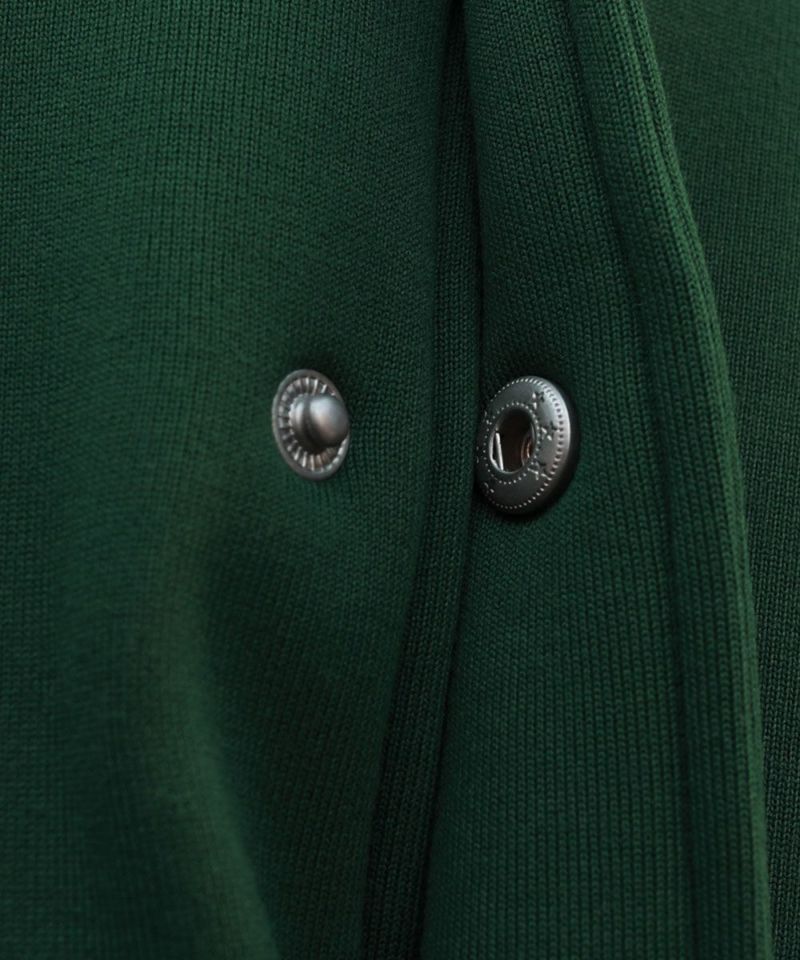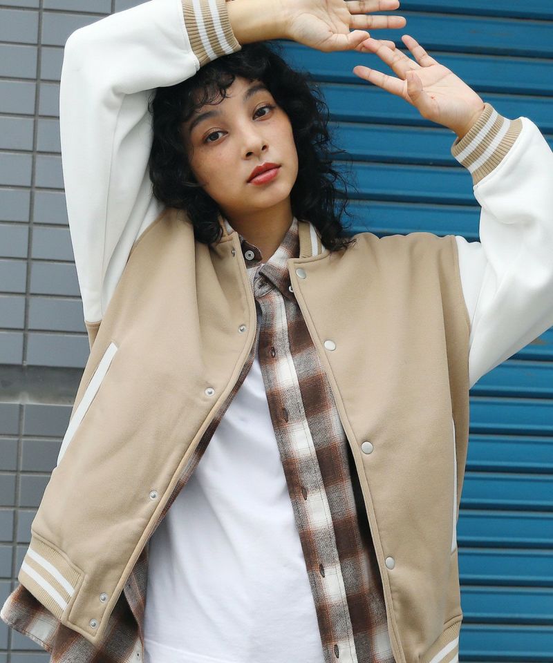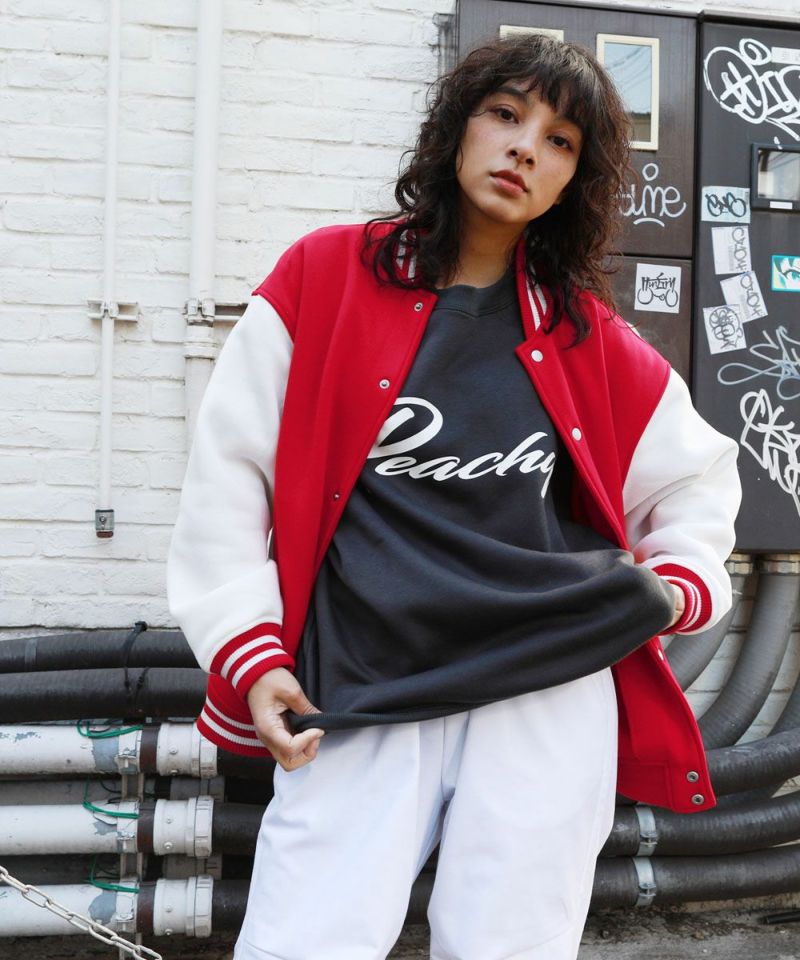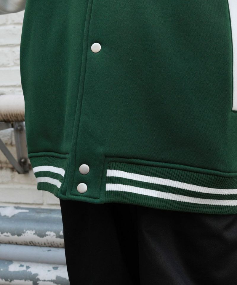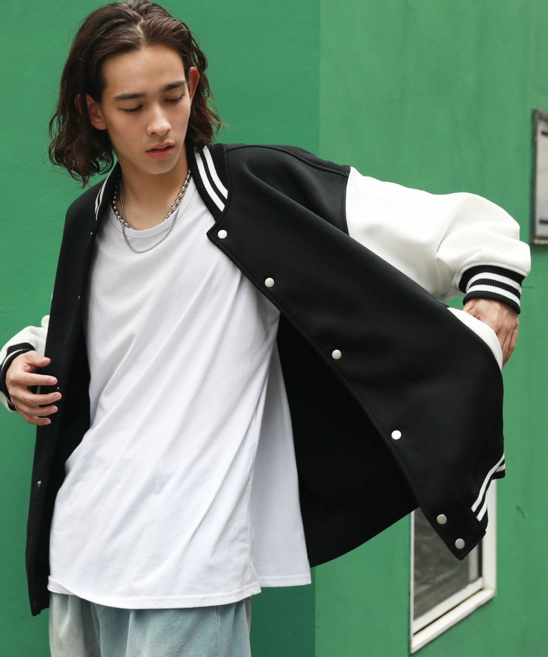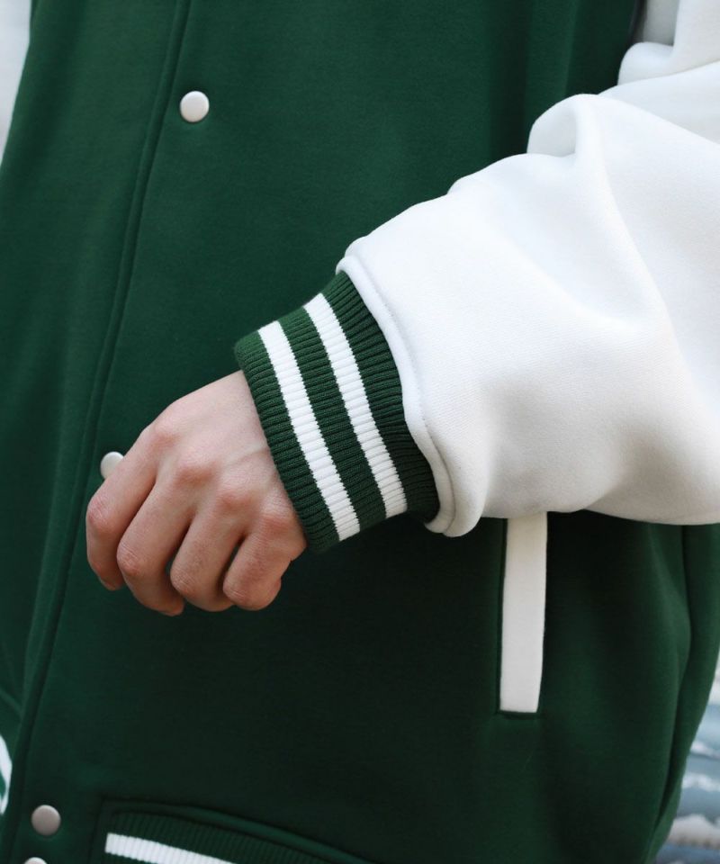 厚手の裏起毛スウェットを使用したスタジャン。オーバーサイズで現代のニーズに合った絶妙なサイジングとスウェット生地を用いることでプルオーバー感覚で使える着やすさで汎用性の高い1着です。生地にしっかりとした厚みとハリがあるので、着用時にボリュームのあるシルエットになるのがポイント。着回しのしやすい無駄のないデザインながら、袖の切替やリブ部分のラインなどストリート感が特徴的です。