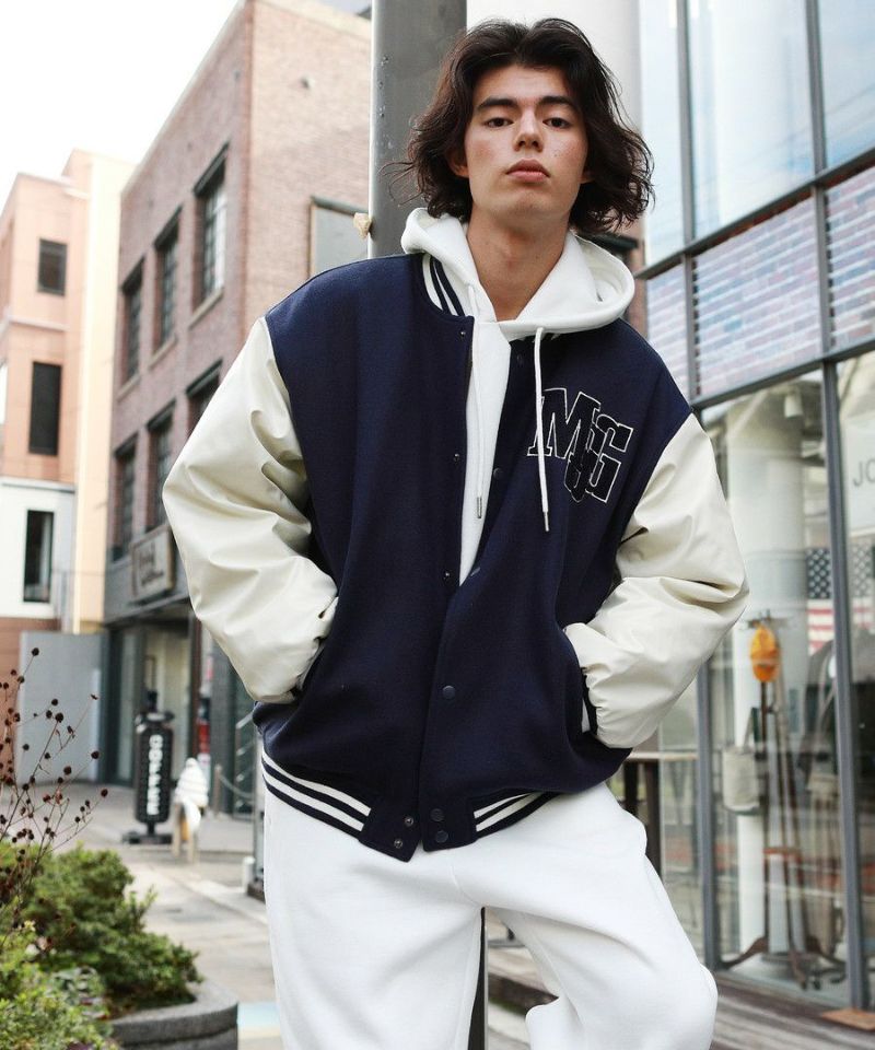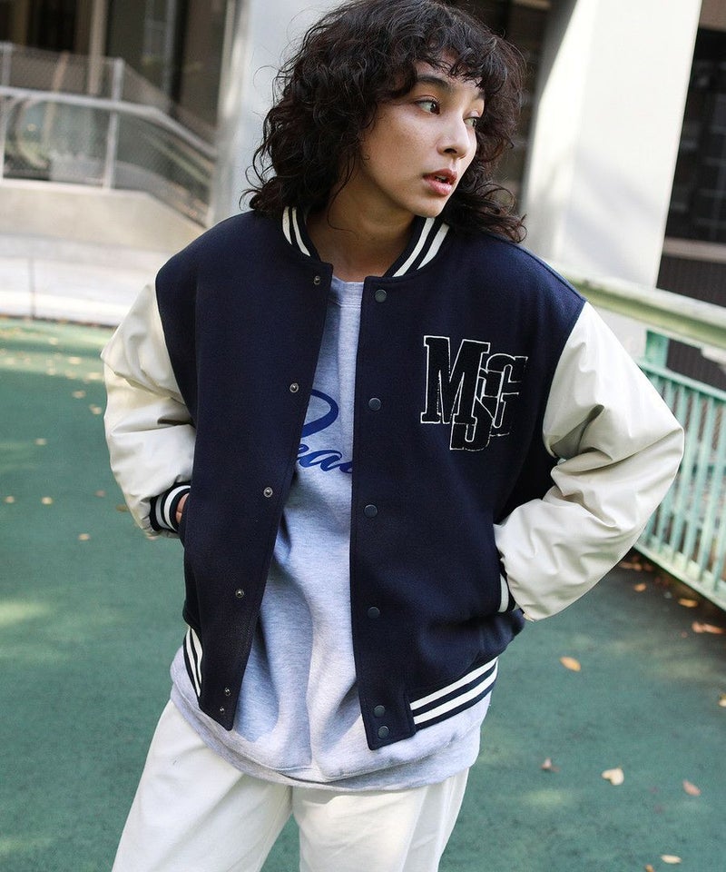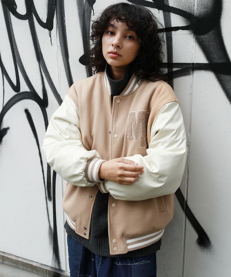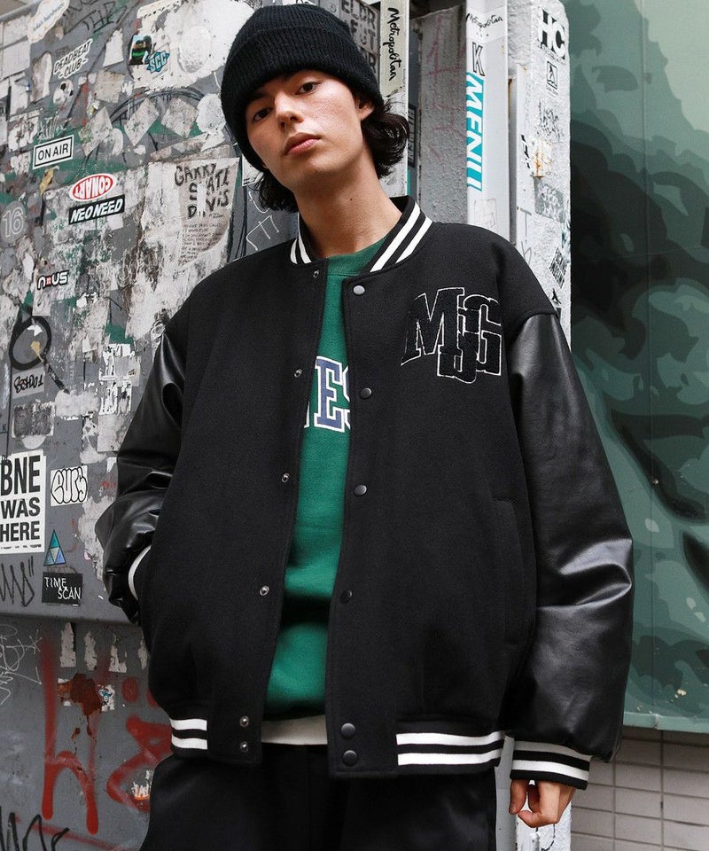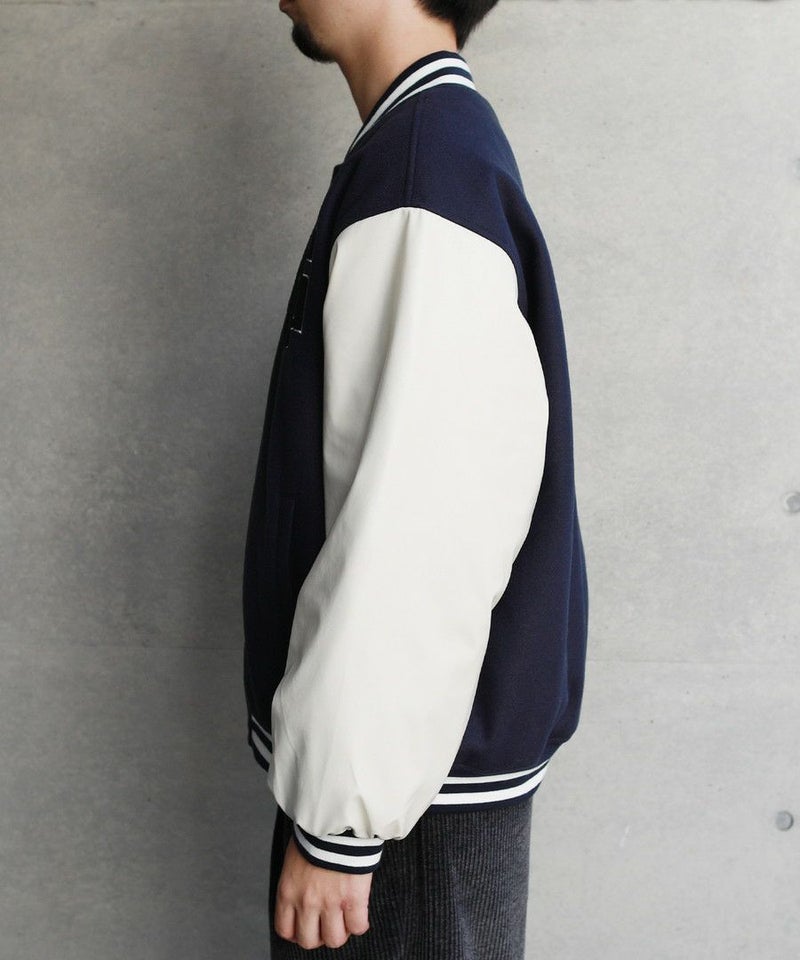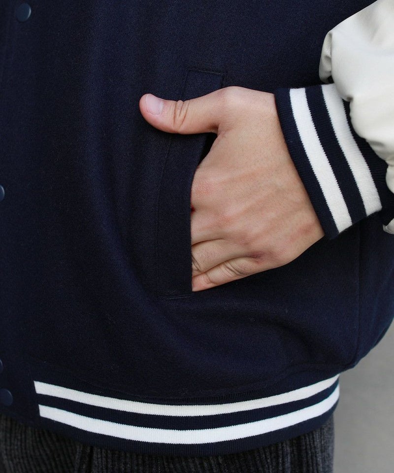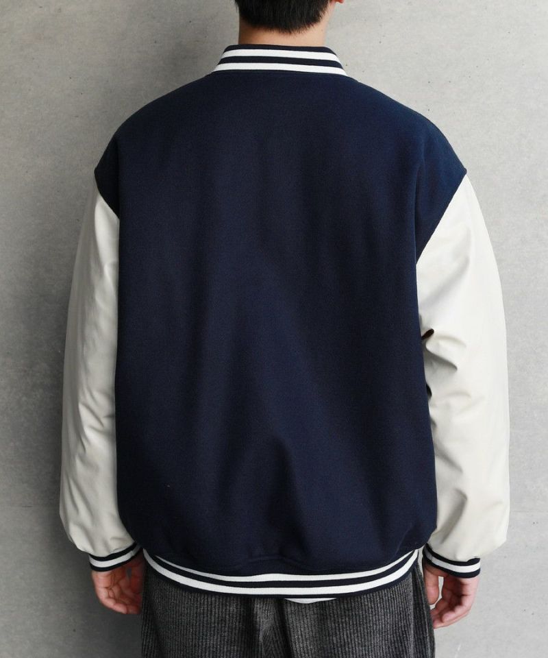 ボディはメルトン、袖はPUレザーの切り替えデザインのスタジャン。オーバーサイズで現代のニーズに合った絶妙なサイジングながらスタジャン本来のクラッシックかつストリートな雰囲気が魅力の1枚。胸元のロゴサガラワッペンが着こなしのアクセントに。袖と裾はラインリブ仕様で丸みのあるバルーンシルエットが魅力。裏地がキルティングなので保温性に優れており、真冬にも対応できる本格アウターです。