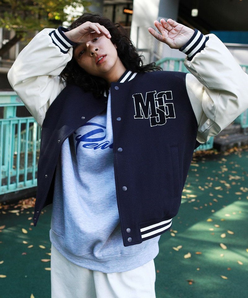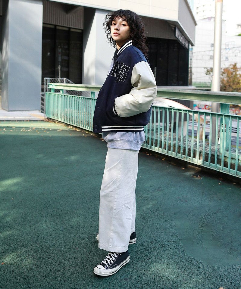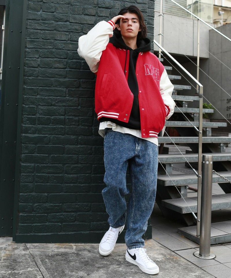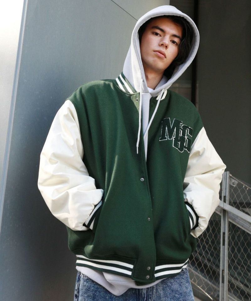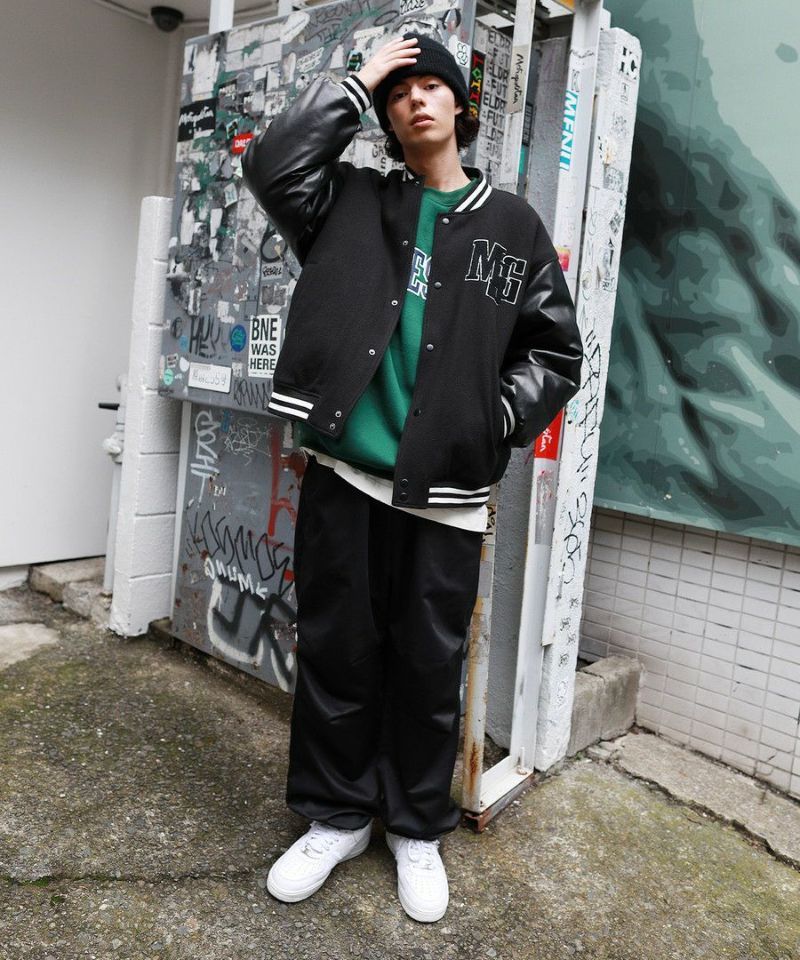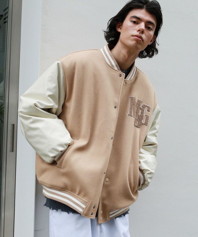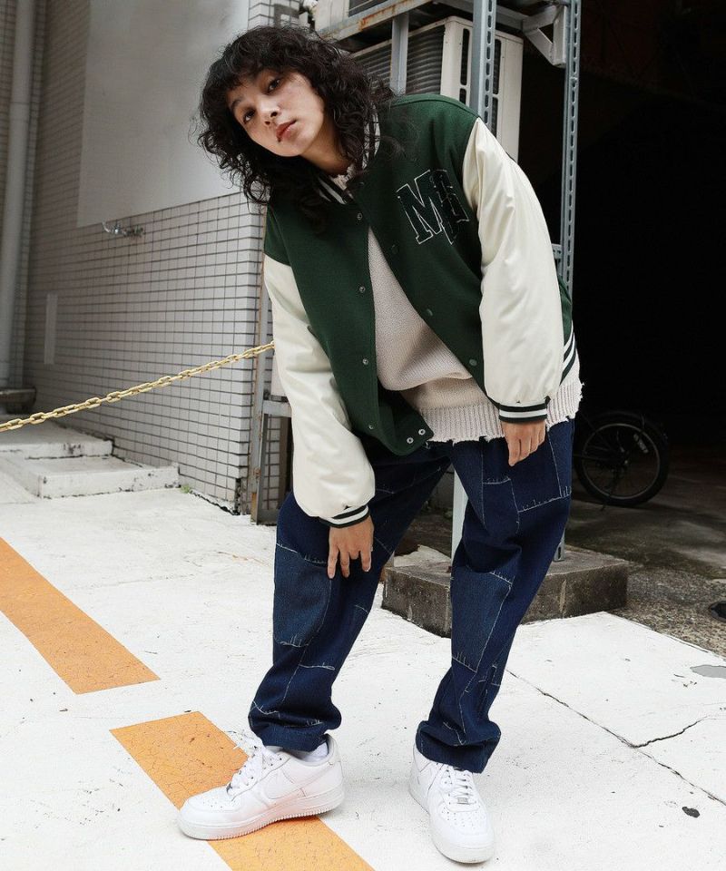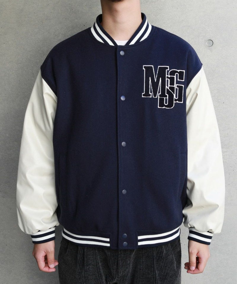 ボディはメルトン、袖はPUレザーの切り替えデザインのスタジャン。オーバーサイズで現代のニーズに合った絶妙なサイジングながらスタジャン本来のクラッシックかつストリートな雰囲気が魅力の1枚。胸元のロゴサガラワッペンが着こなしのアクセントに。袖と裾はラインリブ仕様で丸みのあるバルーンシルエットが魅力。裏地がキルティングなので保温性に優れており、真冬にも対応できる本格アウターです。