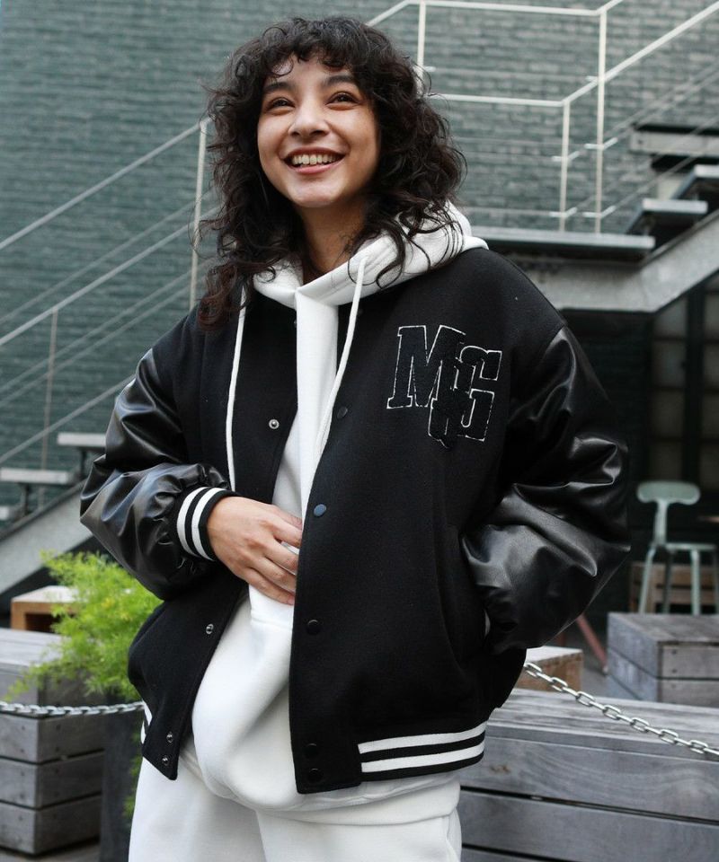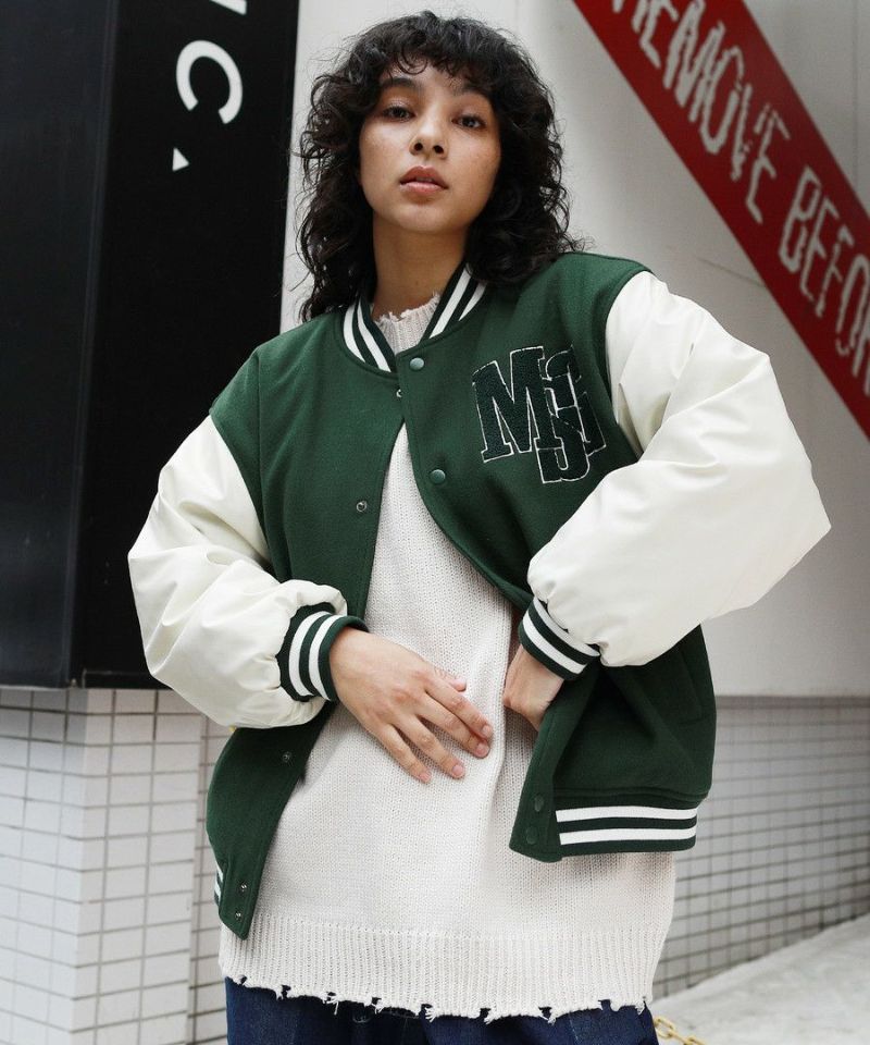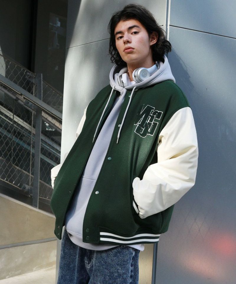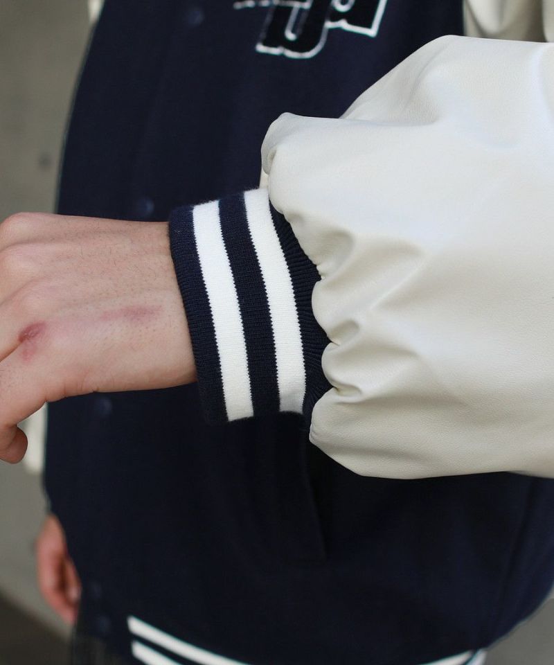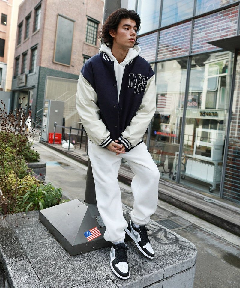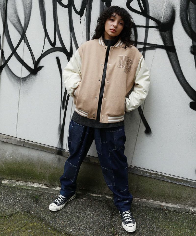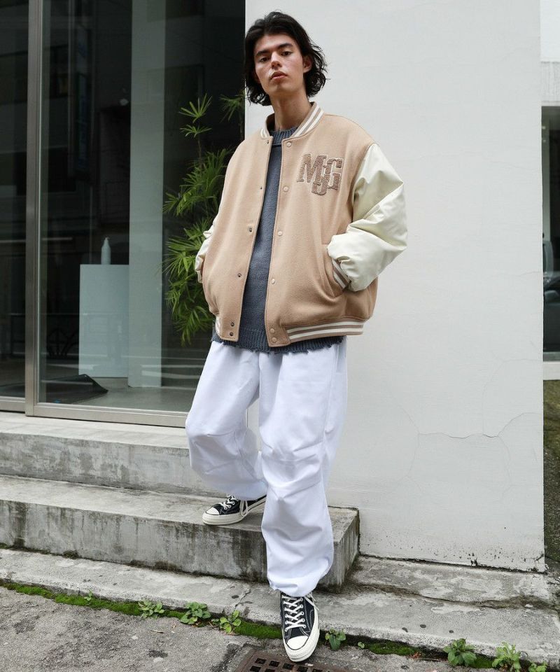 ボディはメルトン、袖はPUレザーの切り替えデザインのスタジャン。オーバーサイズで現代のニーズに合った絶妙なサイジングながらスタジャン本来のクラッシックかつストリートな雰囲気が魅力の1枚。胸元のロゴサガラワッペンが着こなしのアクセントに。袖と裾はラインリブ仕様で丸みのあるバルーンシルエットが魅力。裏地がキルティングなので保温性に優れており、真冬にも対応できる本格アウターです。