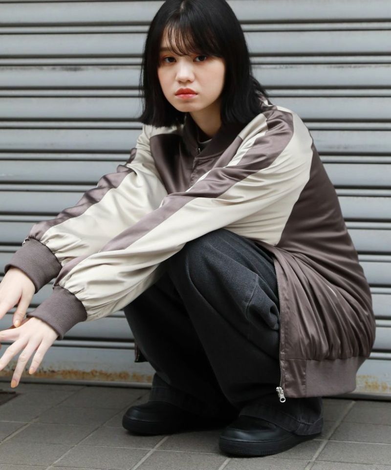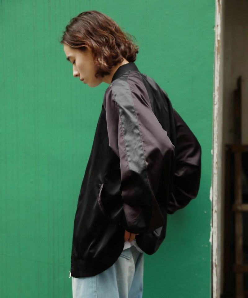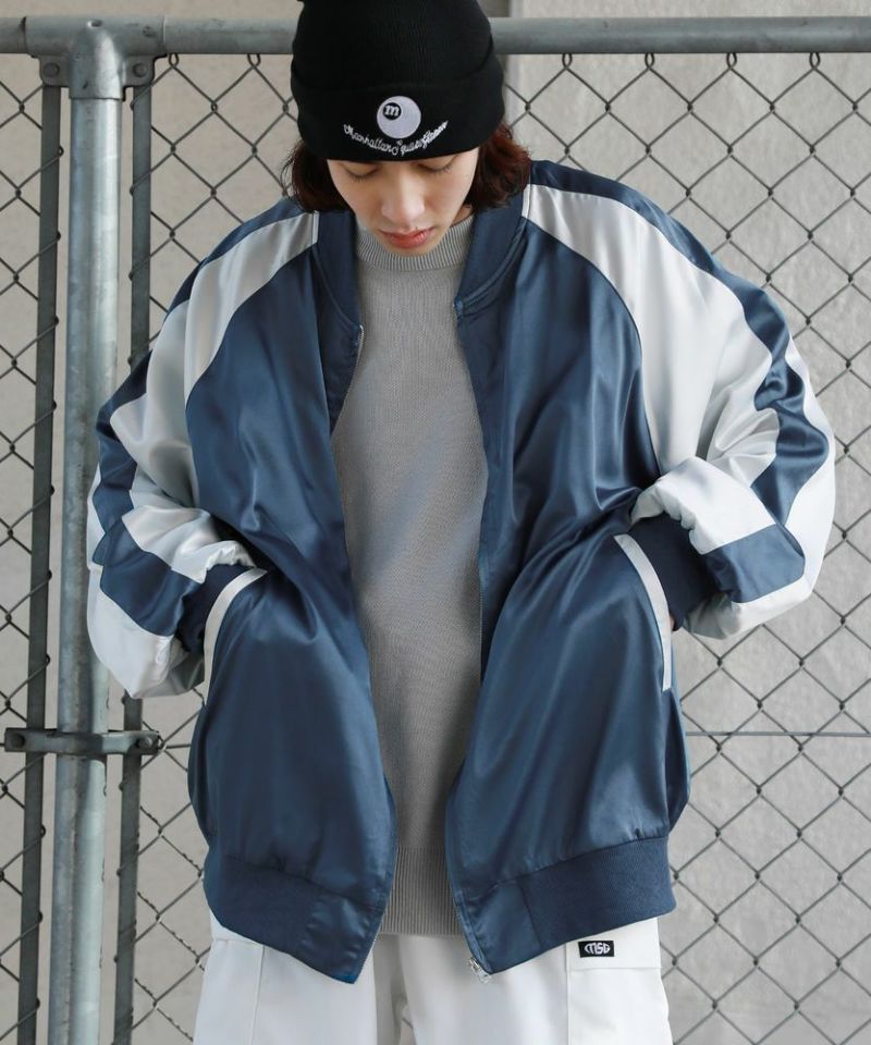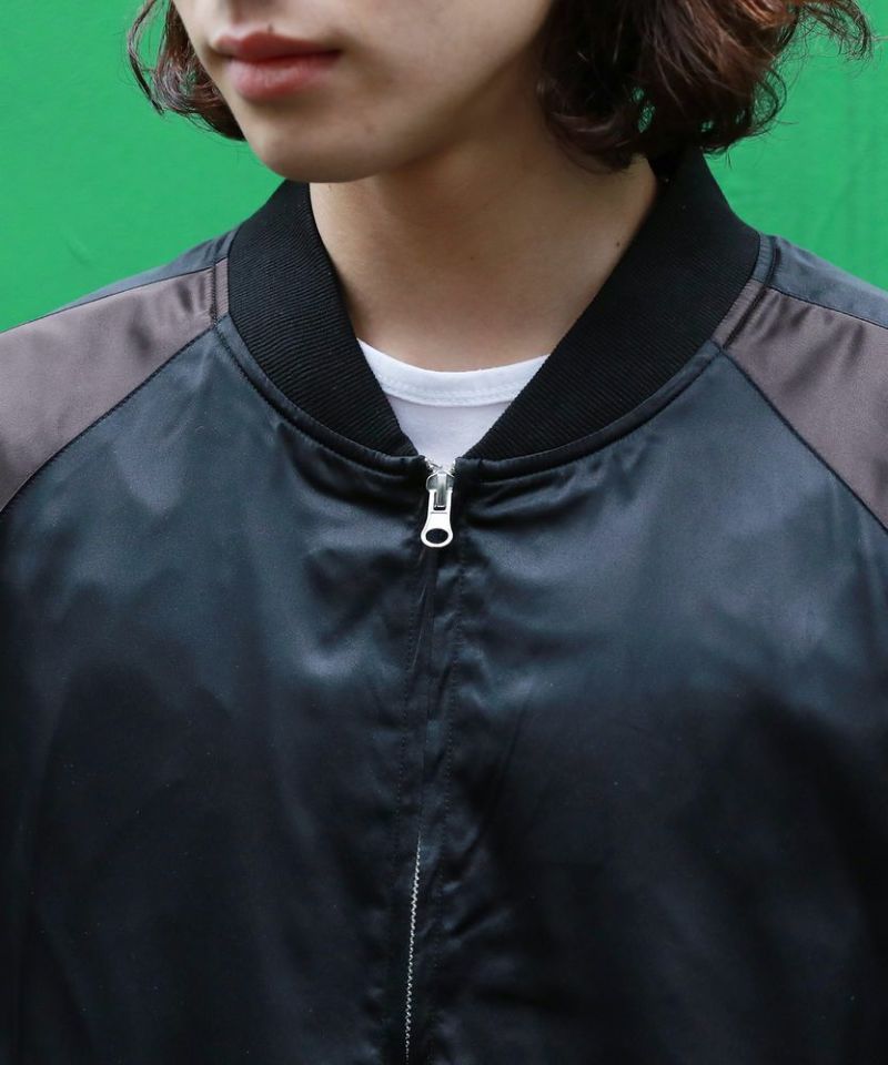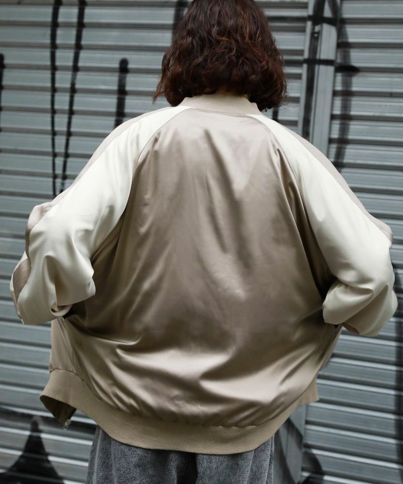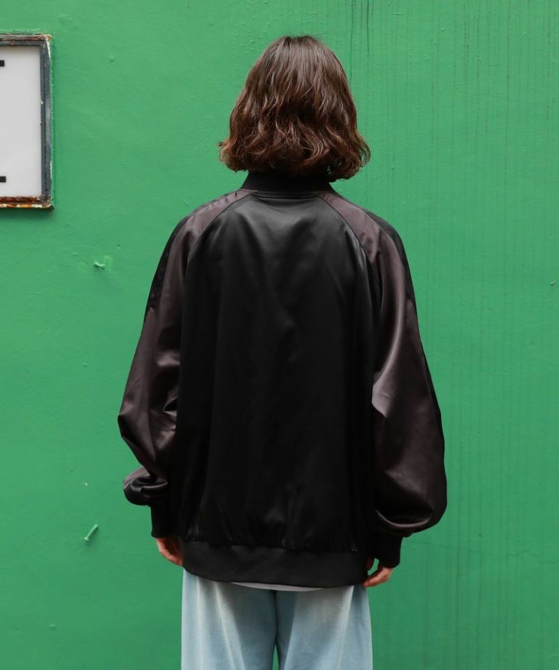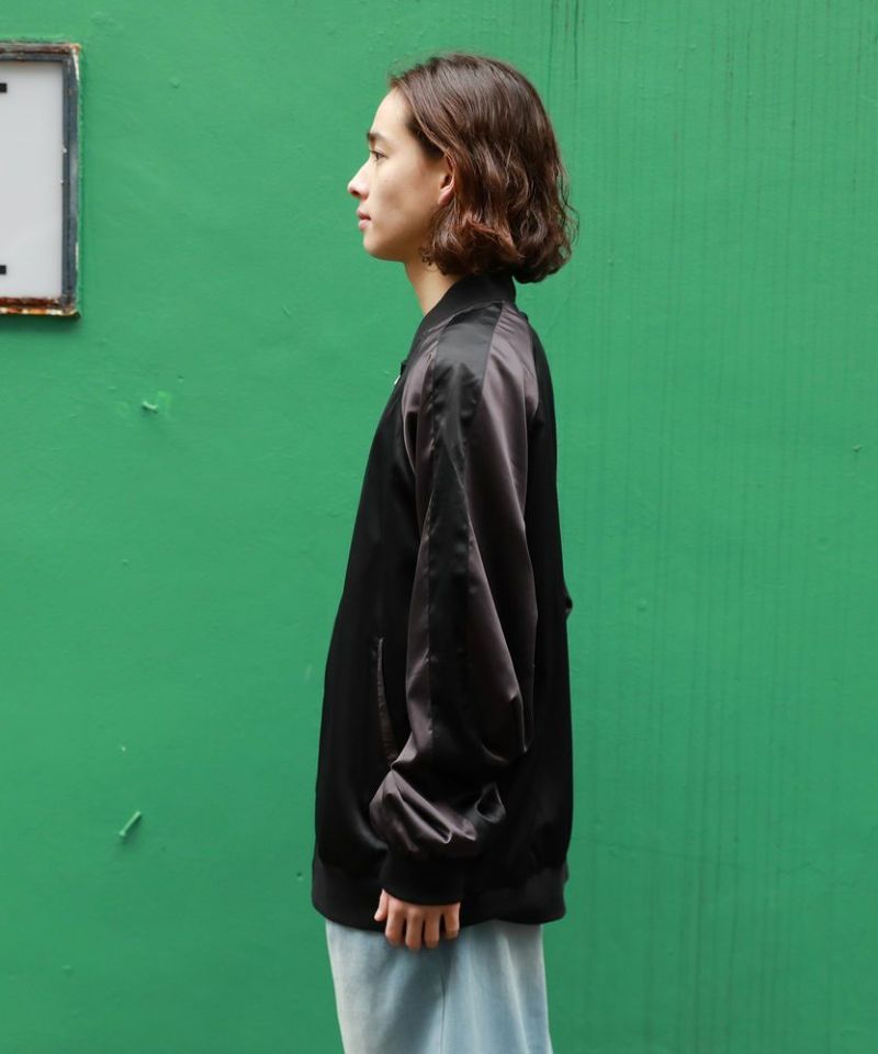 ヴィンテージライクな着こなしに欠かせないスカジャン。刺繍のないミニマルなデザインにすることで、幅広いコーディネートに対応できる着回し力の高い一着。配色のバランスにもこだわり、着こなしに取り入れるだけで抜け感のあるスタイルに。光沢感と落ち感のあるポリエステルサテン生地を使用し、とろみのあるドレープ感を表現。程よい緩さがリラックス感のある今の気分にマッチするアイテムに仕上がっています。薄手で軽やかな着心地のスカジャンは一つあると春先や秋口のライトアウターとして活躍。男女問わずにユニセックスでお使いいただけます。
