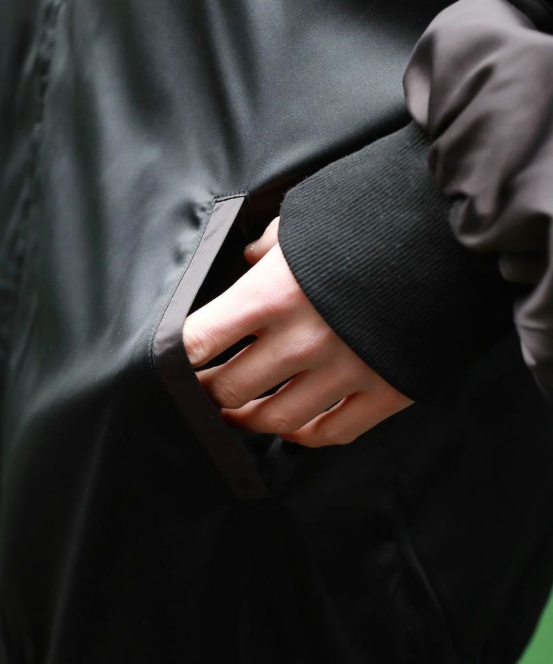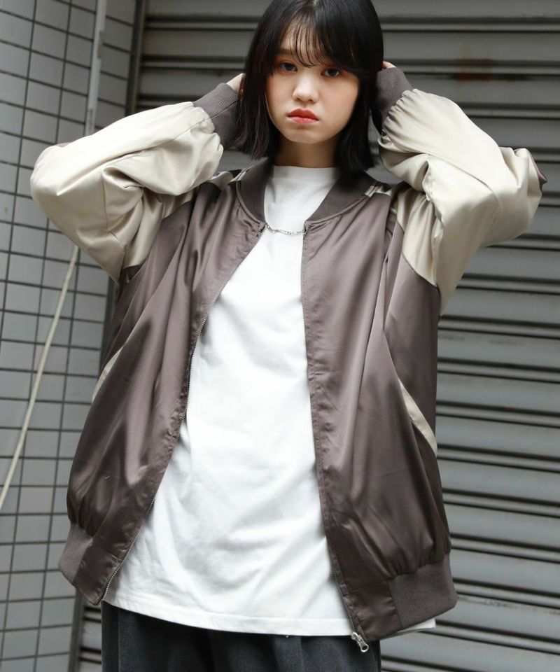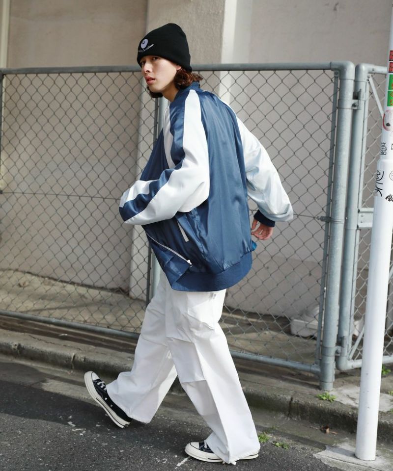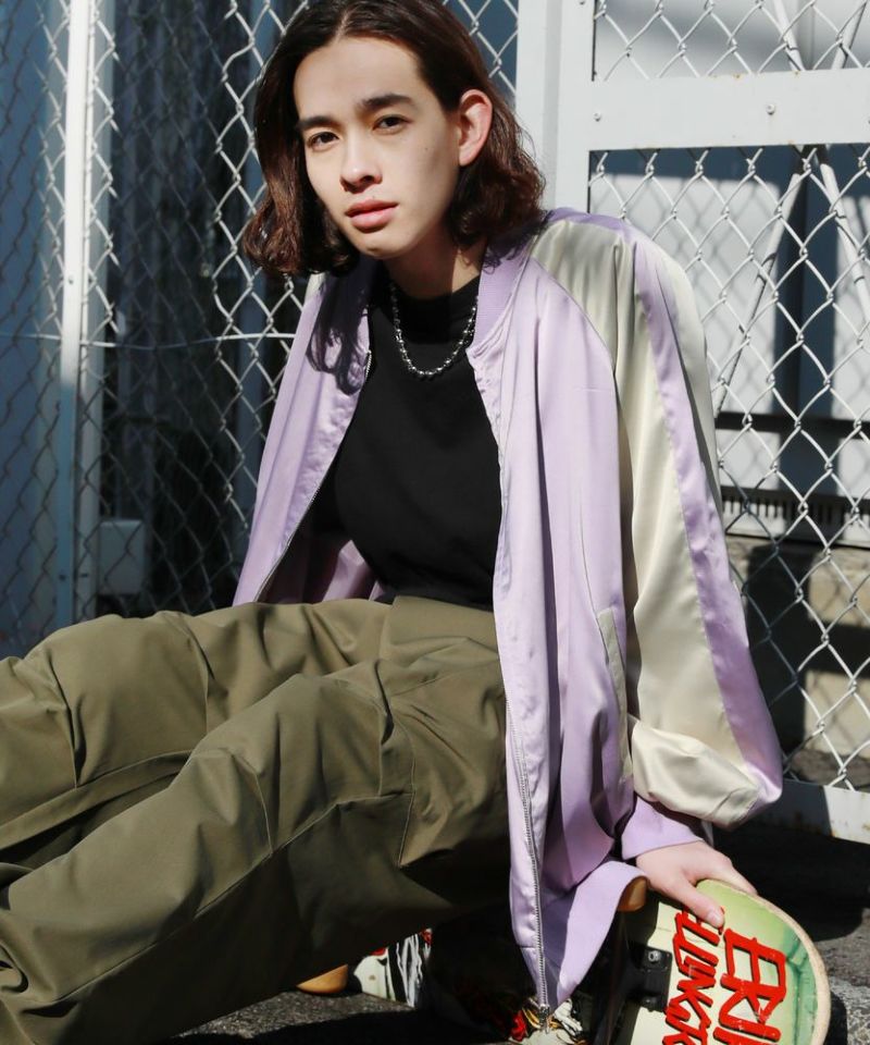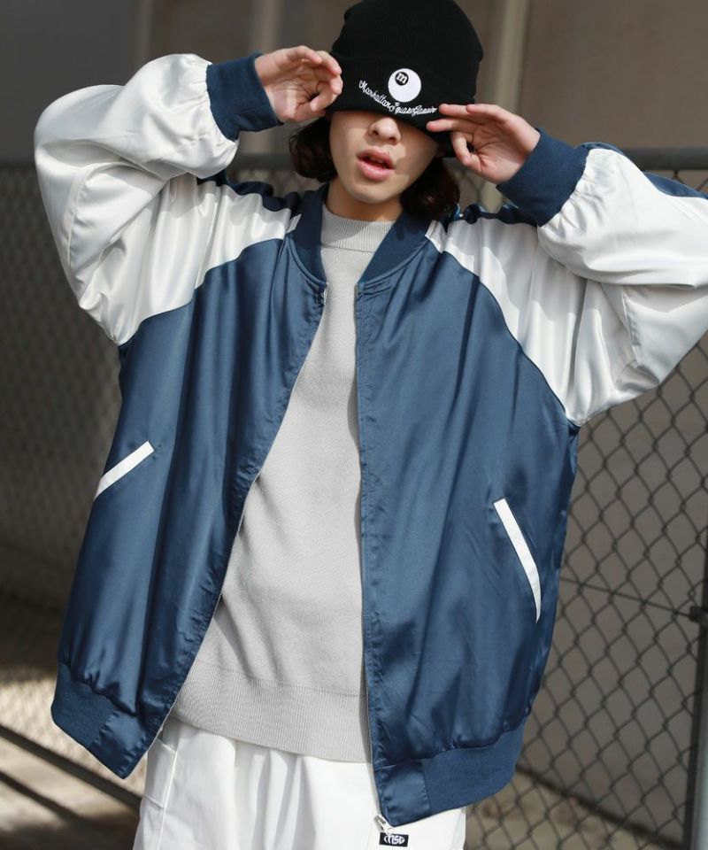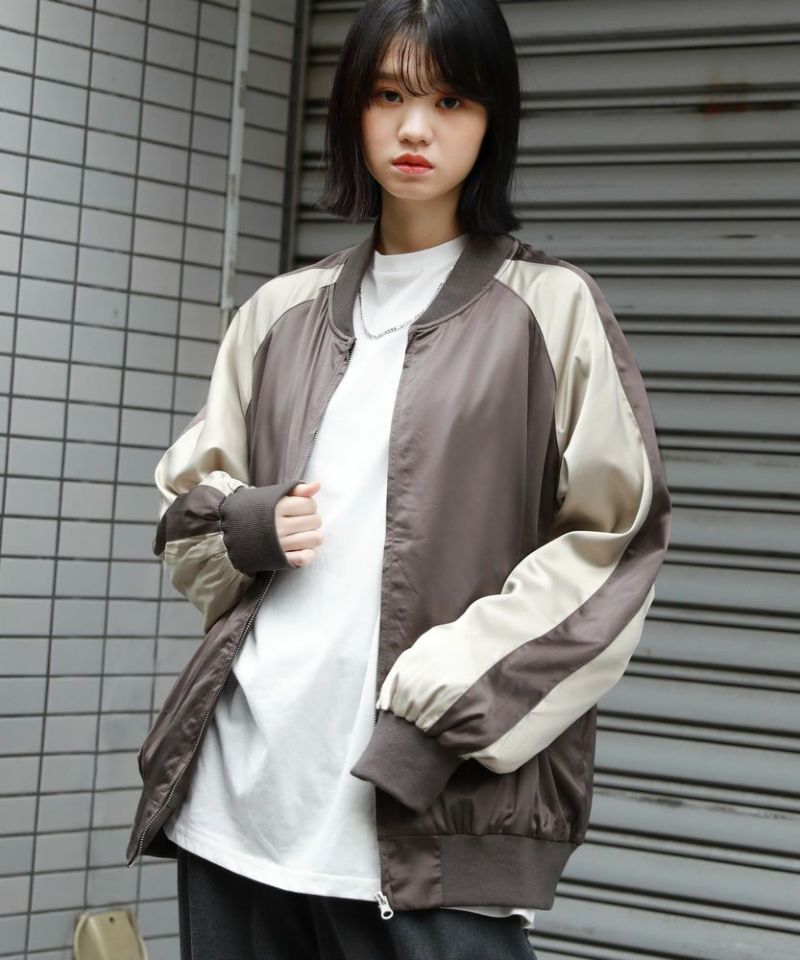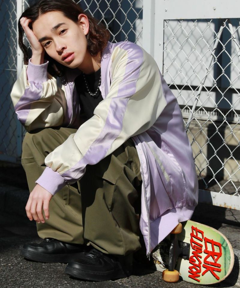 ヴィンテージライクな着こなしに欠かせないスカジャン。刺繍のないミニマルなデザインにすることで、幅広いコーディネートに対応できる着回し力の高い一着。配色のバランスにもこだわり、着こなしに取り入れるだけで抜け感のあるスタイルに。光沢感と落ち感のあるポリエステルサテン生地を使用し、とろみのあるドレープ感を表現。程よい緩さがリラックス感のある今の気分にマッチするアイテムに仕上がっています。薄手で軽やかな着心地のスカジャンは一つあると春先や秋口のライトアウターとして活躍。男女問わずにユニセックスでお使いいただけます。