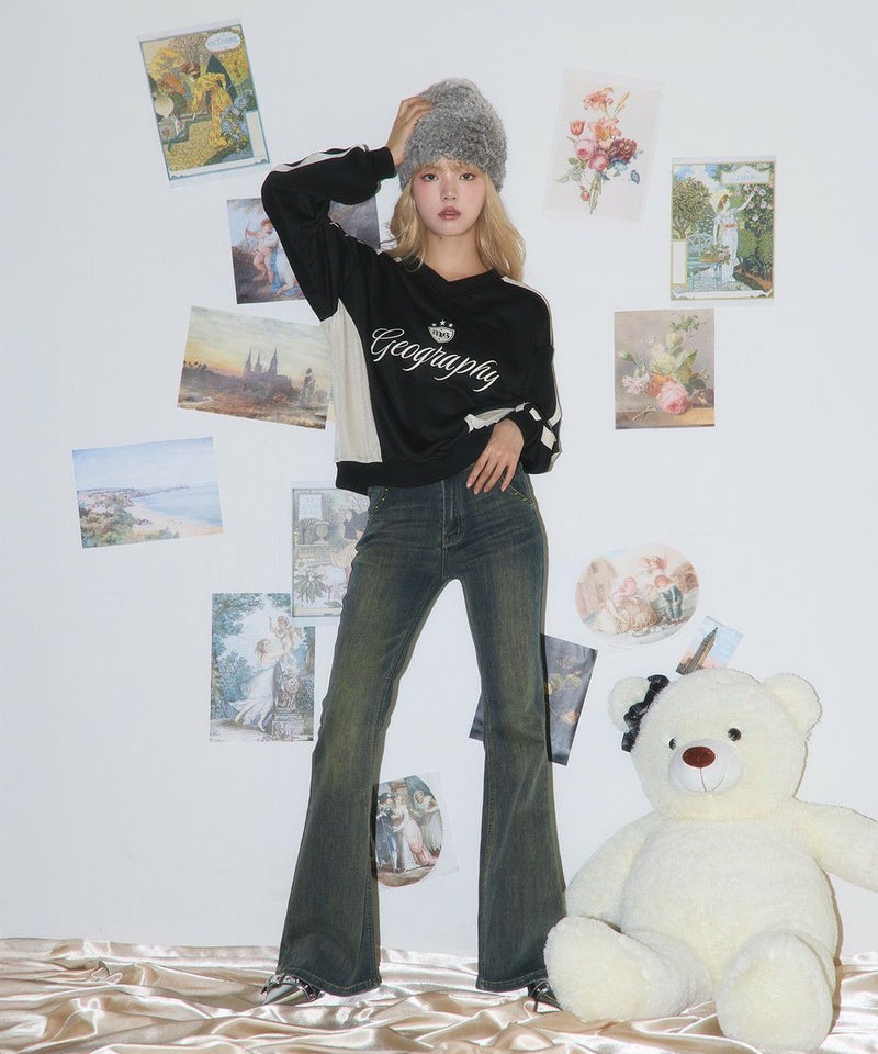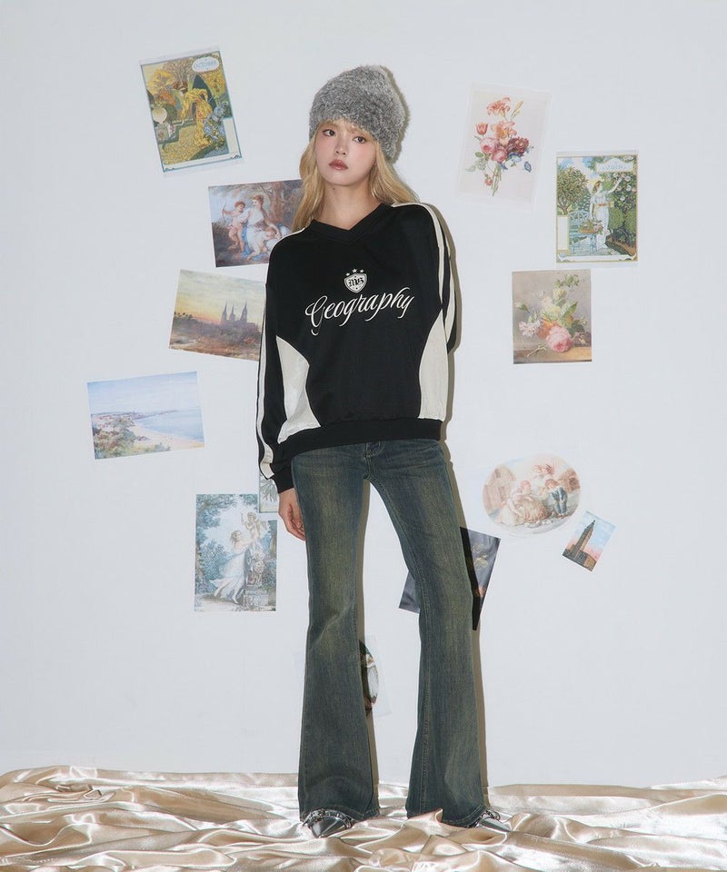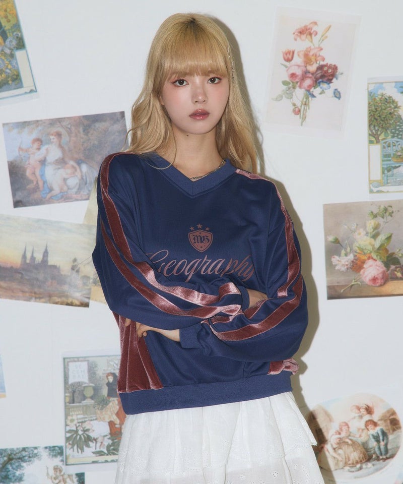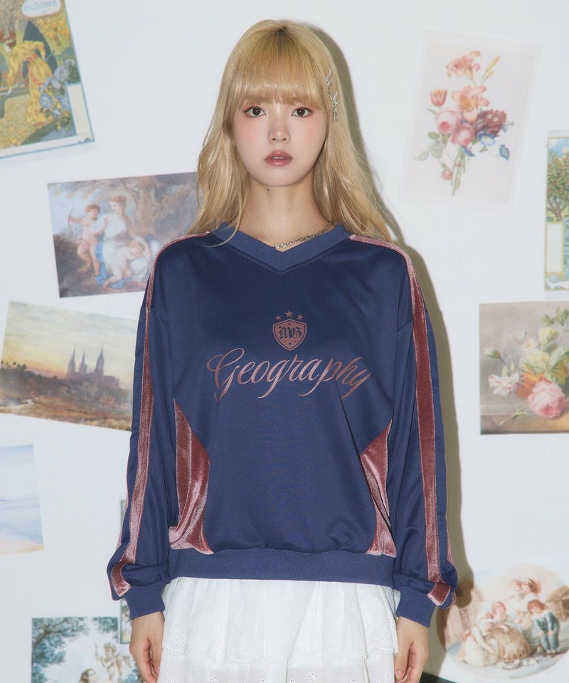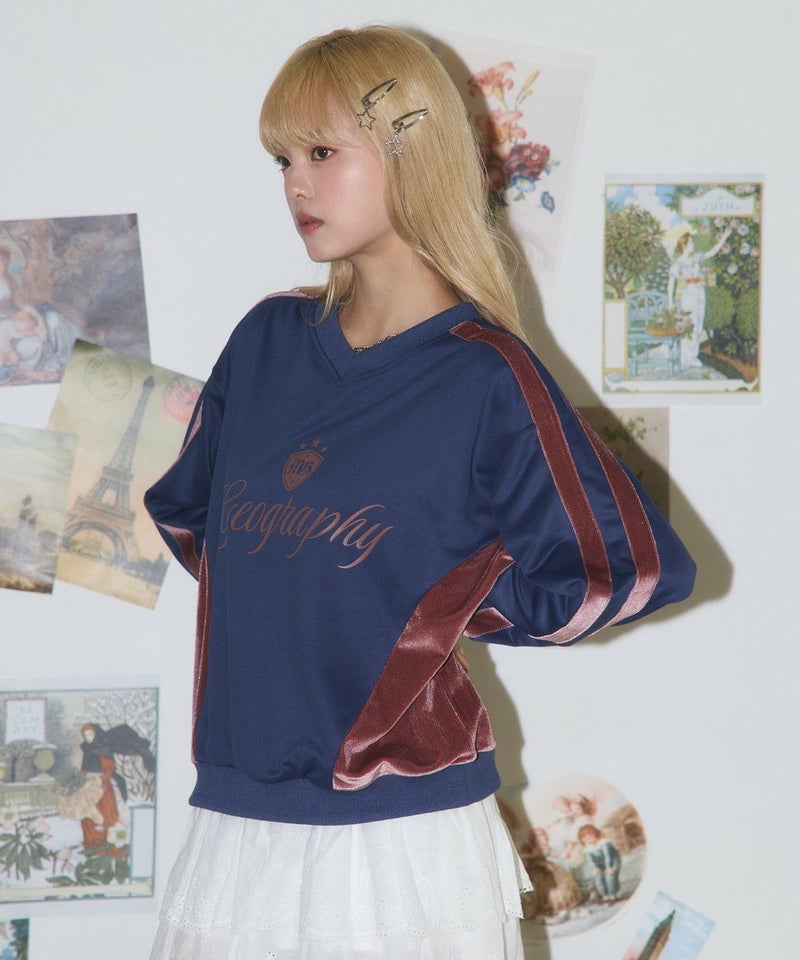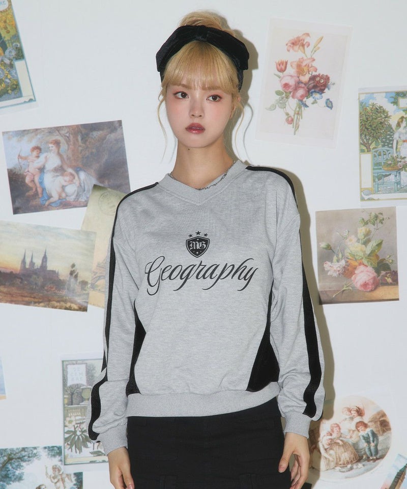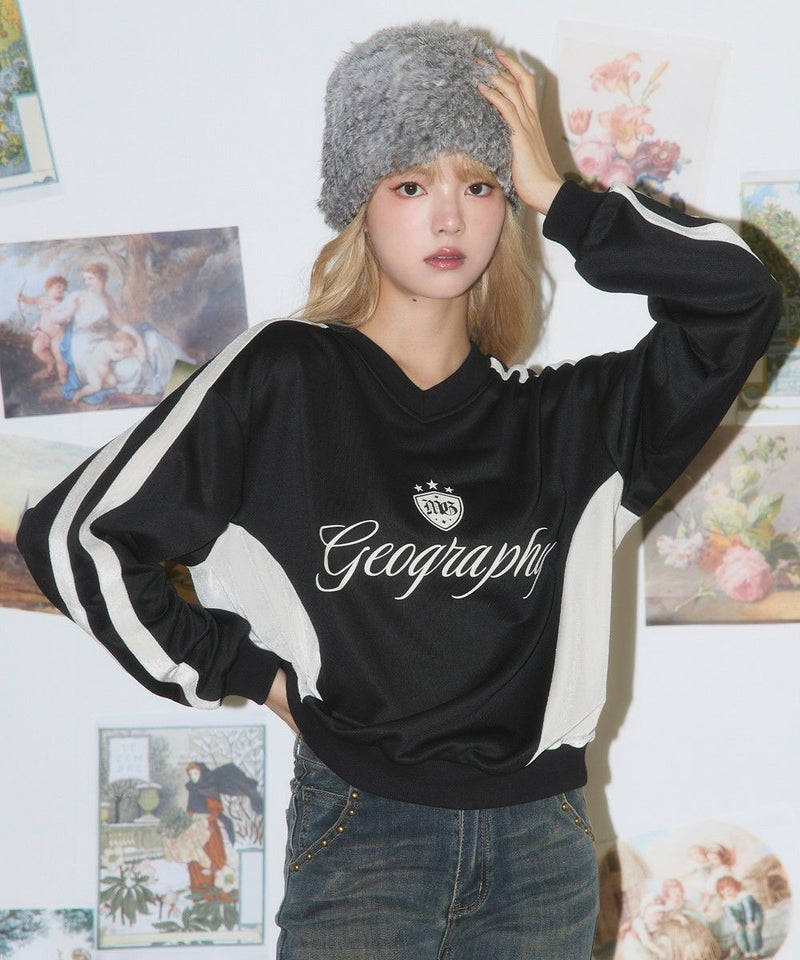 ・フロントの「Geography」ロゴが目を引く、韓国ストリートムード漂うスポーティなゲームスウェット。