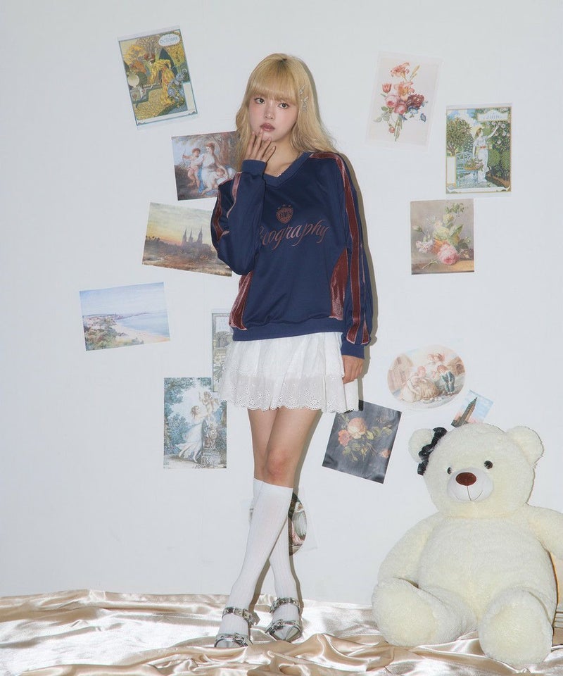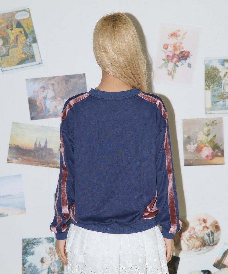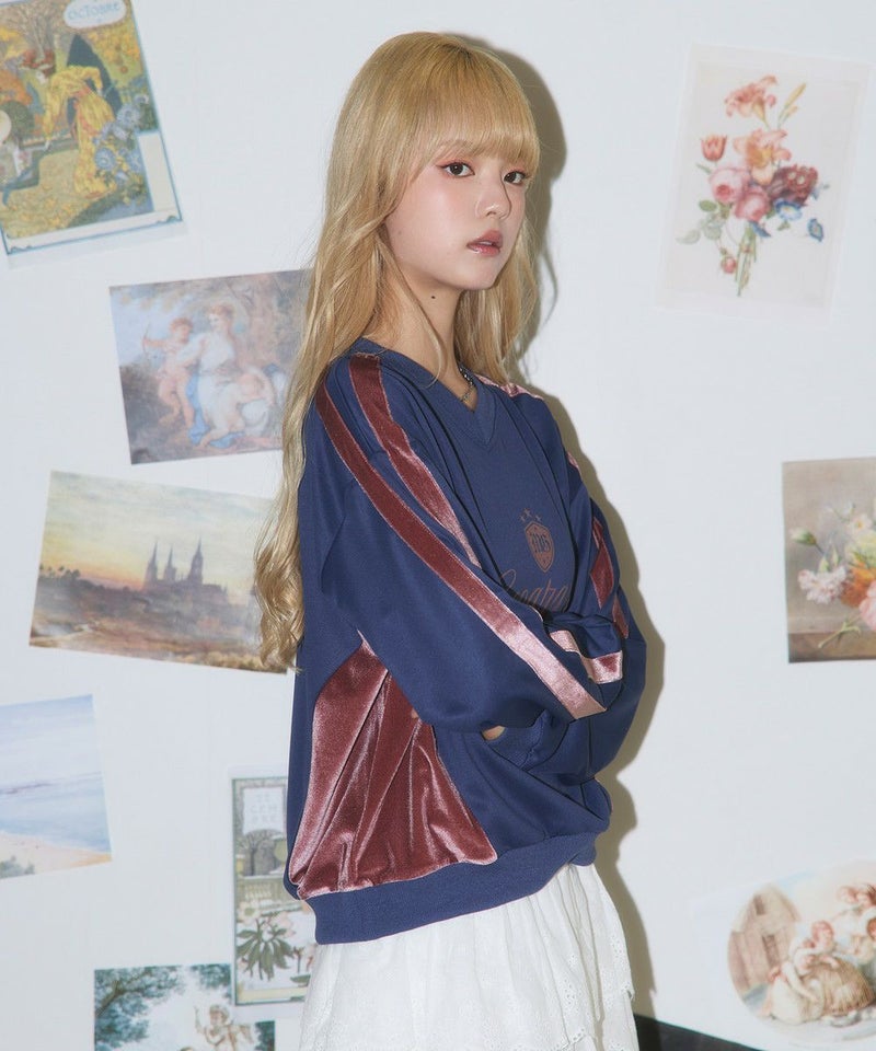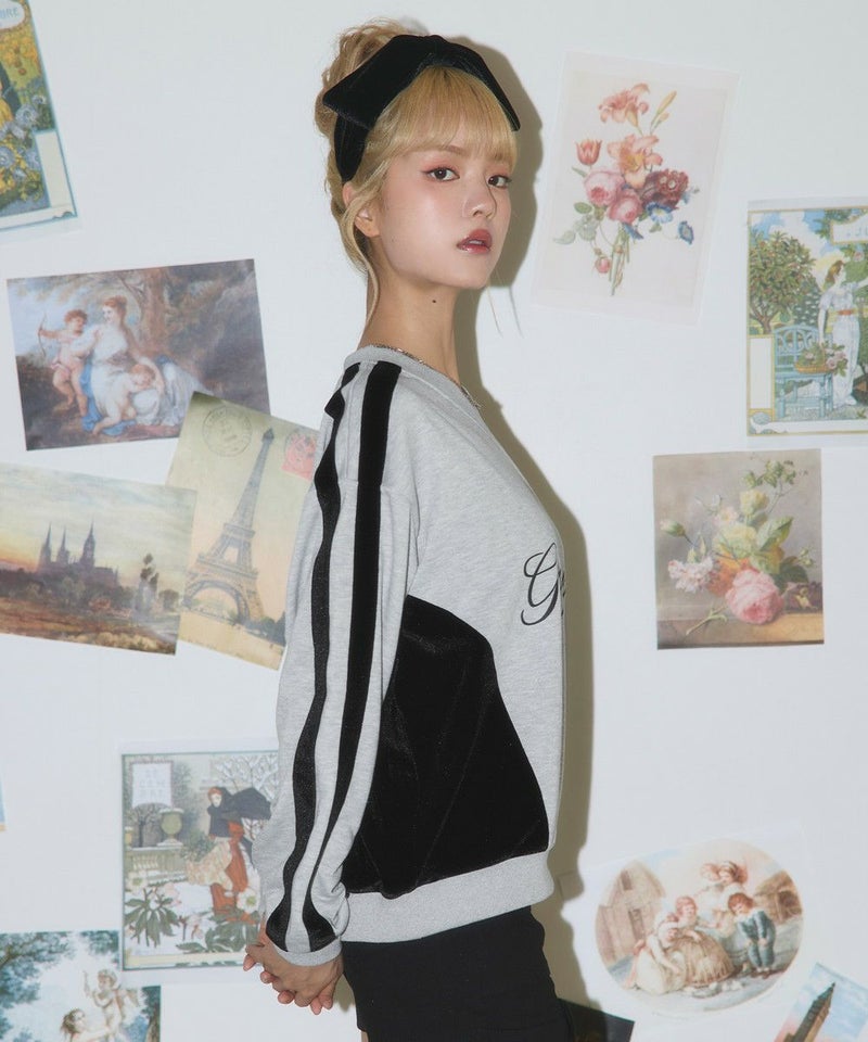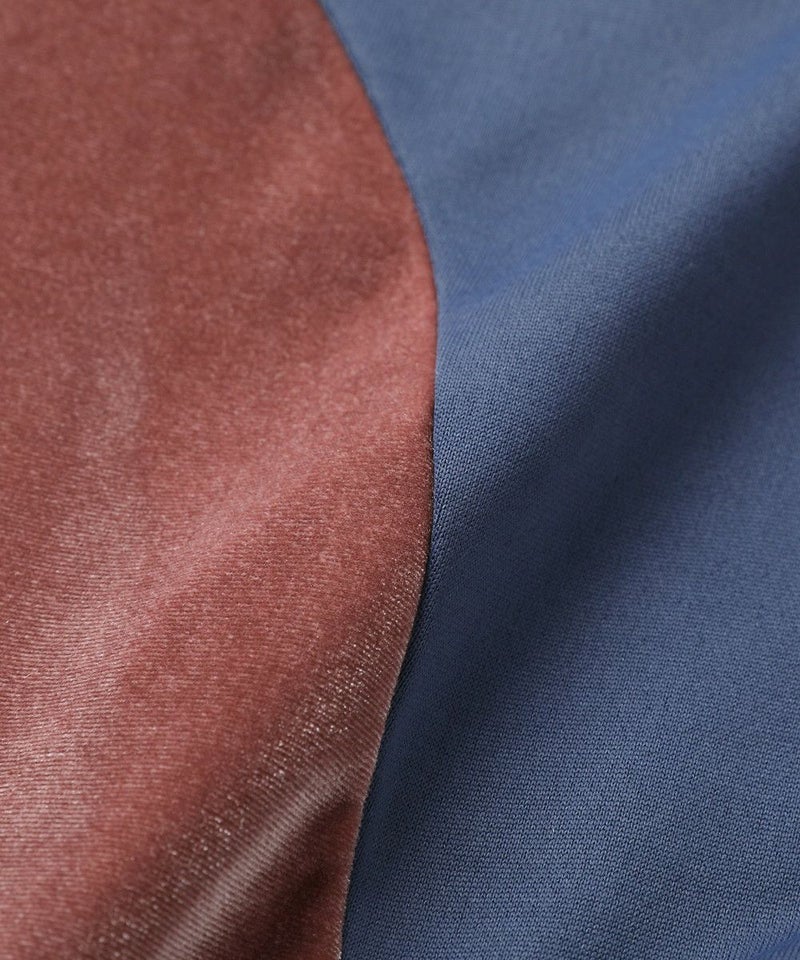 ・身頃のサイド、袖ラインは光沢感のあるベロア素材切り替えデザインで、スタイリングに奥行きを与えてくれます。