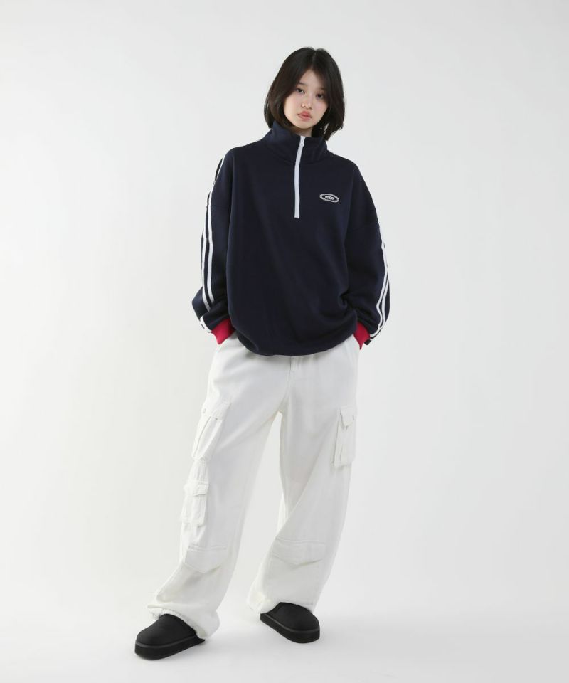 ハーフジップタイプのスウェット地のプルオーバー。ビッグシルエットでゆったり着ていただけるサイジングとなっております。ジップを閉めてネック部分を立たせると首元をしっかり覆ってくれて、裾はパイピング仕様で風が通りにくいように仕上げました。左胸の4種類のオリジナルブランドロゴがアクセントになった、街で着映えるデザインも魅力。5種類のデザインからお選びいただけます。メンズ・レディース問わず着ていただけるユニセックス対応アイテムです。