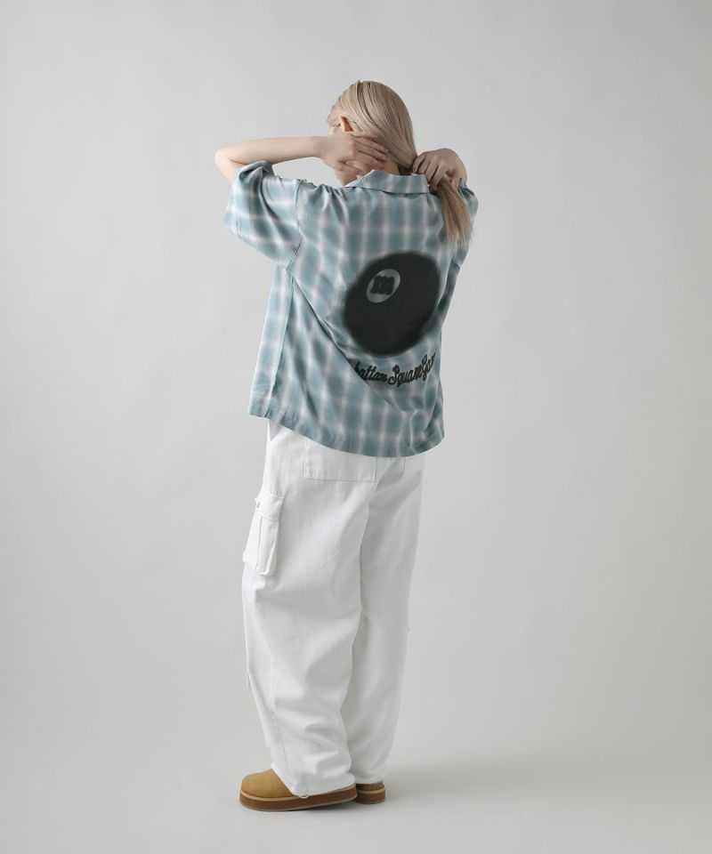 襟元はオープンカラーで、首周りの締め付けがなくリラックス感のあるシャツ。背面にグラフィカルなビリヤードモチーフとブランドロゴをプリントしたインパクト大のアイテムです。肩幅、身幅に余裕を持たせたオーバーサイズで、合わせるだけでトレンド感のあるコーデにまとまります。両サイドの裾はスリット入りで、レイヤードした際にインナーとも馴染みやすい仕上がり。女性もゆるく着こなせるユニセックスアイテムです。