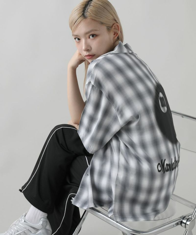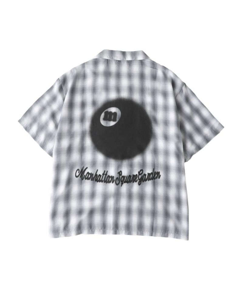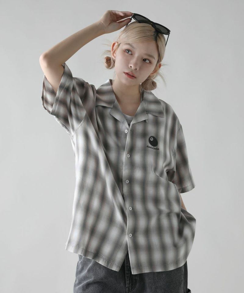 ビリヤードロゴオーバーサイズオンブレチェック半袖オープンカラーシャツ