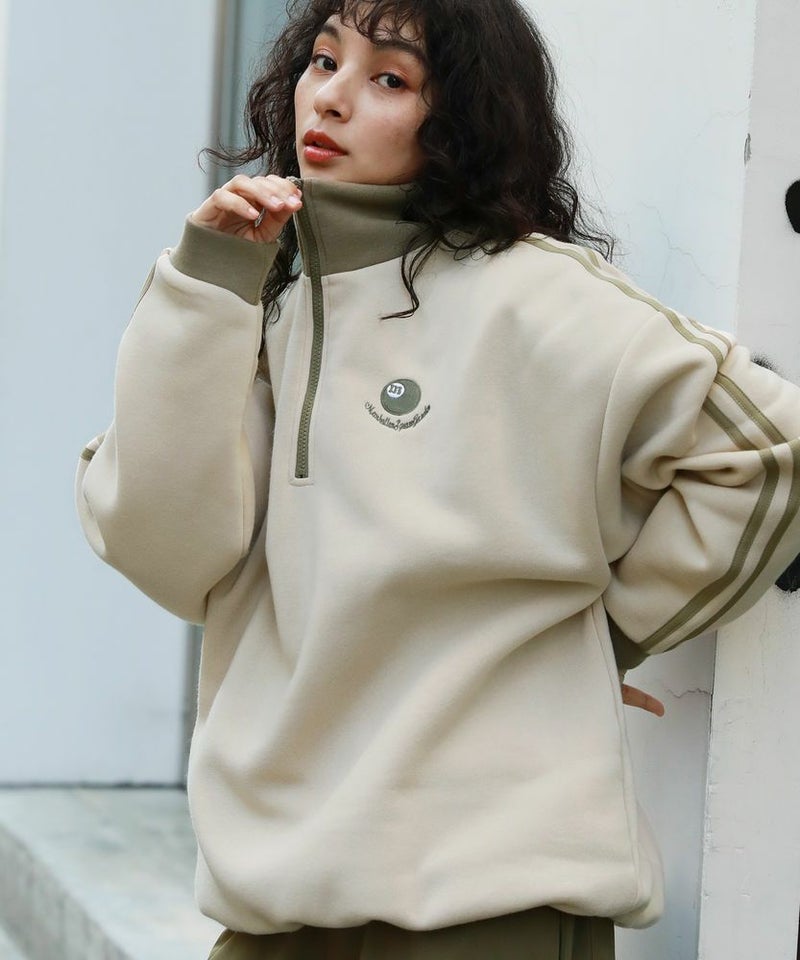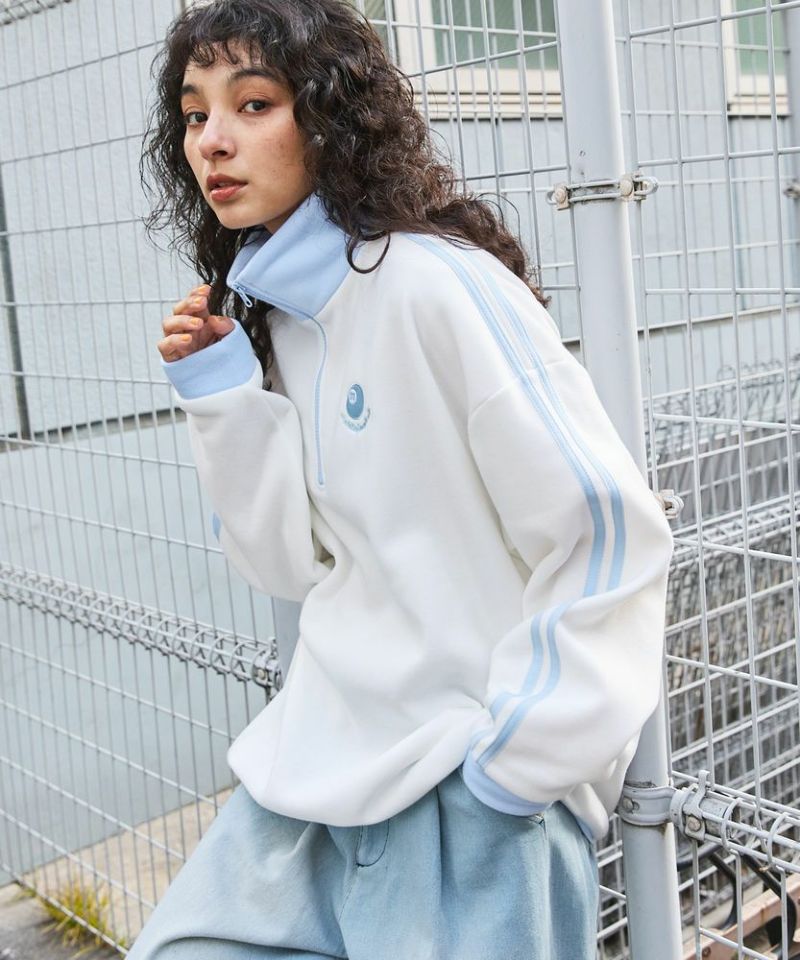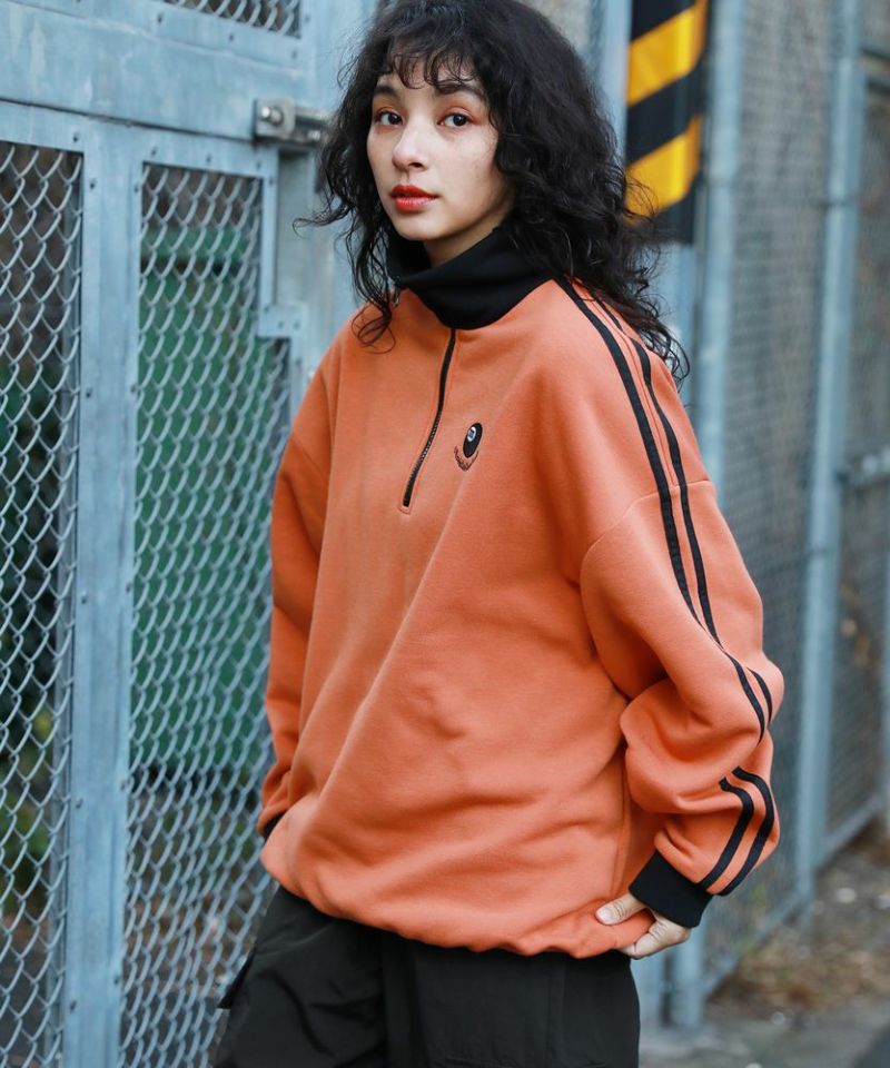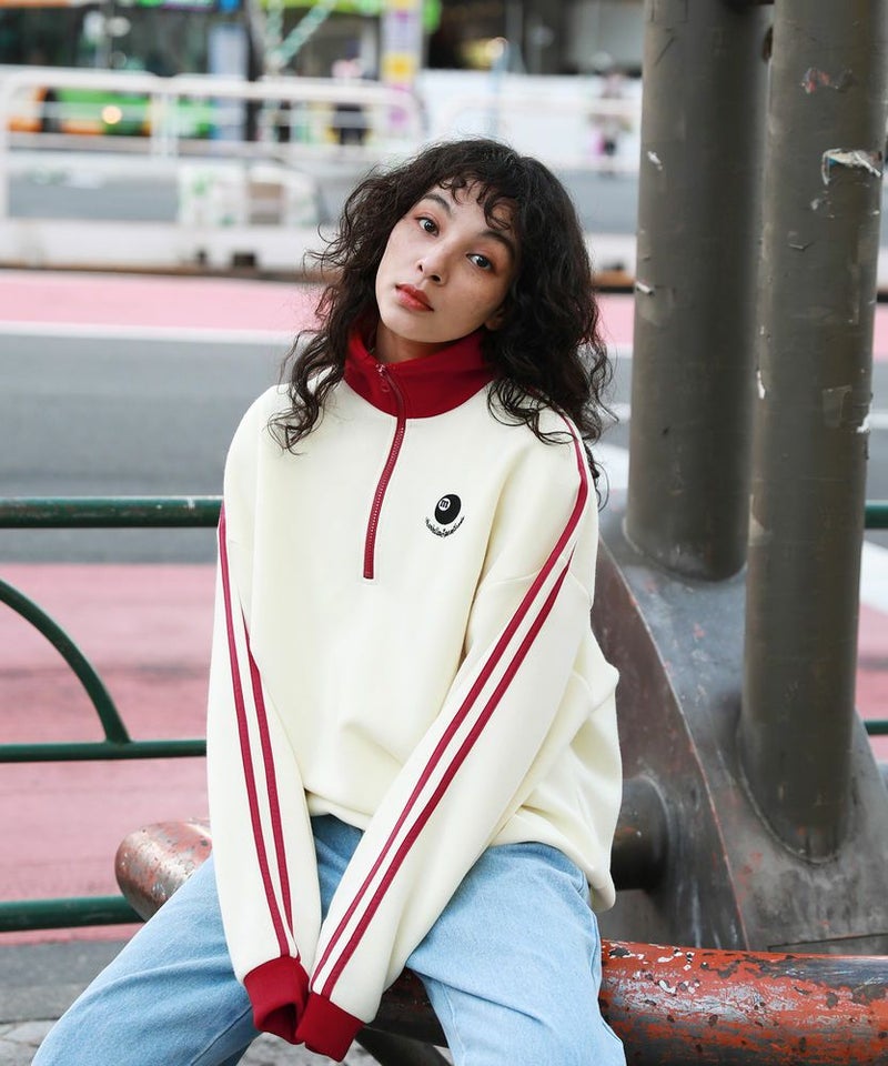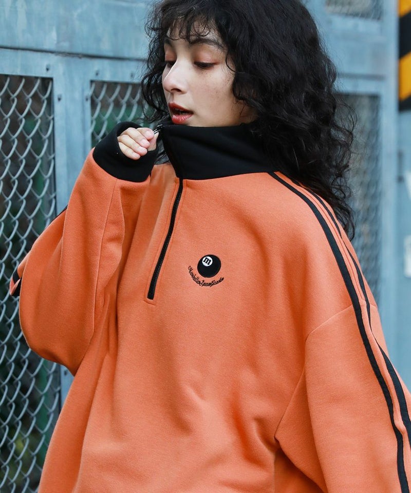 オーバーサイズハーフジップスウェットプルオーバー 配色 ビリヤードロゴ ワンポイント刺繍 サイドライン トラックジャケット