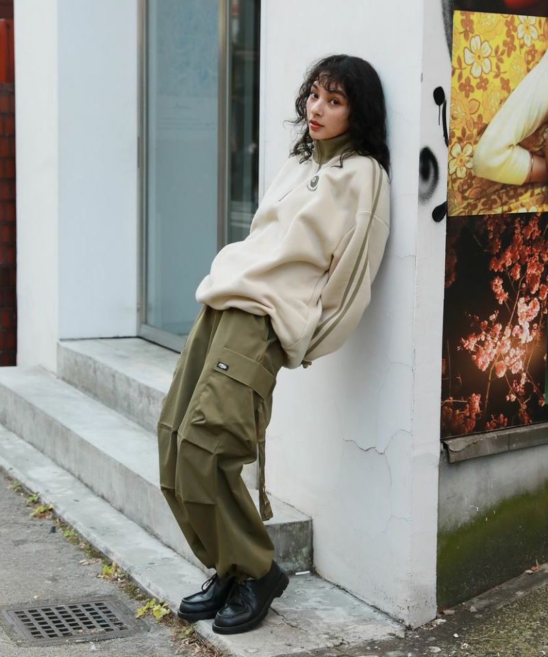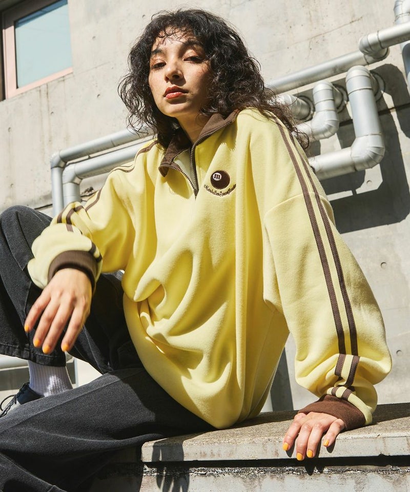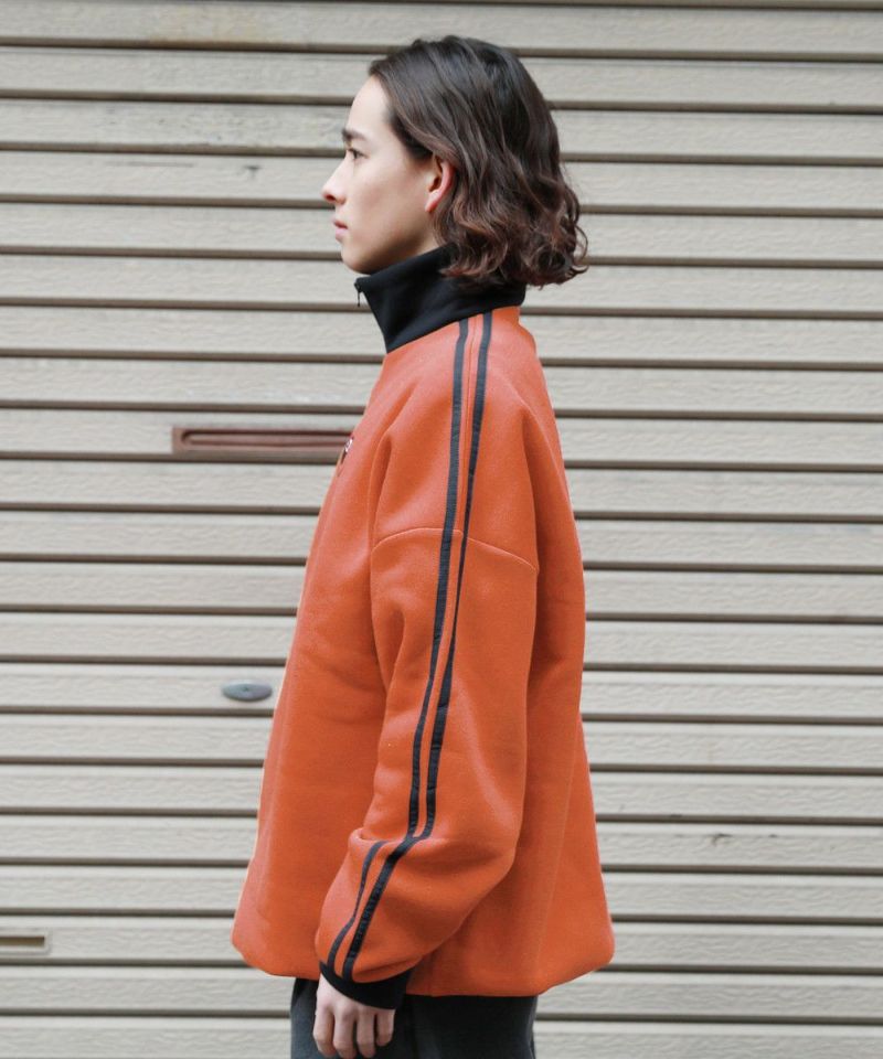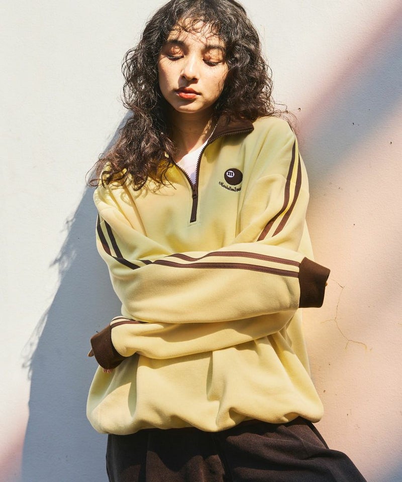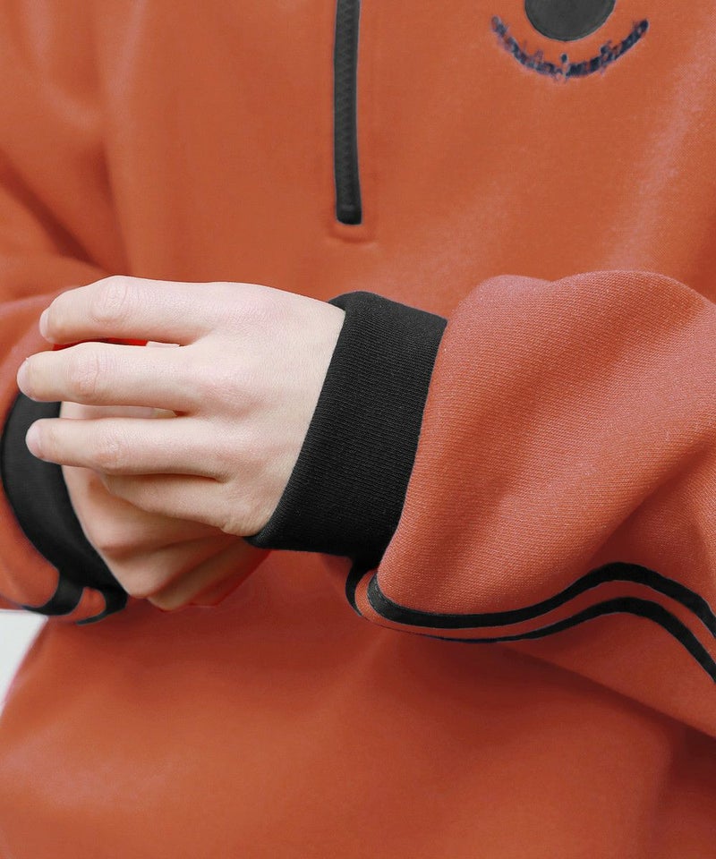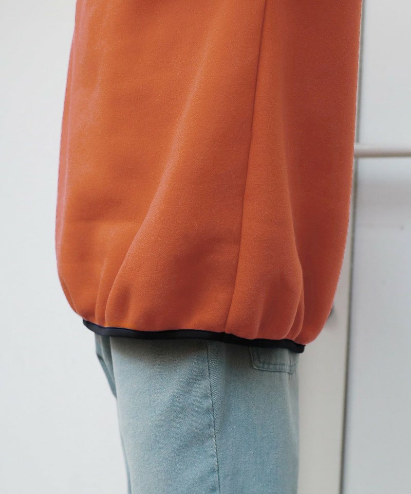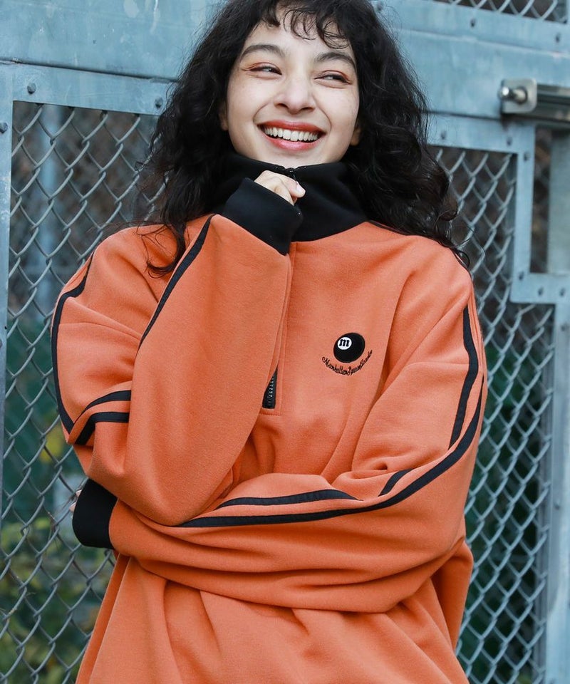 ハーフジップタイプのスウェット地プルオーバー。ビッグシルエットでゆったり着ていただけるサイジングとなっております。ジップを閉めてネック部分を立たせると首元をしっかり覆ってくれて、裾はパイピング仕様で風が通りにくいように仕上げました。ネック部分と袖の切り替え、袖のサイドラインでトレンドのトラックジャージ風デザインで、左胸にはオリジナルのビリヤードロゴを配しております。メンズ・レディース問わず着ていただけるユニセックス対応アイテムです。