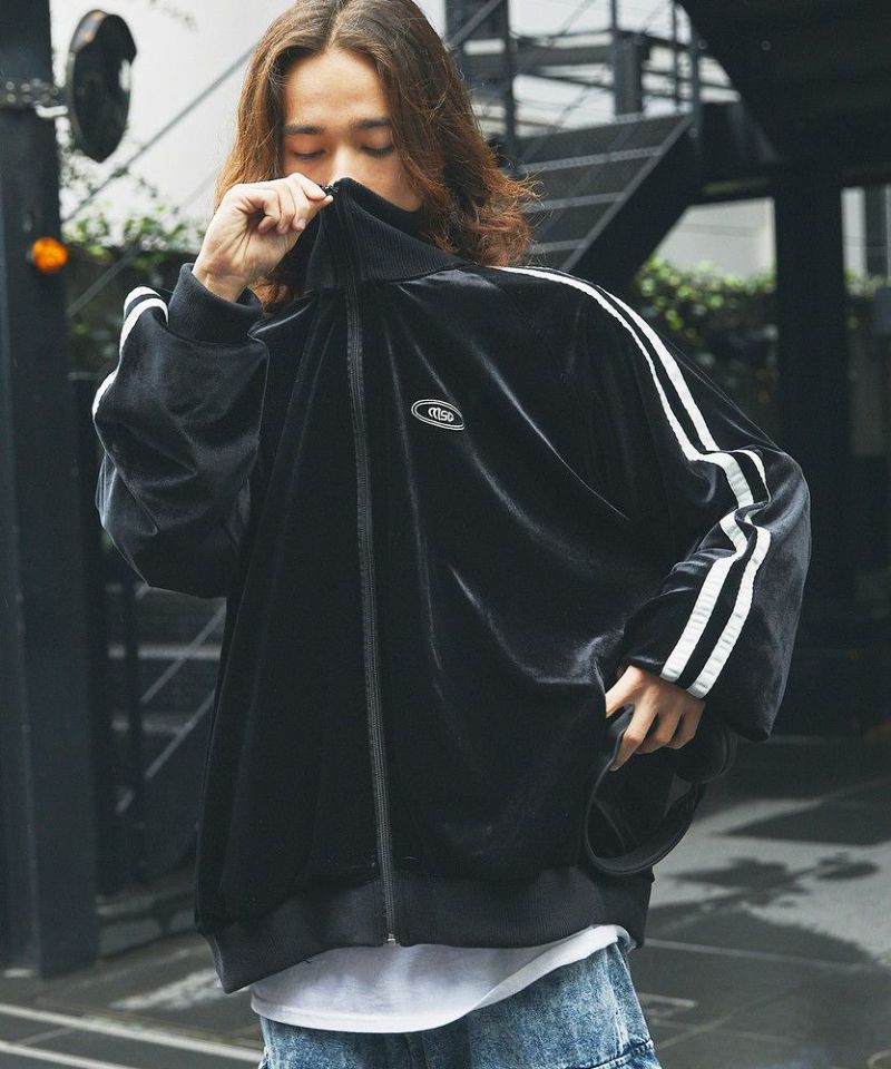 スポーツアイテムのトラックジャケットをベロア素材でデザインした事により、カジュアル、ストリート、古着ミックスにも取り入れ易いマルチなアイテムに仕上がりました。フルジップタイプは秋のライトアウターだけでなく、冬のインナー使いにもおすすめ。ワイドパンツと合わせたラフなスタイルも今っぽく決まります。