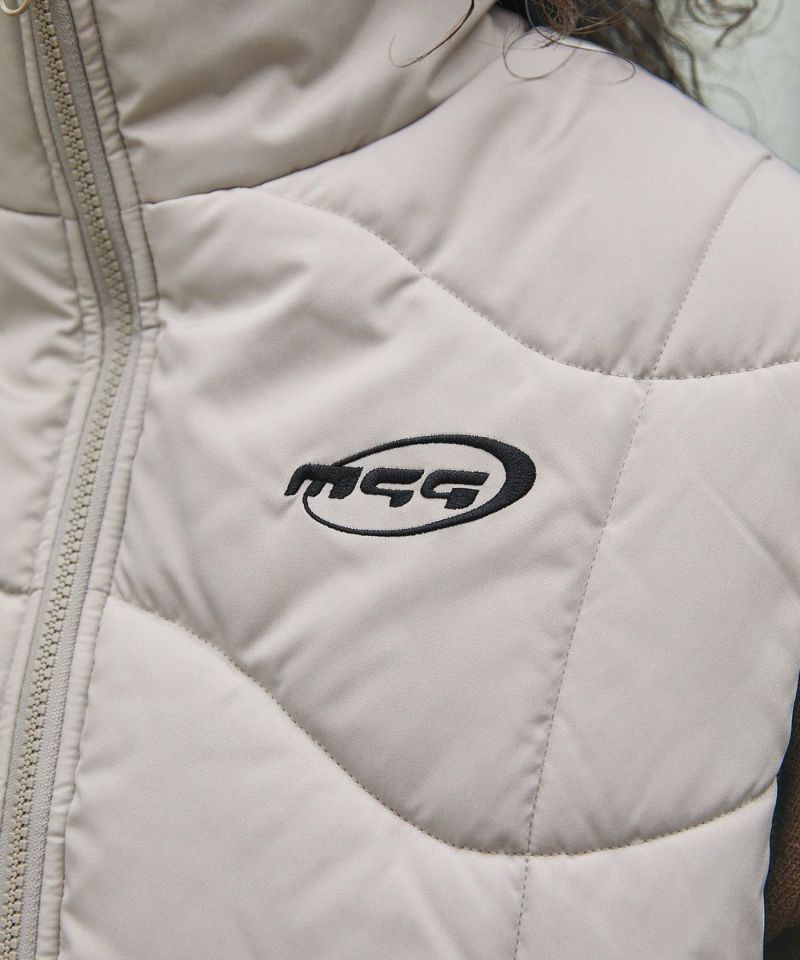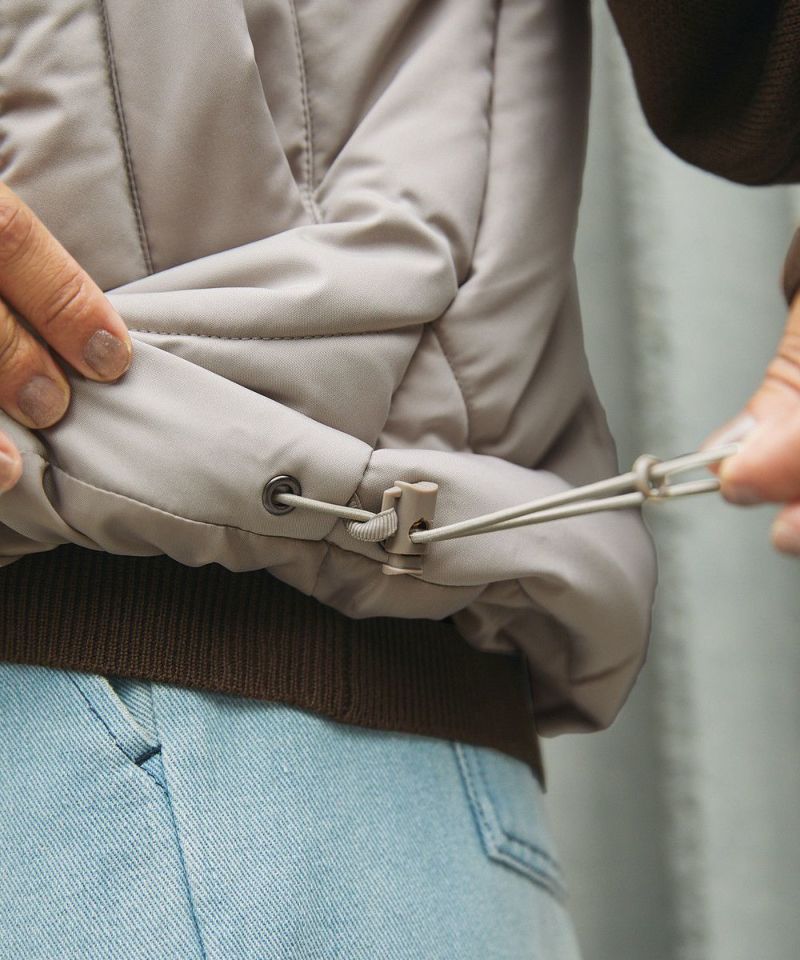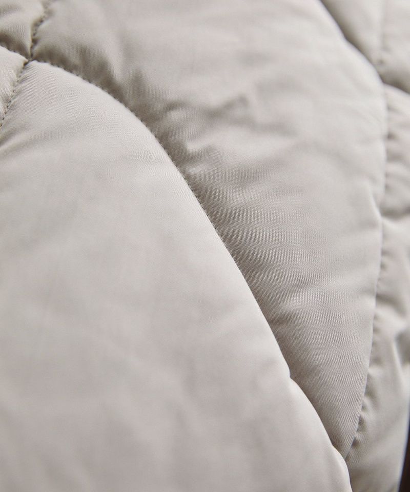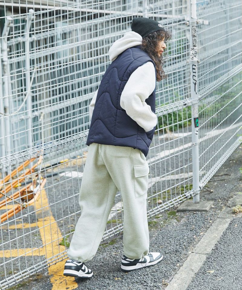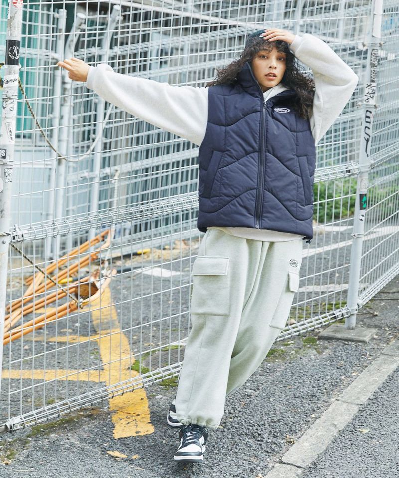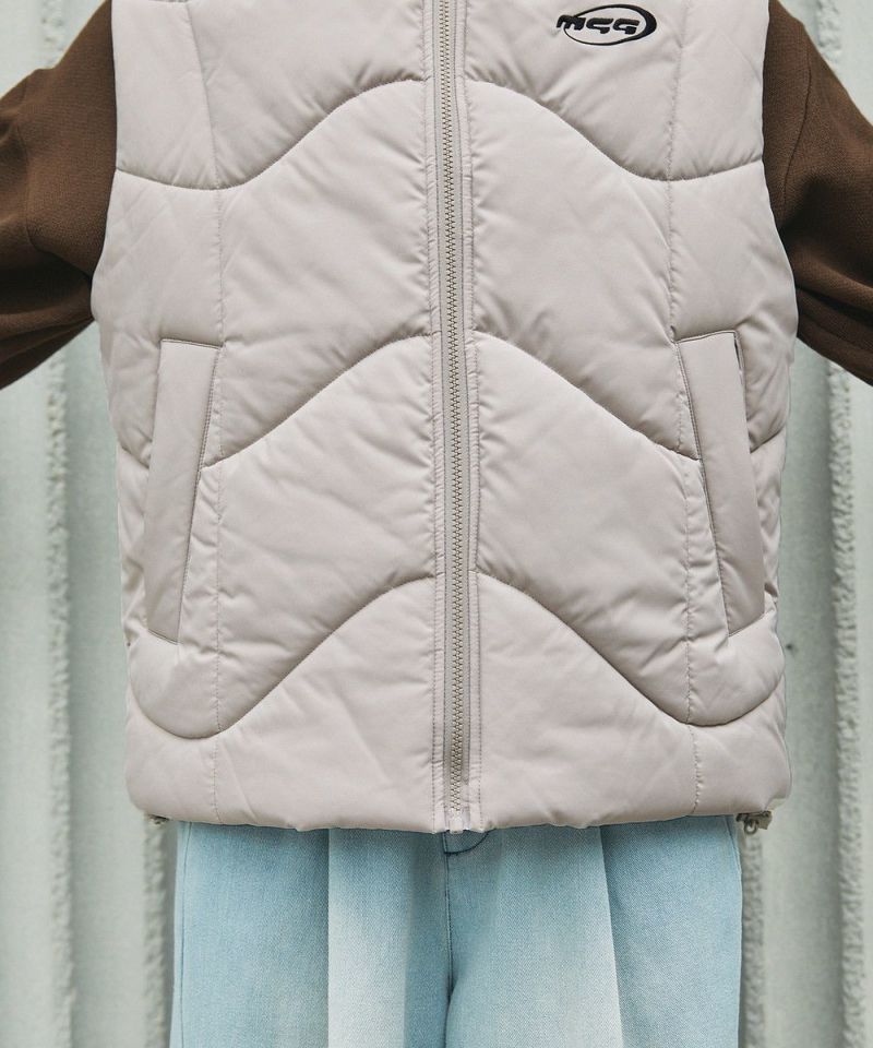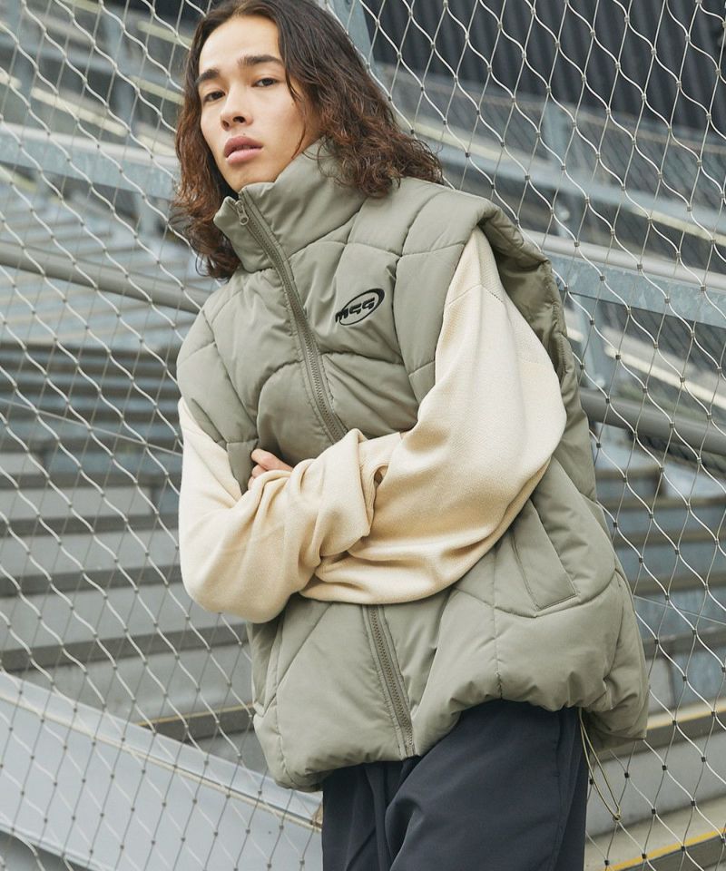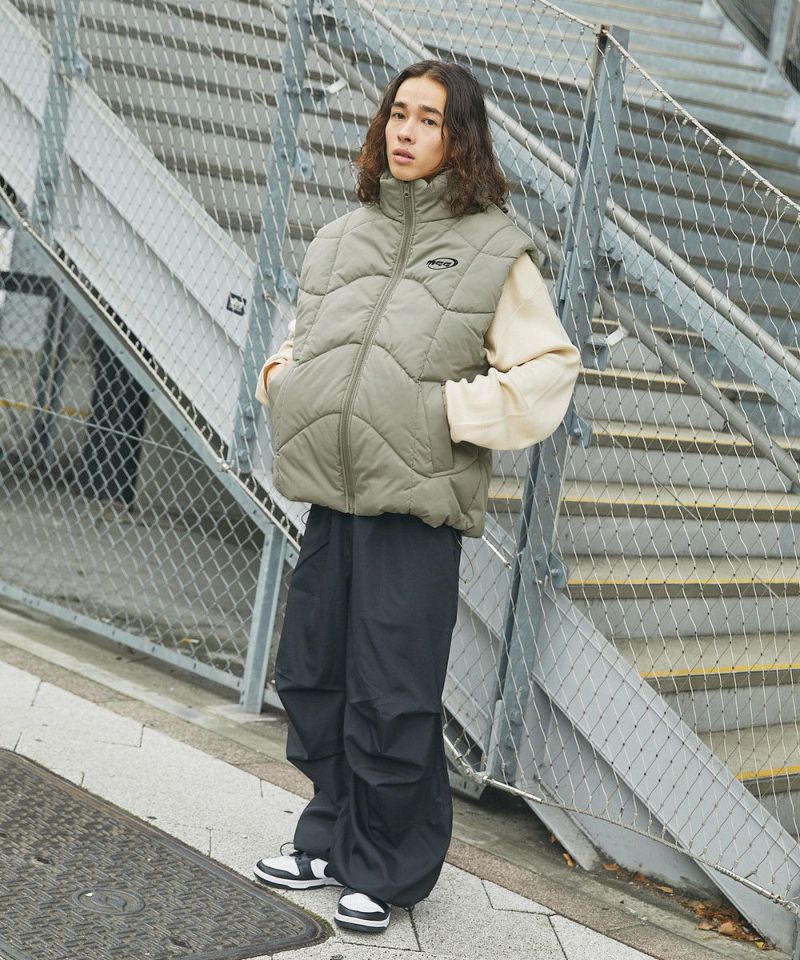 フロントジップ仕様の中綿キルティングベスト。中綿入りで温かさキープできるのはもちろん、波型のキルティングが目を引くデザインです。広めに取った身幅やゆとりのある腕ぐりなど、オーバーサイズに着こなせるベストは旬なムードでカジュアルスタイルにピッタリ。首元はジップアップすればハイネック仕様になり、防寒性も抜群。左胸のブランドロゴ刺繍がさり気ないアクセントになり、着こなしのワンポイントになります。どんなアイテムとも合わせやすいベーシックなブラック、チャコール、ネイビーに、ニュアンスカラーのライトカーキ、グレージュを合わせた5色展開。ユニセックスで着用可能なので、男女問わず手軽に旬のコーディネートが楽しめるアイテムです。
