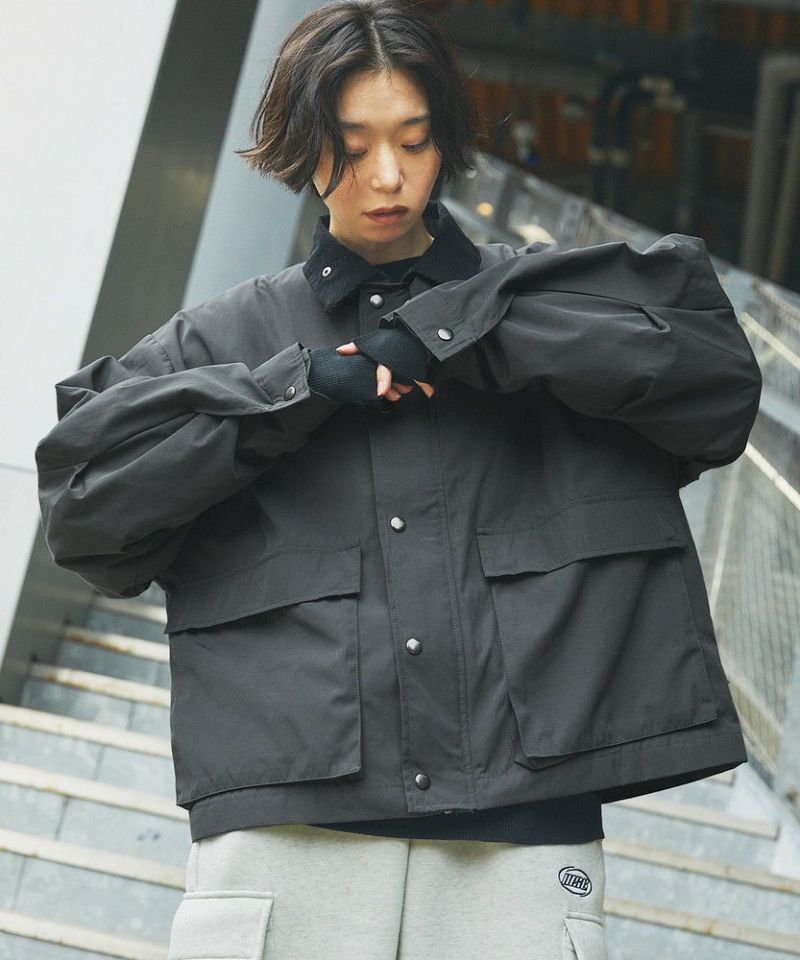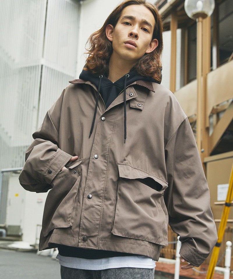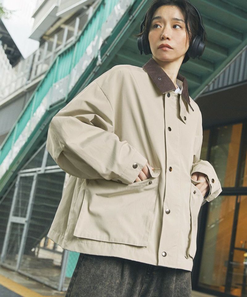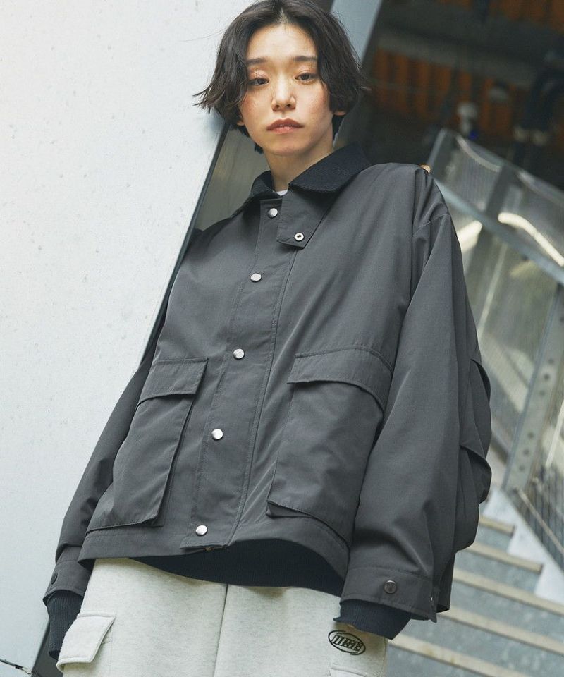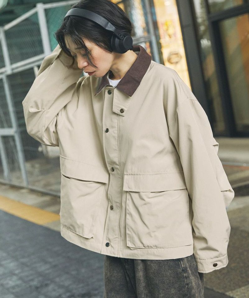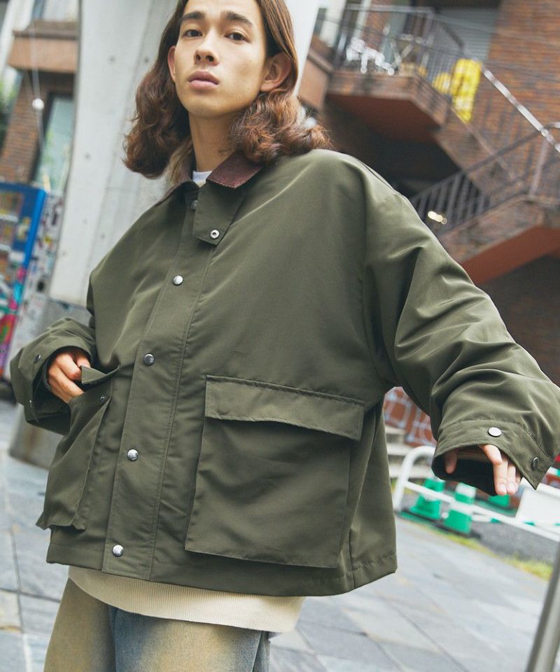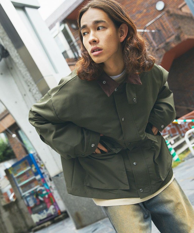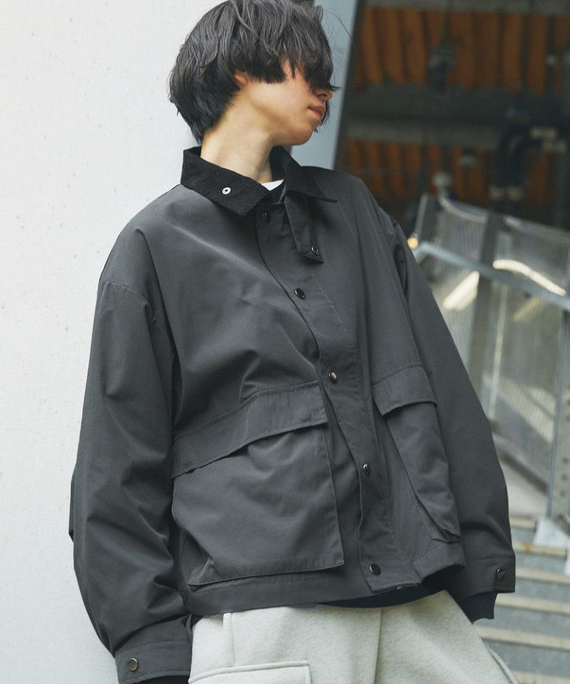 襟部分のコーデュロイ切り替えがポイントのビッグシルエットブルゾン。程よくゆとりをもたせたシルエットで、ラフな着こなしが楽しめるサイズ感に仕上げました。大き目のボタン付フラップポケットやジップ&スナップボタンの前立てなど、実用的なディテールが満載です。さらに襟元のチンストラップを閉めてハイネック仕様にもなる2way仕様。コーデに合わせたアレンジを楽しめて、防寒・防風性もアップします。ユニセックスで着用可能なので、男女問わず手軽に旬のコーディネートが楽しめるアイテムです。