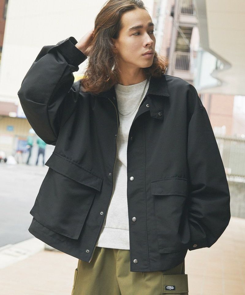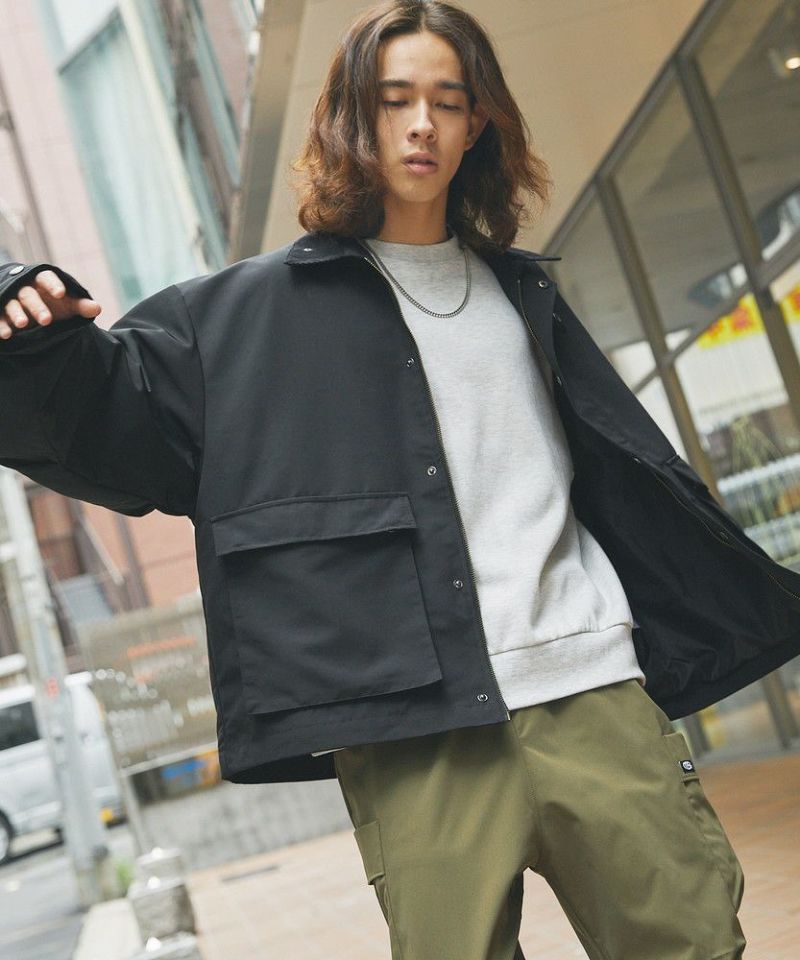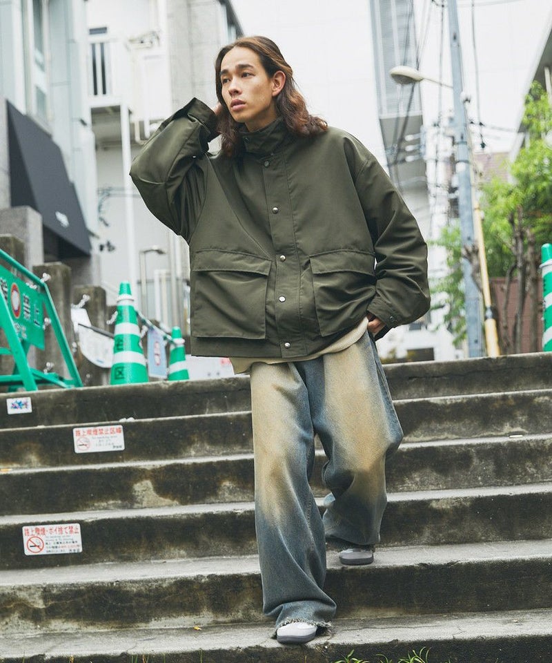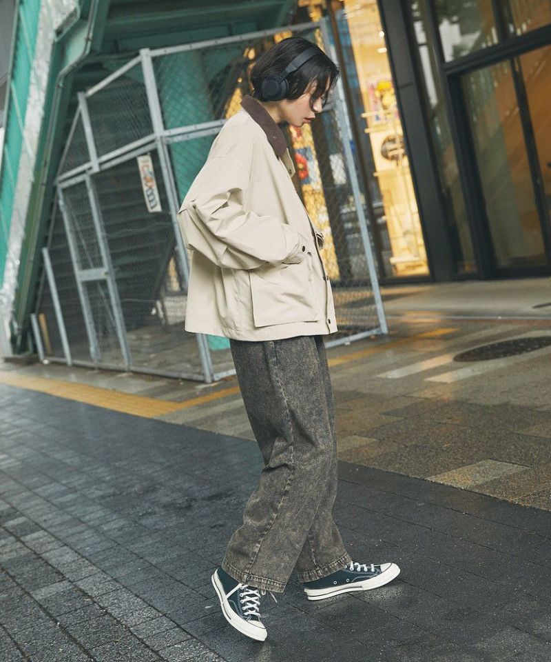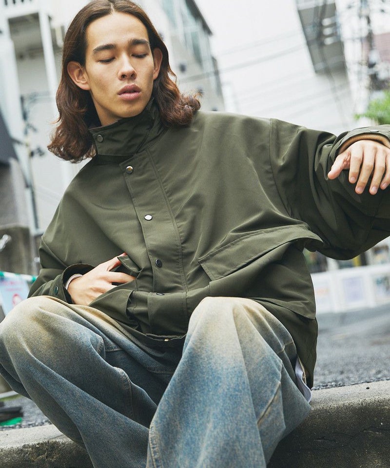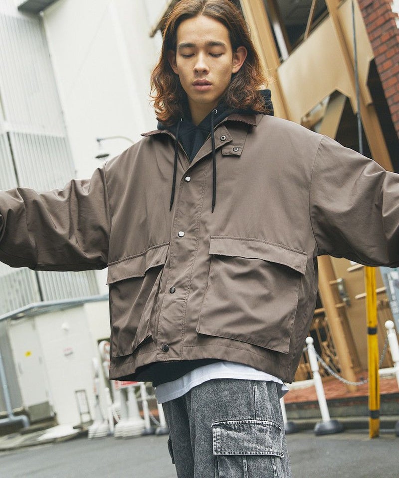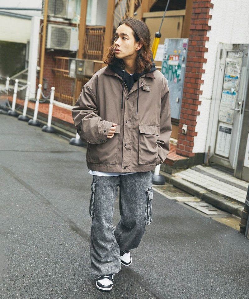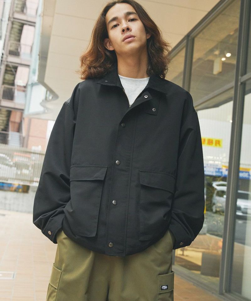 襟部分のコーデュロイ切り替えがポイントのビッグシルエットブルゾン。程よくゆとりをもたせたシルエットで、ラフな着こなしが楽しめるサイズ感に仕上げました。大き目のボタン付フラップポケットやジップ&スナップボタンの前立てなど、実用的なディテールが満載です。さらに襟元のチンストラップを閉めてハイネック仕様にもなる2way仕様。コーデに合わせたアレンジを楽しめて、防寒・防風性もアップします。ユニセックスで着用可能なので、男女問わず手軽に旬のコーディネートが楽しめるアイテムです。