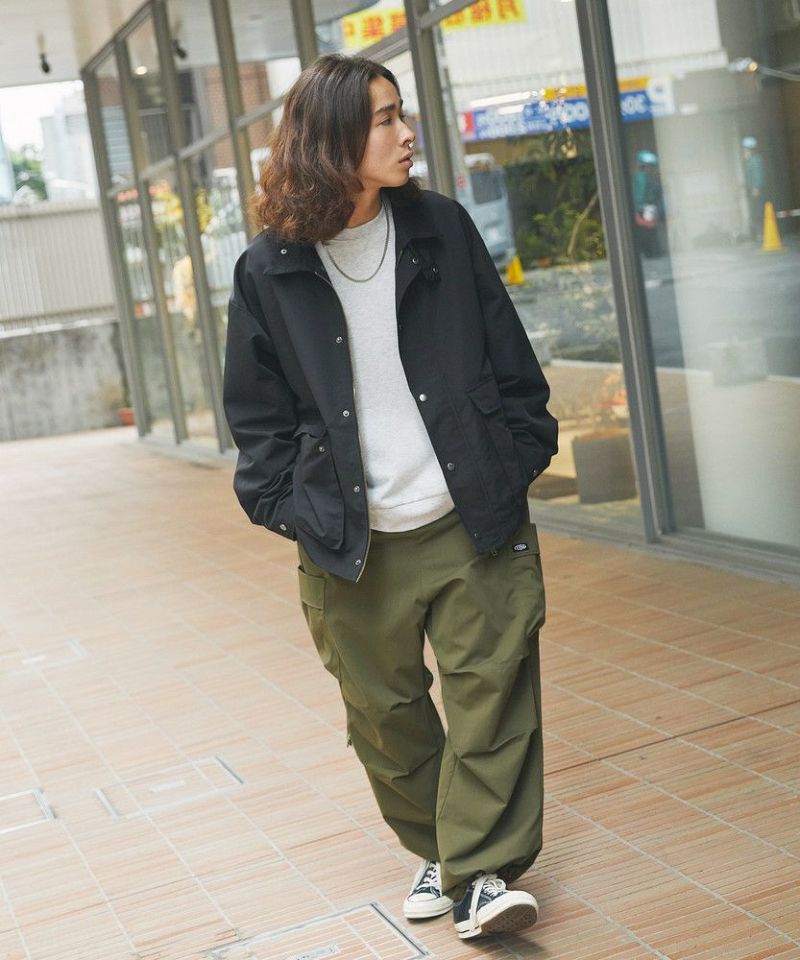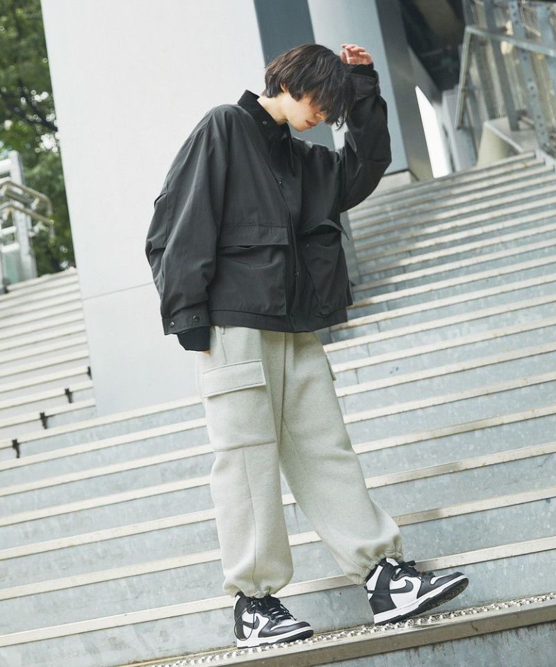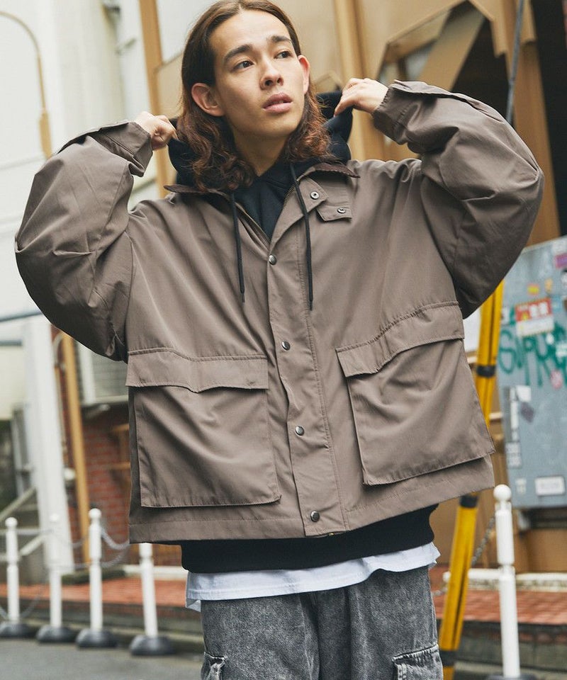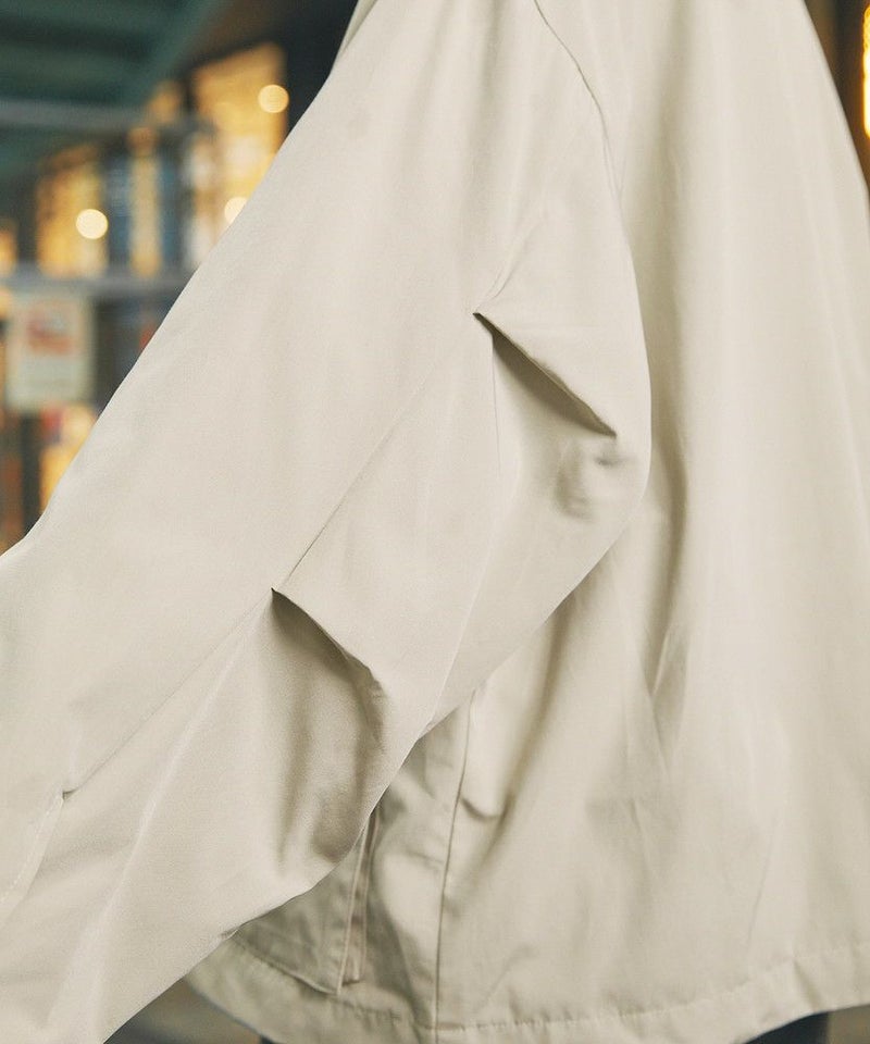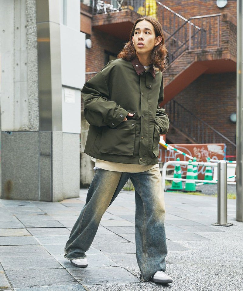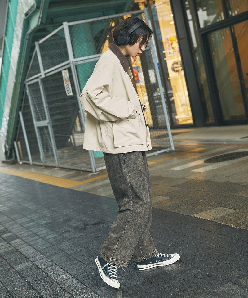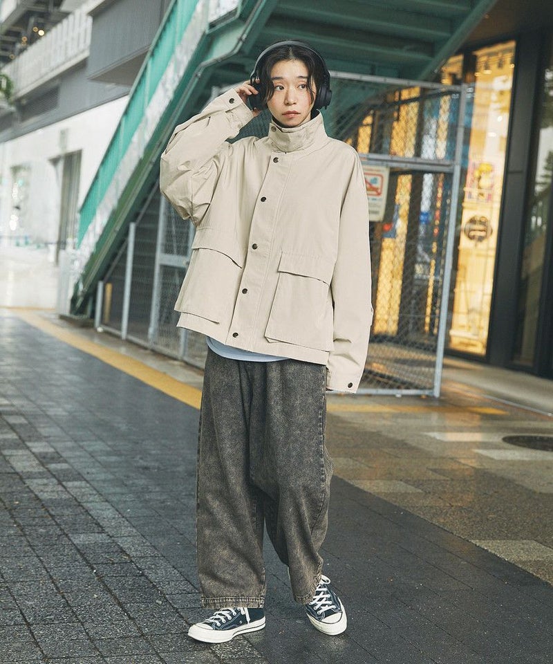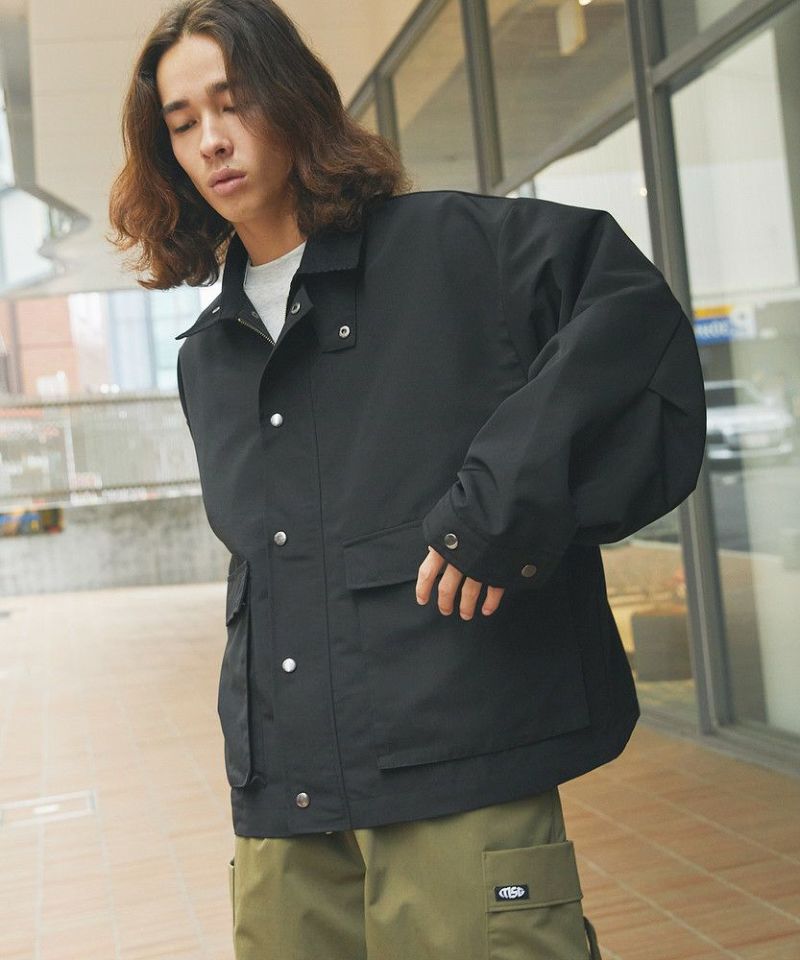 襟部分のコーデュロイ切り替えがポイントのビッグシルエットブルゾン。程よくゆとりをもたせたシルエットで、ラフな着こなしが楽しめるサイズ感に仕上げました。大き目のボタン付フラップポケットやジップ&スナップボタンの前立てなど、実用的なディテールが満載です。さらに襟元のチンストラップを閉めてハイネック仕様にもなる2way仕様。コーデに合わせたアレンジを楽しめて、防寒・防風性もアップします。ユニセックスで着用可能なので、男女問わず手軽に旬のコーディネートが楽しめるアイテムです。