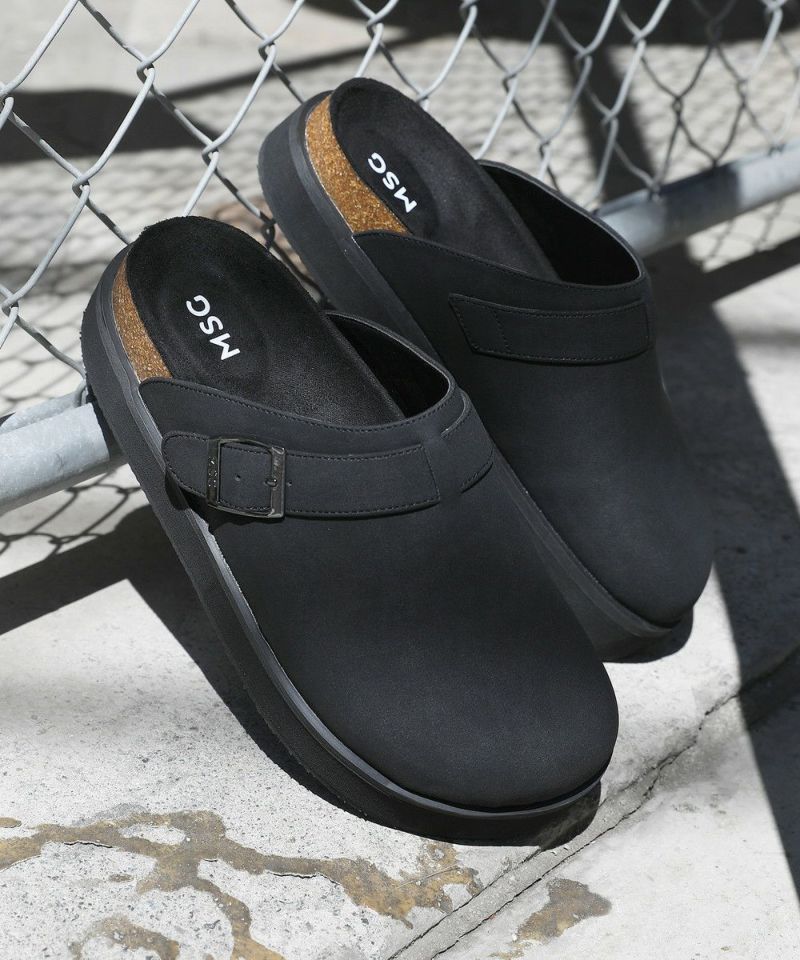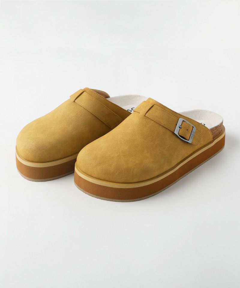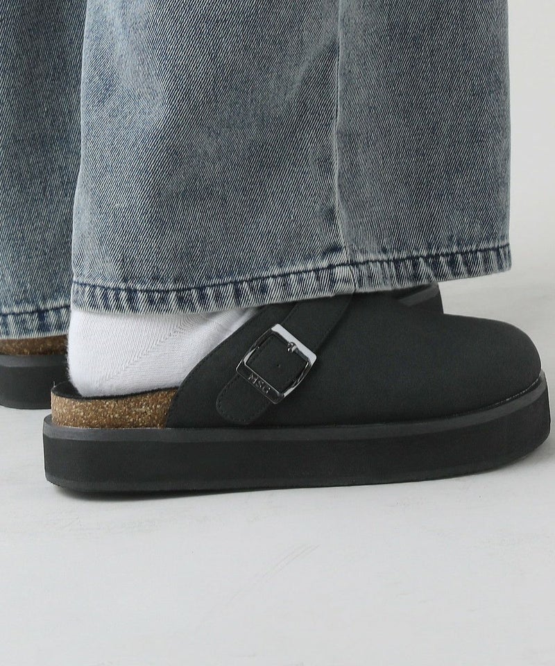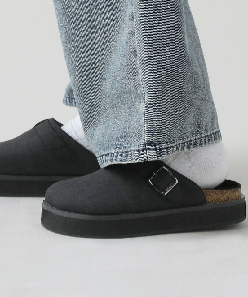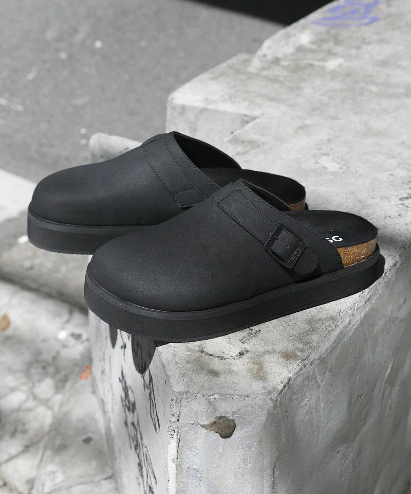 さっと脱ぎ履きしやすいラクな穿き心地と抜け感が魅力のスリッポンです。サボのように足のつま先から甲を覆ったデザインで、露出したかかと部分がリラックス感を感じさせます。甲部のシルエットに丸みがあり、コルク風の靴底を使用しているのが特徴的。かかとは足の収まりがいいカップ状で、指先まで足の形状にフィットしやすよう形取られています。アッパーのベルトを調節してフィット感を微調整することが可能で、バックルに入ったブランドロゴもさり気ないアクセントに。