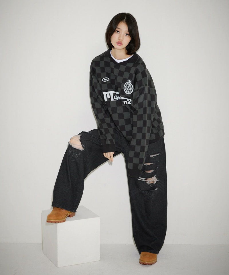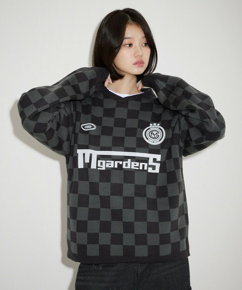トレンドのスポーツミックススタイルが叶うユニフォームニット。胸元のロゴプリントや、襟の配色ラインがスポーティーな印象のアイテムです。 ブラックは無地にロゴプリントと襟のホワイトラインが映えるデザイン。オフは無地に袖、裾のブラックの配色がアクセントに。ブラック-チャコールはチェッカー柄、ブラック-レッドはストライプ柄の4配色です。ゆるっと着こなせるオーバーサイズでレディース、メンズ問わずお使い頂けるユニセックスアイテムです。