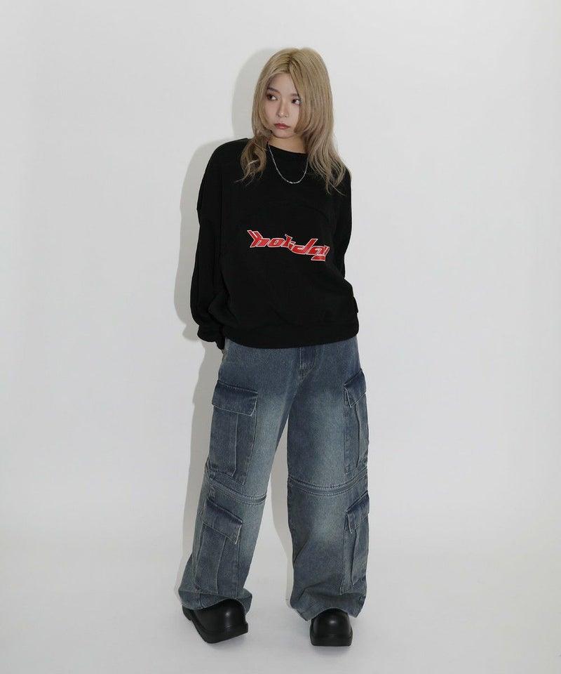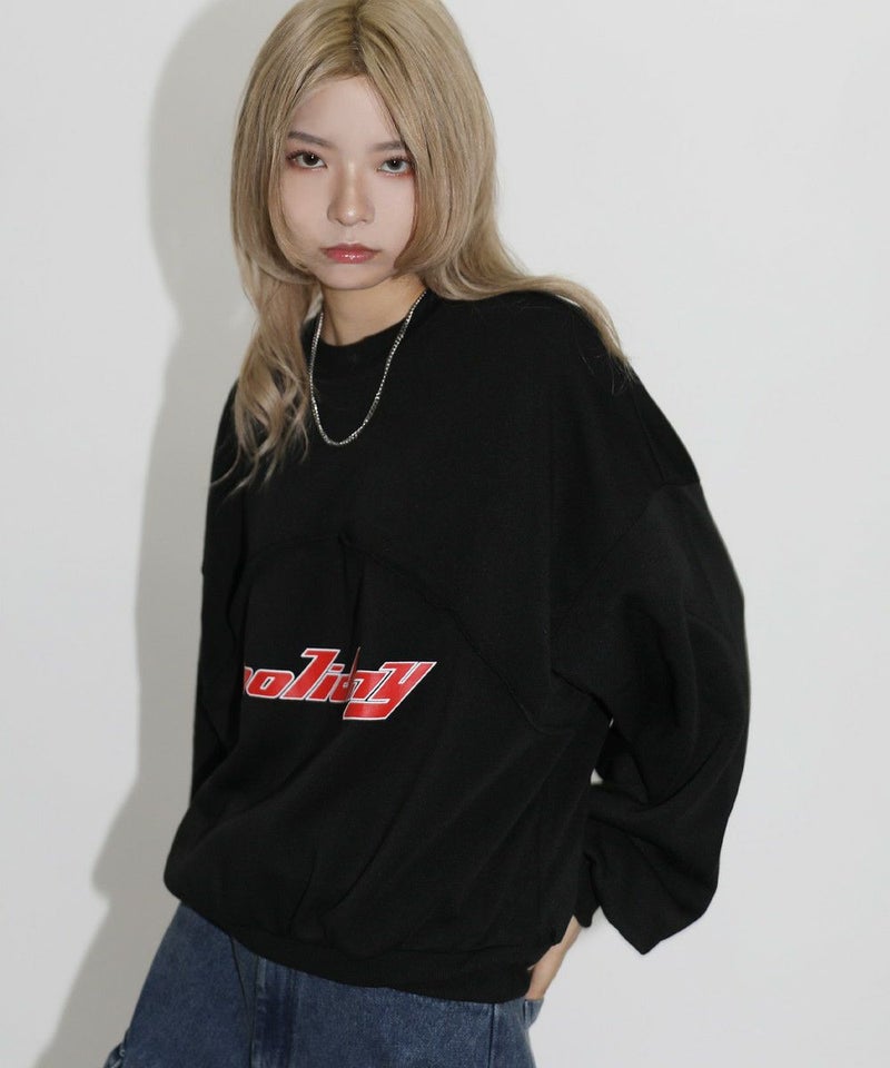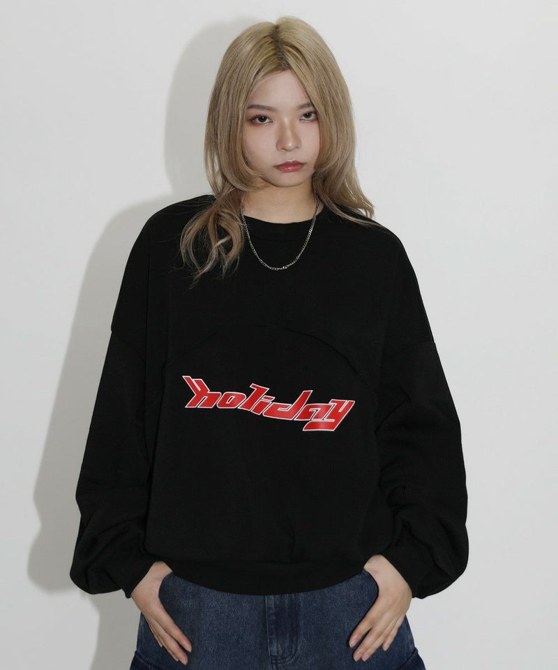 パネルの切替デザインが特徴のクルーネックスウェット。フロントのロゴプリントと切り替えデザインがアクセントに。ややワイドな身幅&ドロップショルダーでリラックス感溢れるビッグシルエットで仕上げました。袖は大きくゆとりを持たせ、裾は程良くたまりができるバルーンスリーブデザイン。