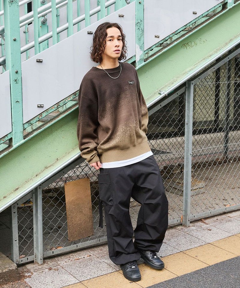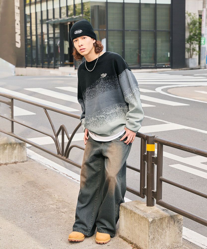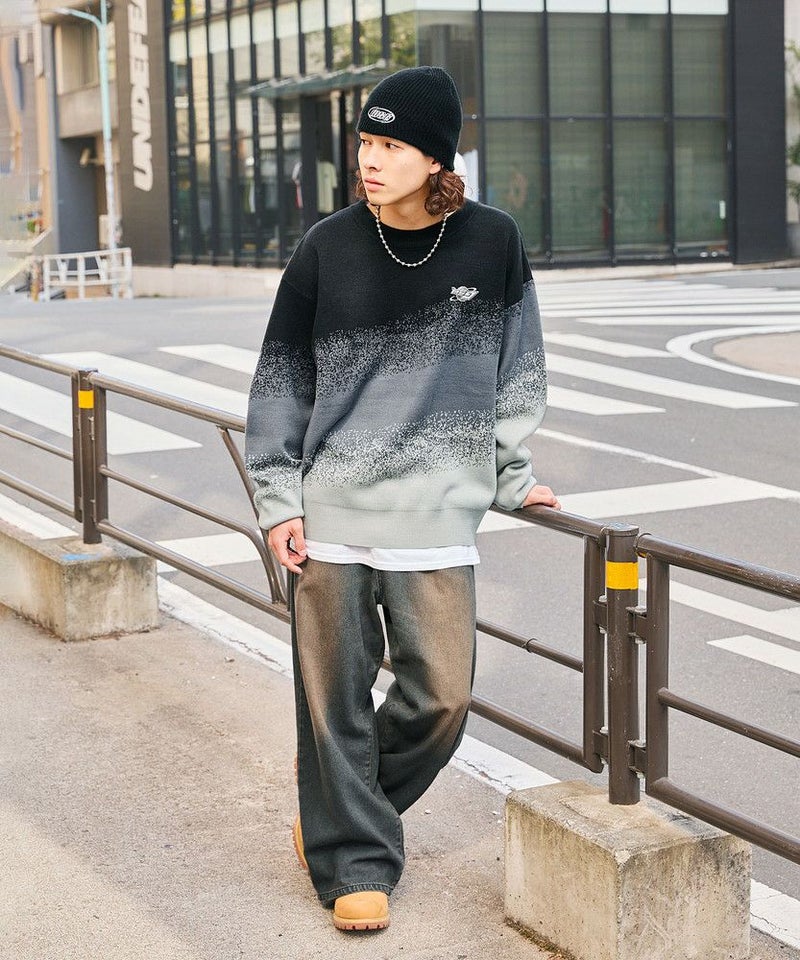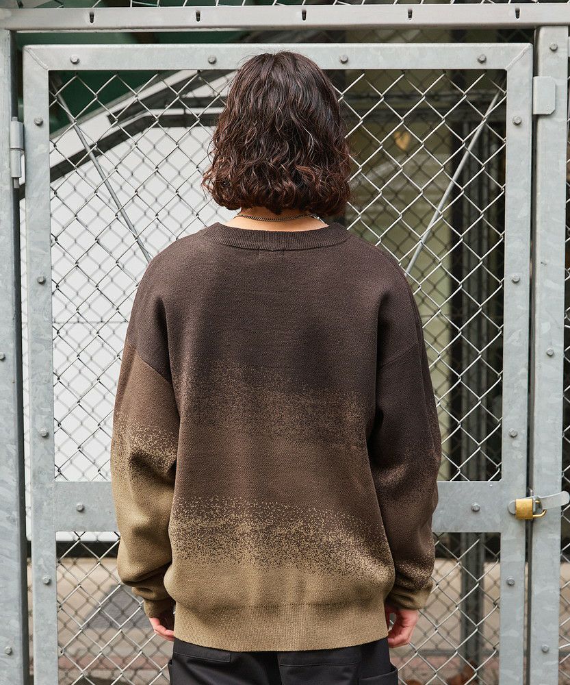 1枚でコーディネートがサマになるグラデーションニット。インパクトがありながらも落ち着いた配色で、コーディネートに取り入れやすいアイテムです。デニム、カーゴパンツ、ワイドパンツなどとの相性抜群。秋から冬、春先にかけて合わせやすい一着です。