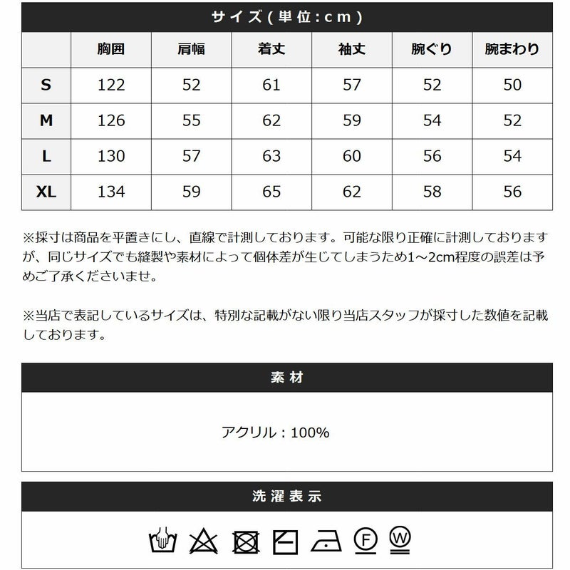 チクチクしにくく、お手入れも簡単なアクリル100%素材を使用。柔らかい着心地で快適に過ごせます。袖口や裾はリブ編みで、程よく身体にフィットします。