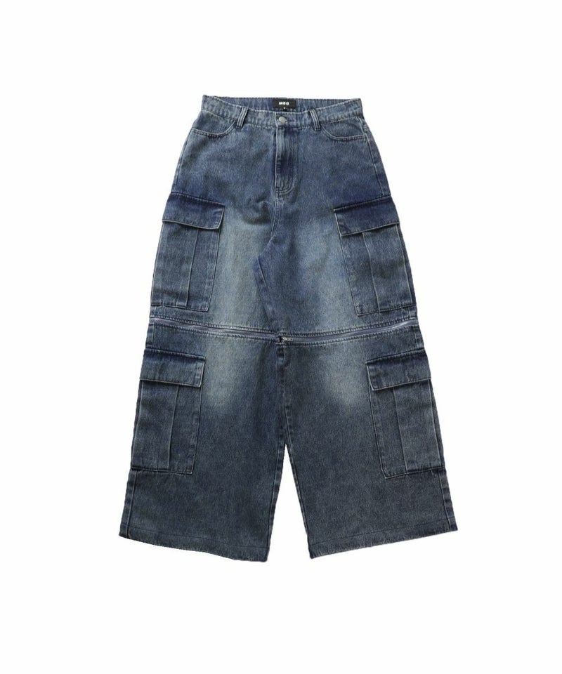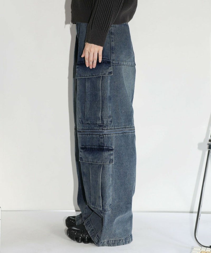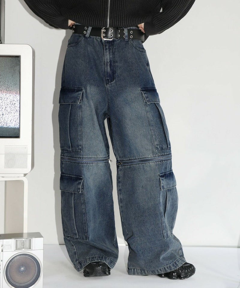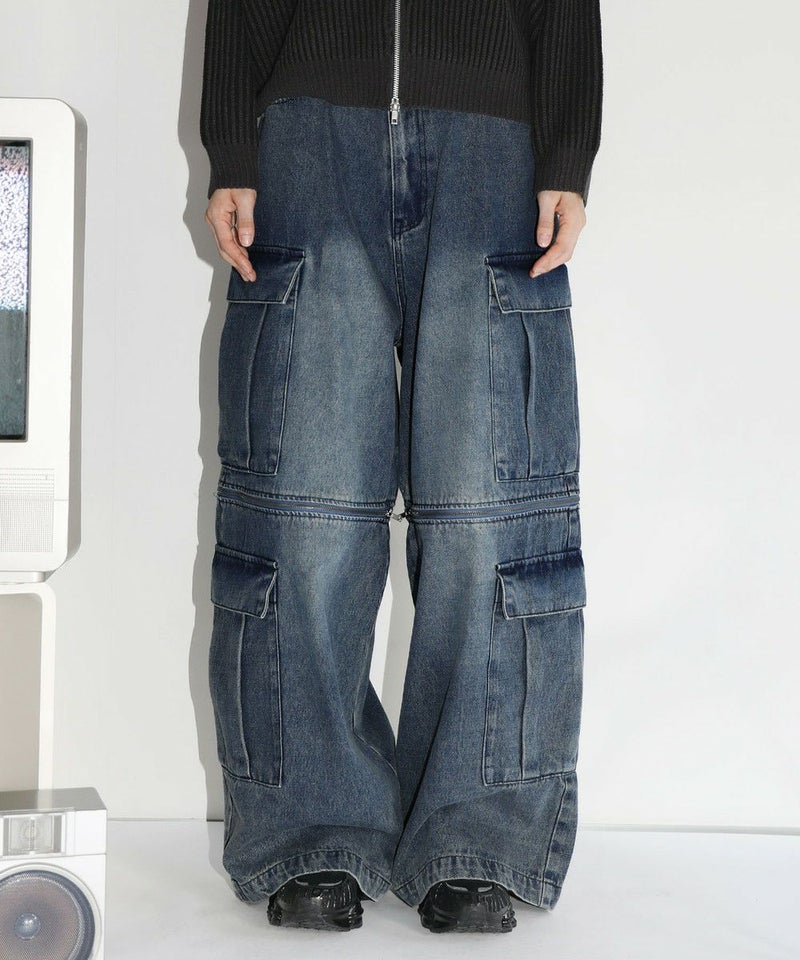 膝に配されたジッパーにより着脱可能な2WAY仕様のカーゴデニムパンツ。切り離しが可能なデタッチャブル仕様で、ジッパーを少し開けて立体感を出したり、ハーフパンツとしても着用することが可能。ヴィンテージ感ある、フロントやヒップに色落ち加工を施した雰囲気のある仕上がり。ゆったりとしたワイドストレートシルエットがこなれ感のある着こなしを演出します。サイドにカーゴポケットを配置し、収納力抜群。レディース、メンズ問わずお使い頂けるユニセックスアイテムです。