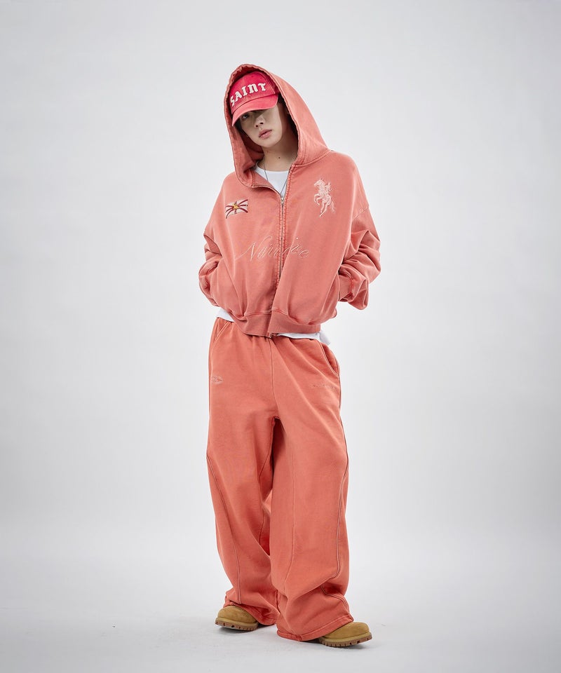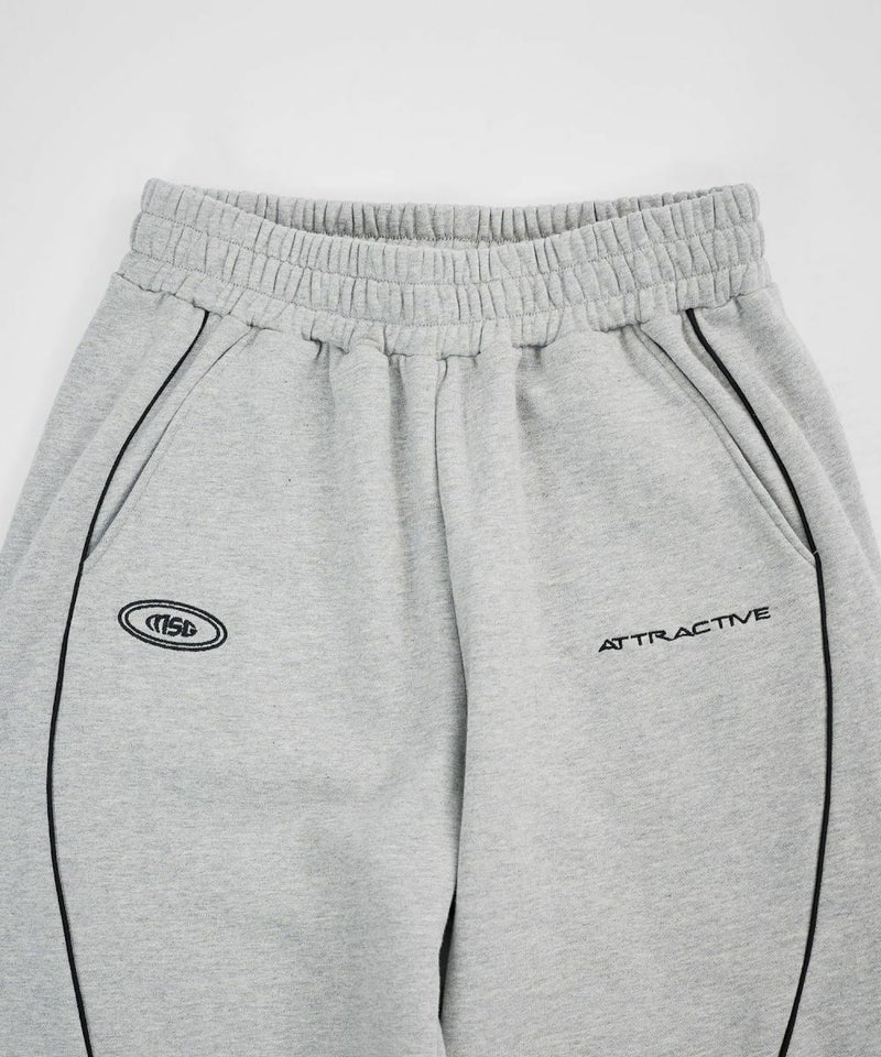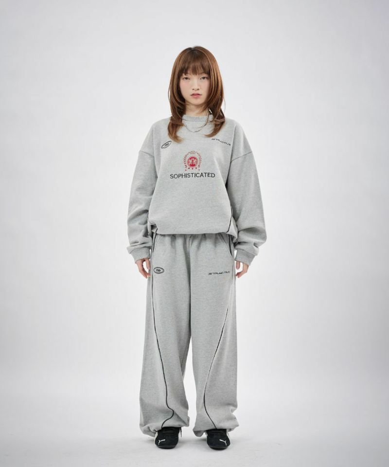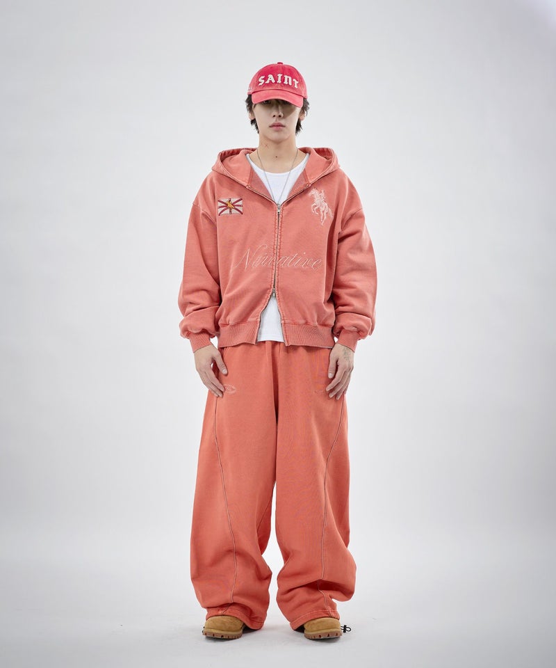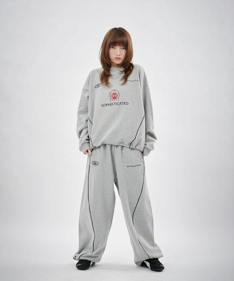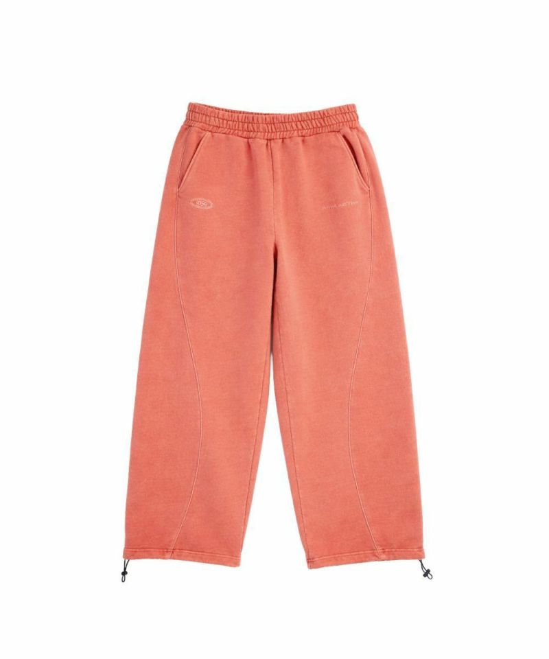 フロントにはロゴプリントとエンブレム刺繍を施し、パイピングディテールをアクセントにプラス。シンプルながらも存在感があり、トップスを選ばずスタイリングの軸になるデザインです。リラックス感のあるオーバーサイズシルエットで、動きやすさと快適な穿き心地を両立。ウエストはゴムと紐のイージー仕様で、ストレスフリーに着用できます。裾にはドローコードを備え、絞り具合によって丈感やシルエットの調整が可能です。