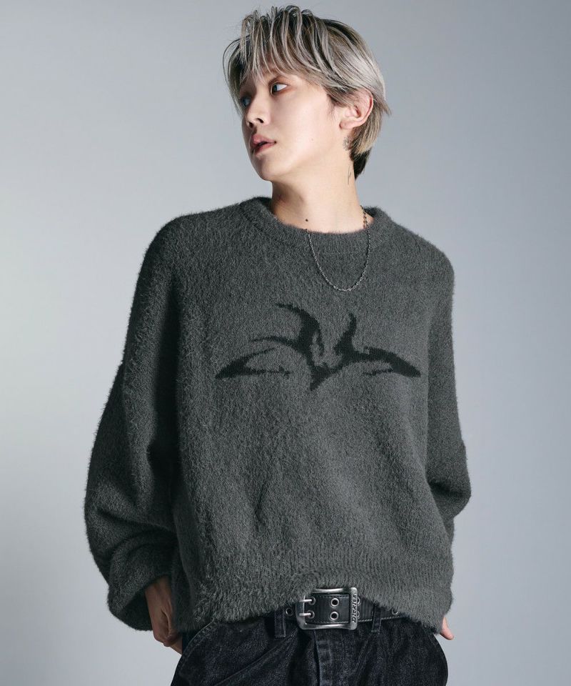 柔らかな色味と風合いある生地感が特徴のフェザーニット。ブランドロゴをグラフィックでデザインしたアイテム。程よい毛足の長さで肌触りが優しく、ファーのようなふんわりとしたルックスが魅力です。ショート丈&広めの身幅によってリラックス感ある着こなしが可能。レディース、メンズ問わず着用可能です。