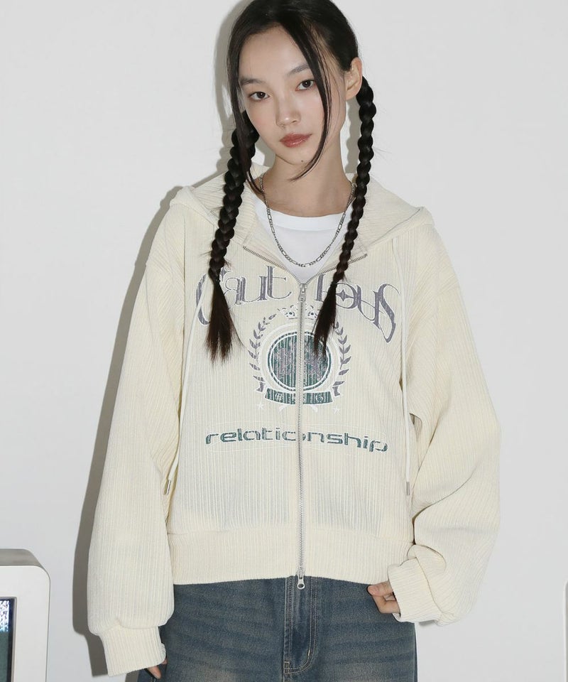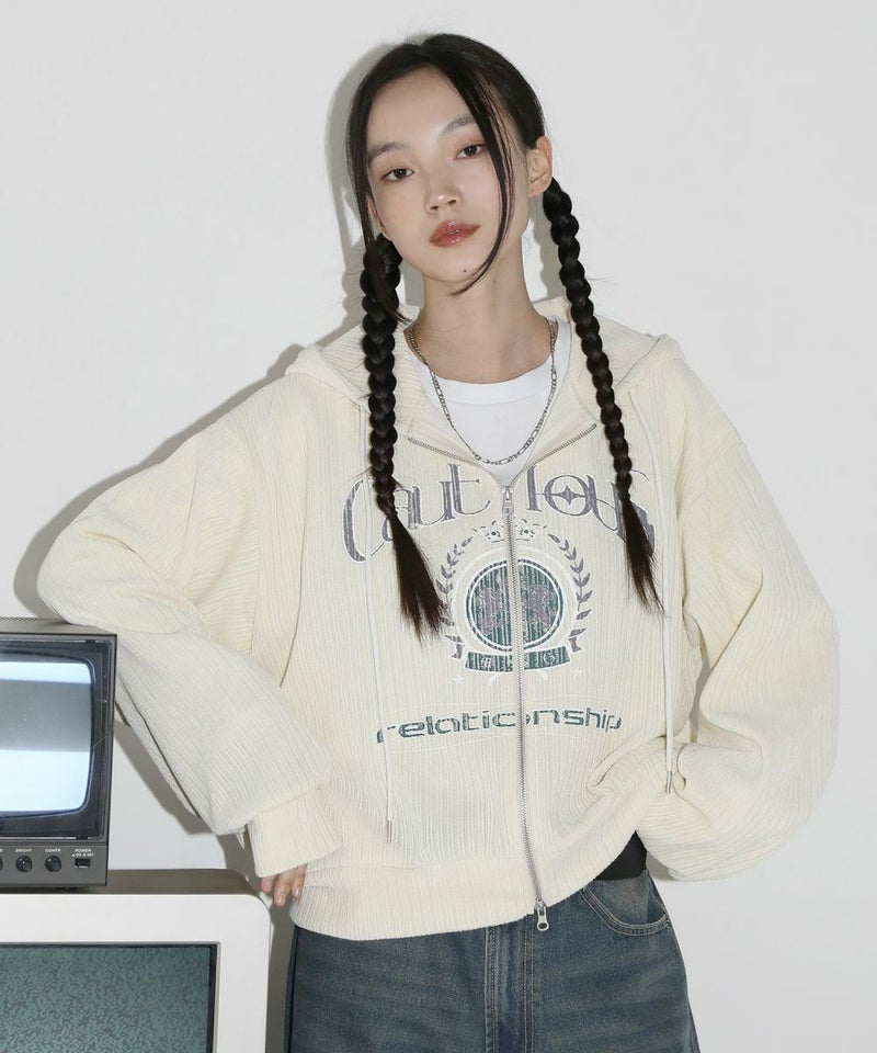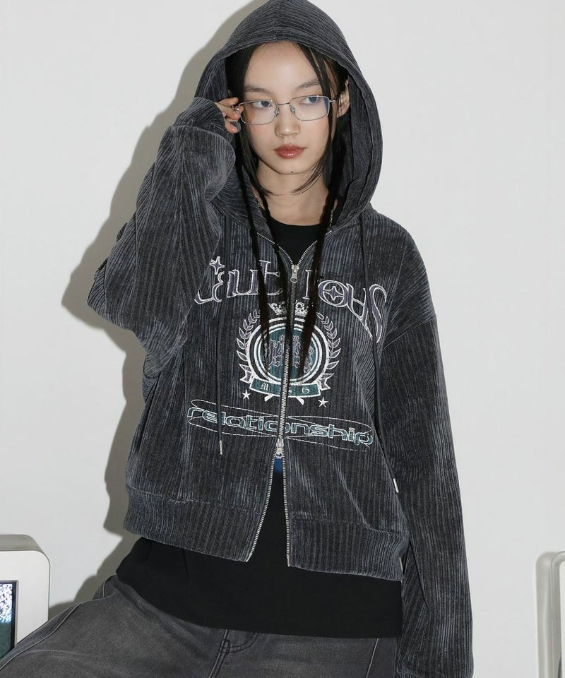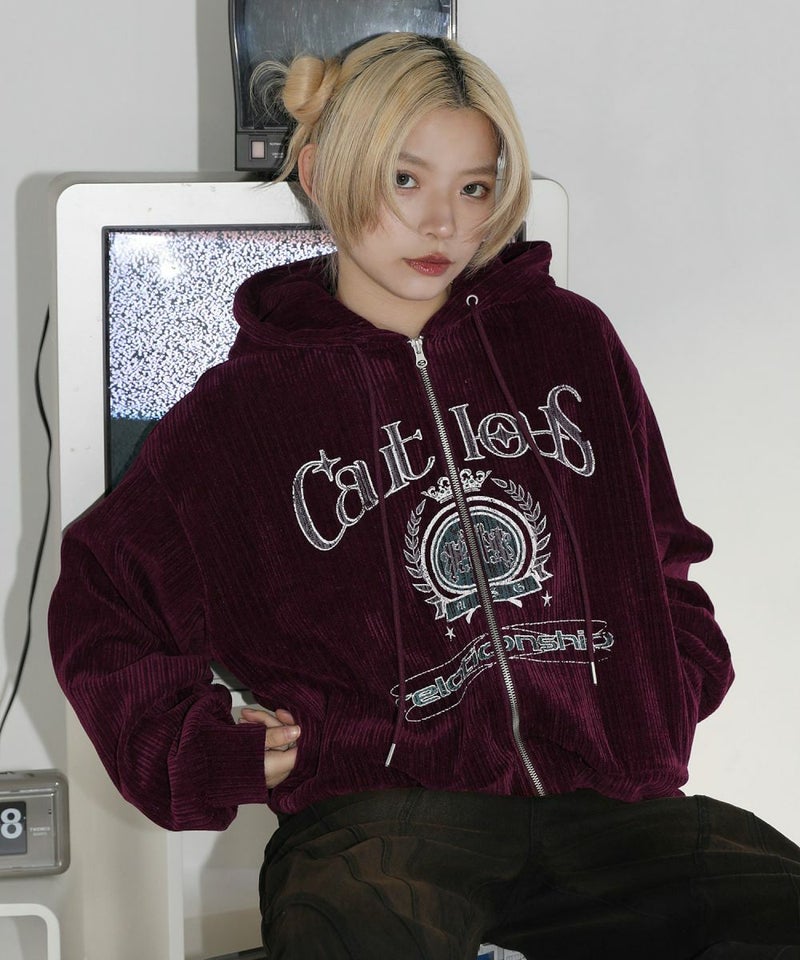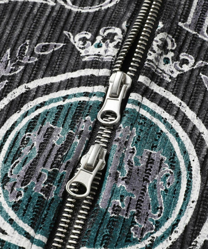 ヴィンテージライクなデザインにコーデュロイ素材を使用したジップパーカー。エンブレムのプリントが施されたフロント部分が、ヴィンテージ感を演出しつつ、洗練された雰囲気を醸し出しています。着丈を短めにしつつも、ゆったりとしたサイズ感で今っぽいシルエットが完成。上下どちらからも開けられるダブルジップ仕様になっており、裾側をオープンにしてインナーを見せるなど、開け方次第で幅広い着こなしを楽しめます。見えないポケットをさりげなく配置しており、デザイン性を保ちながらも実用的な収納スペースを備えています。さらに、フード部分には長めのドロスト紐をあしらい、アクセントとしても機能性としても優れた仕上がりに。男女問わず、ユニセックスで着用可能です。