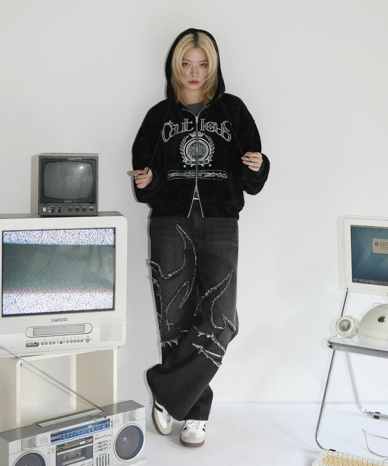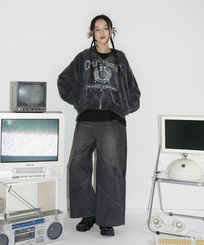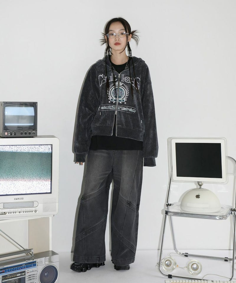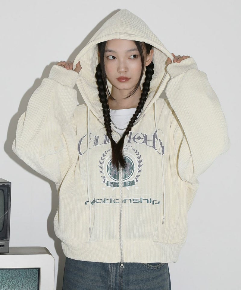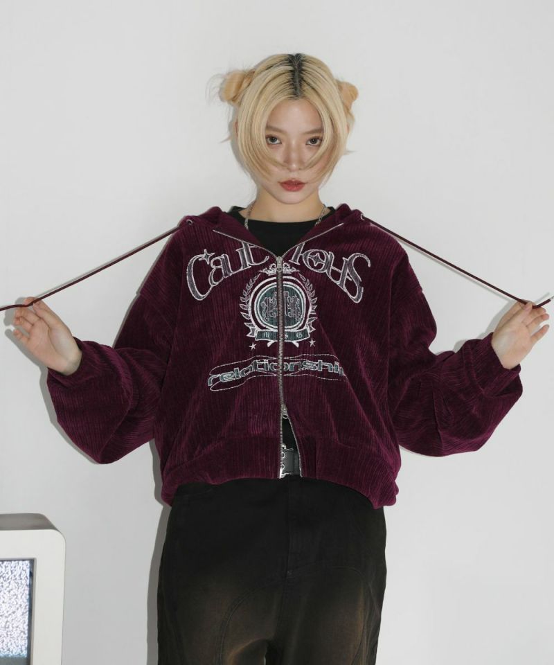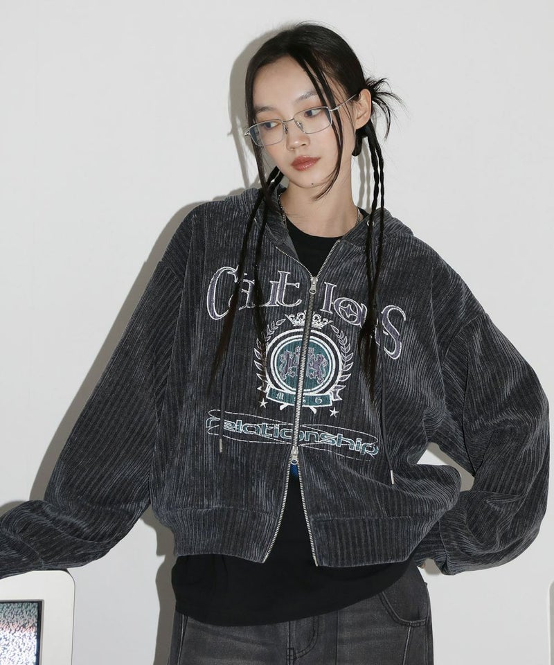 ヴィンテージライクなデザインにコーデュロイ素材を使用したジップパーカー。エンブレムのプリントが施されたフロント部分が、ヴィンテージ感を演出しつつ、洗練された雰囲気を醸し出しています。着丈を短めにしつつも、ゆったりとしたサイズ感で今っぽいシルエットが完成。上下どちらからも開けられるダブルジップ仕様になっており、裾側をオープンにしてインナーを見せるなど、開け方次第で幅広い着こなしを楽しめます。見えないポケットをさりげなく配置しており、デザイン性を保ちながらも実用的な収納スペースを備えています。さらに、フード部分には長めのドロスト紐をあしらい、アクセントとしても機能性としても優れた仕上がりに。男女問わず、ユニセックスで着用可能です。