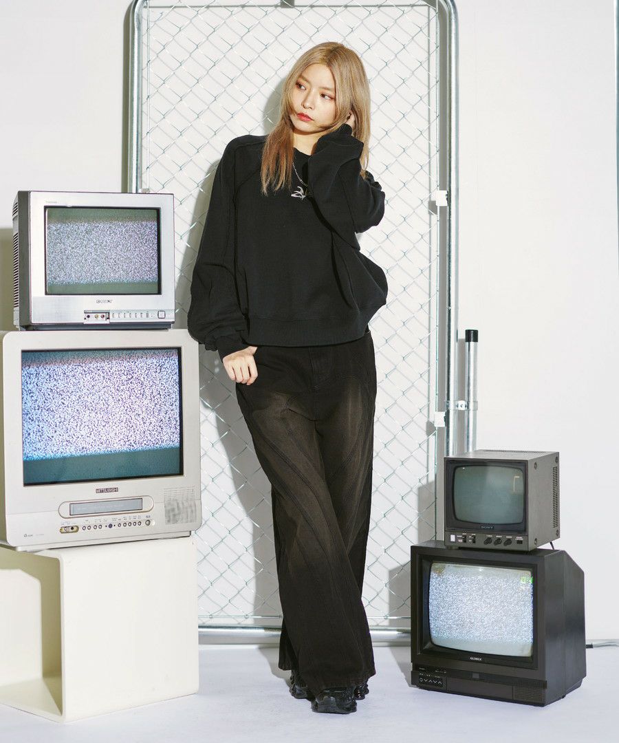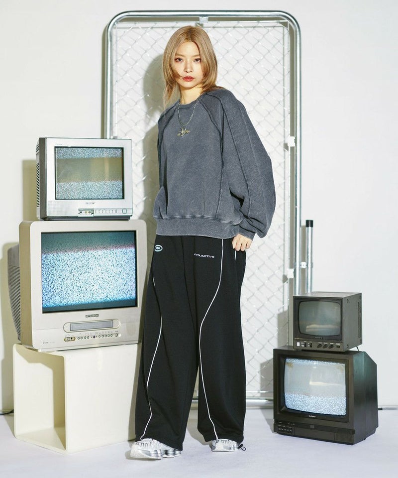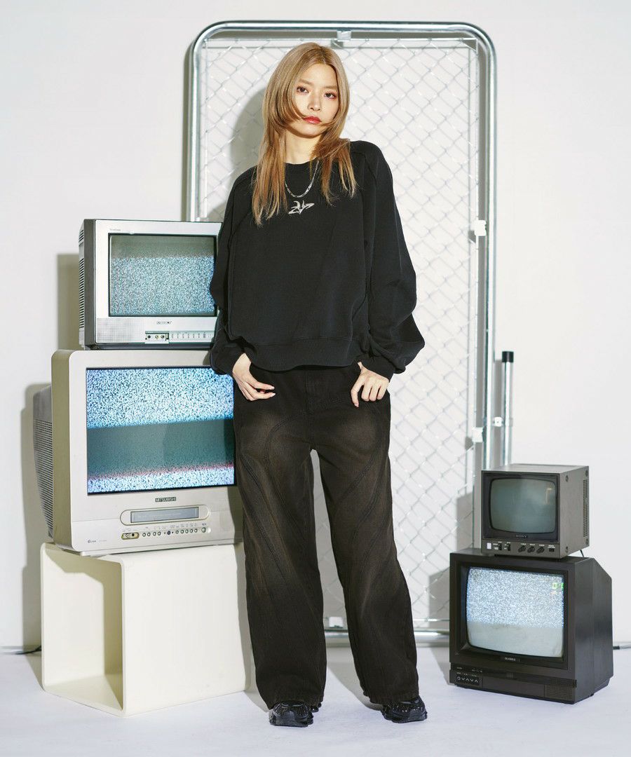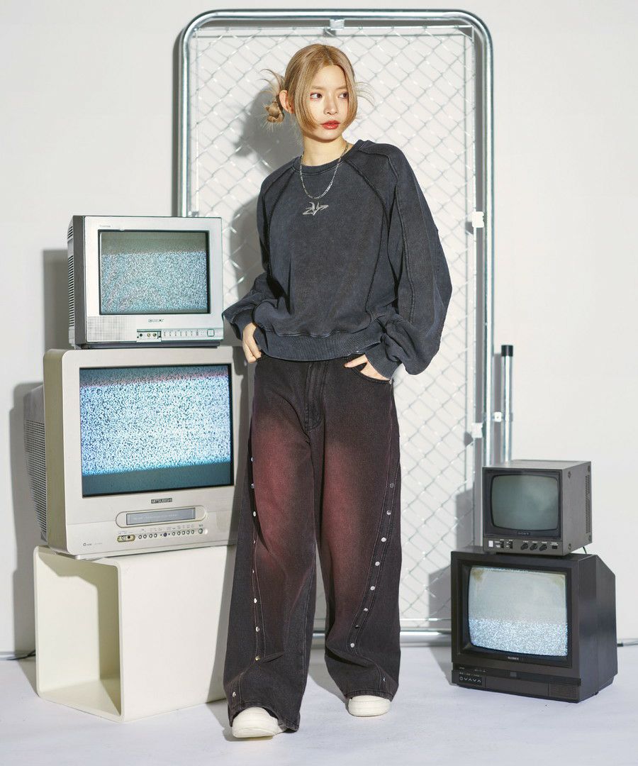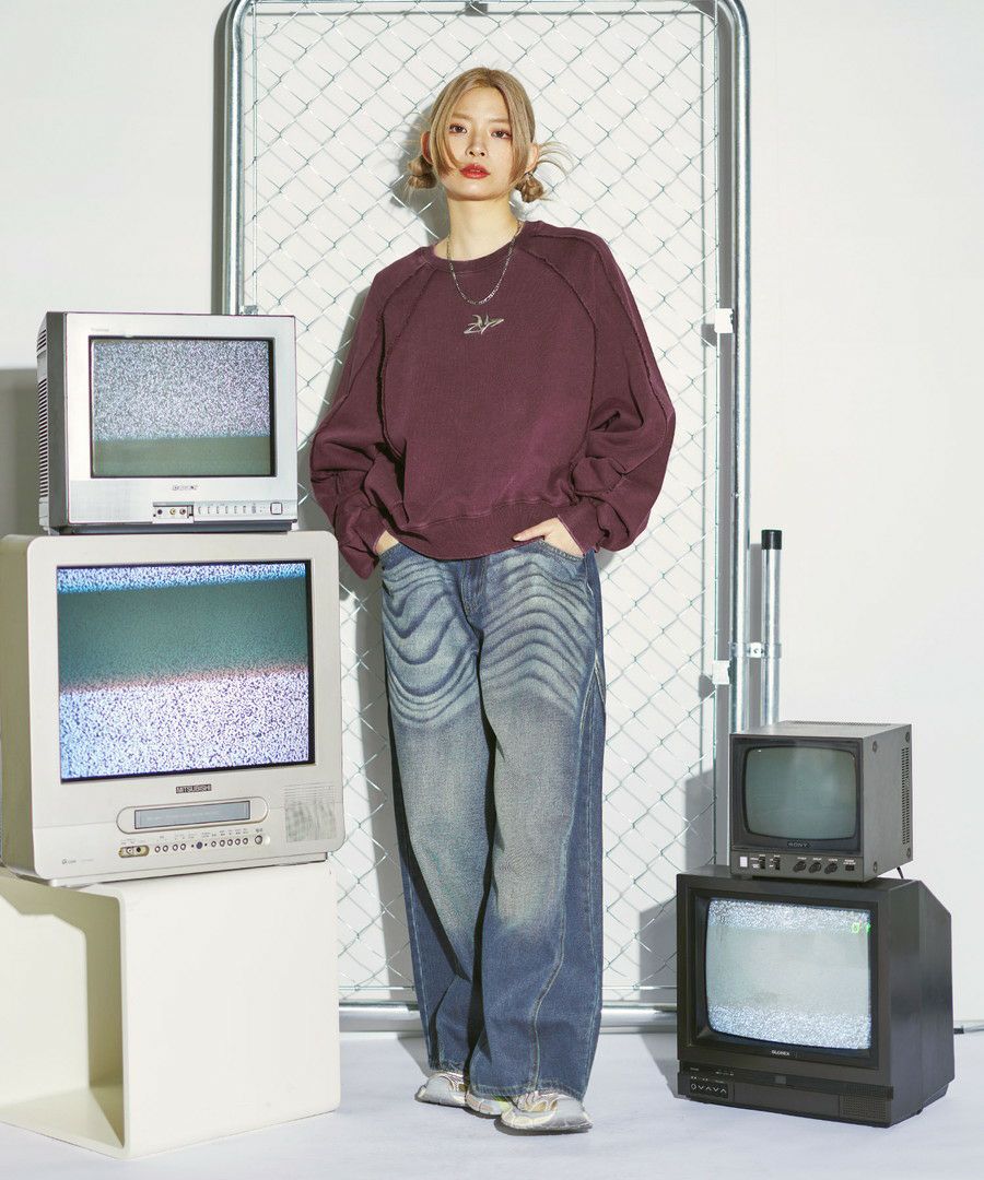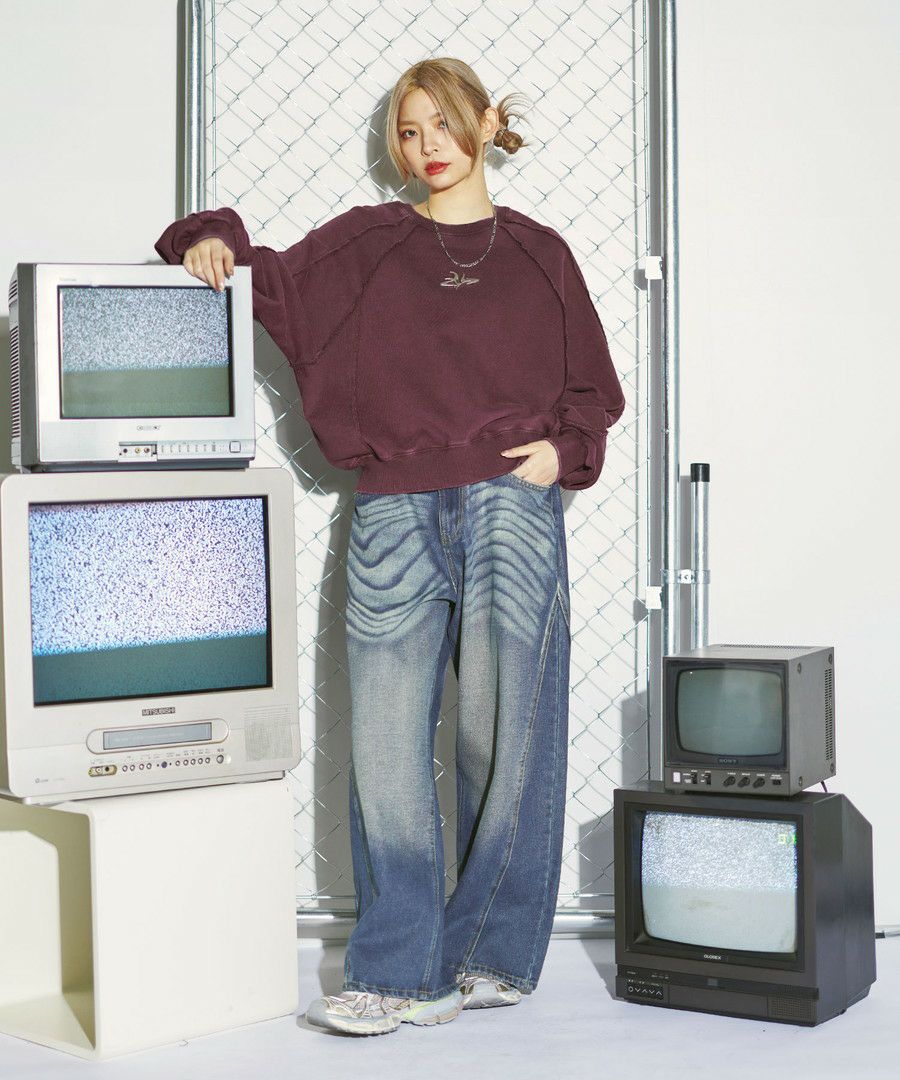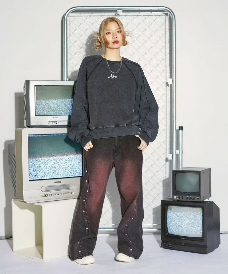 オーバーダイ/ウォッシュ加工オーバーサイズウェーブ切替ワイドストレートバギーデニムパンツ 11.5oz