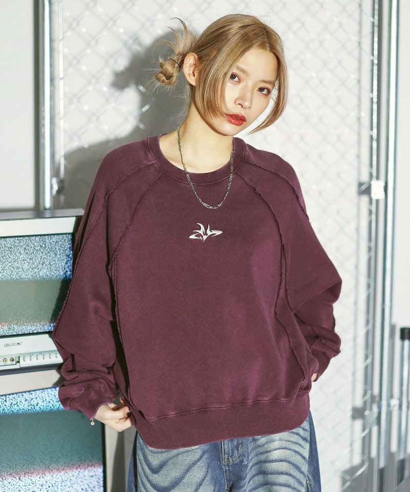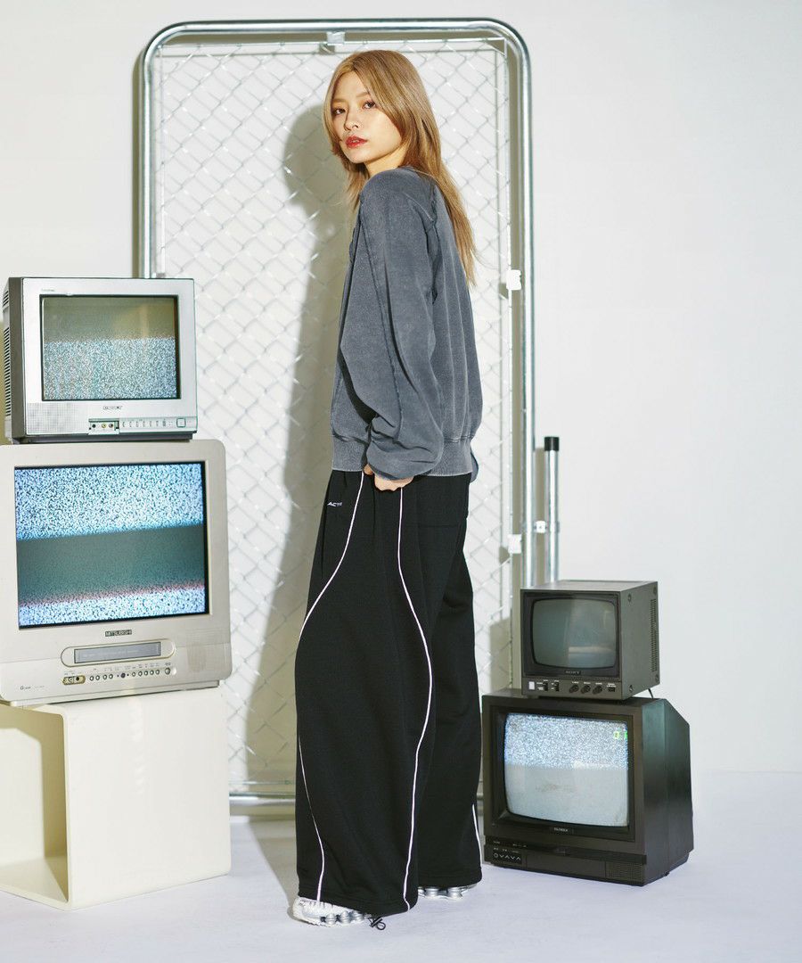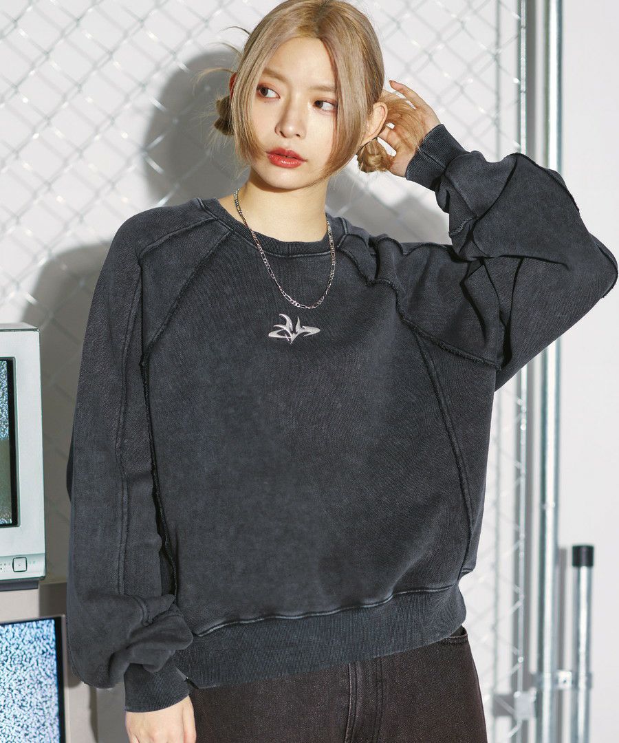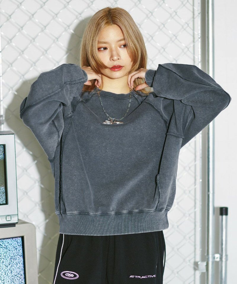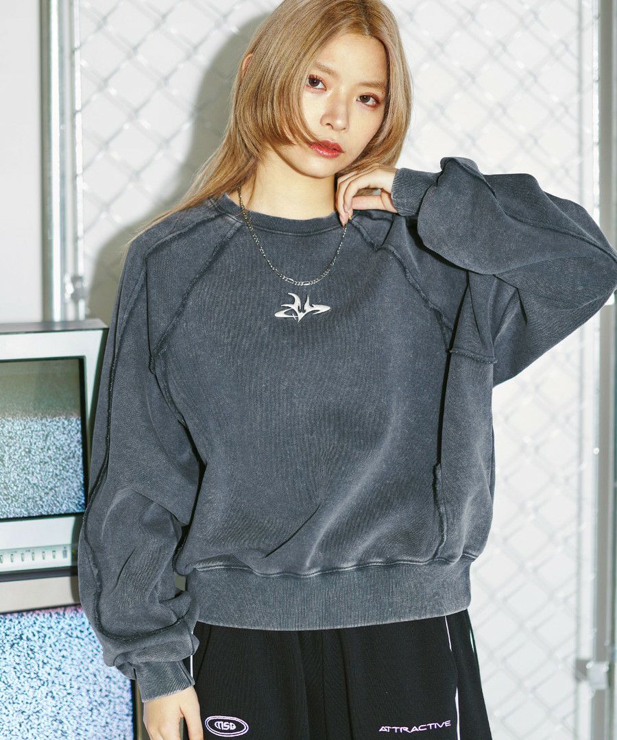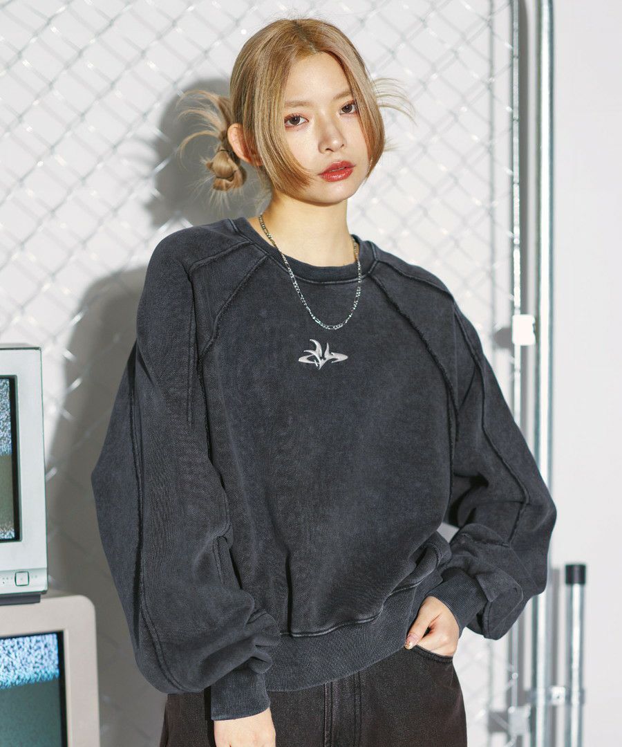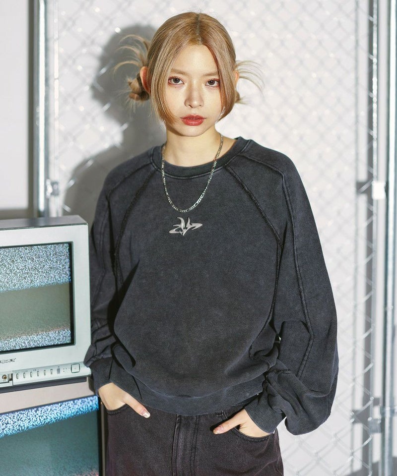 オーバーダイ/ウォッシュ加工オーバーサイズウェーブ切替ワイドストレートバギーデニムパンツ 11.5oz