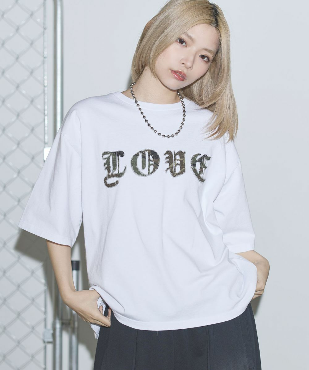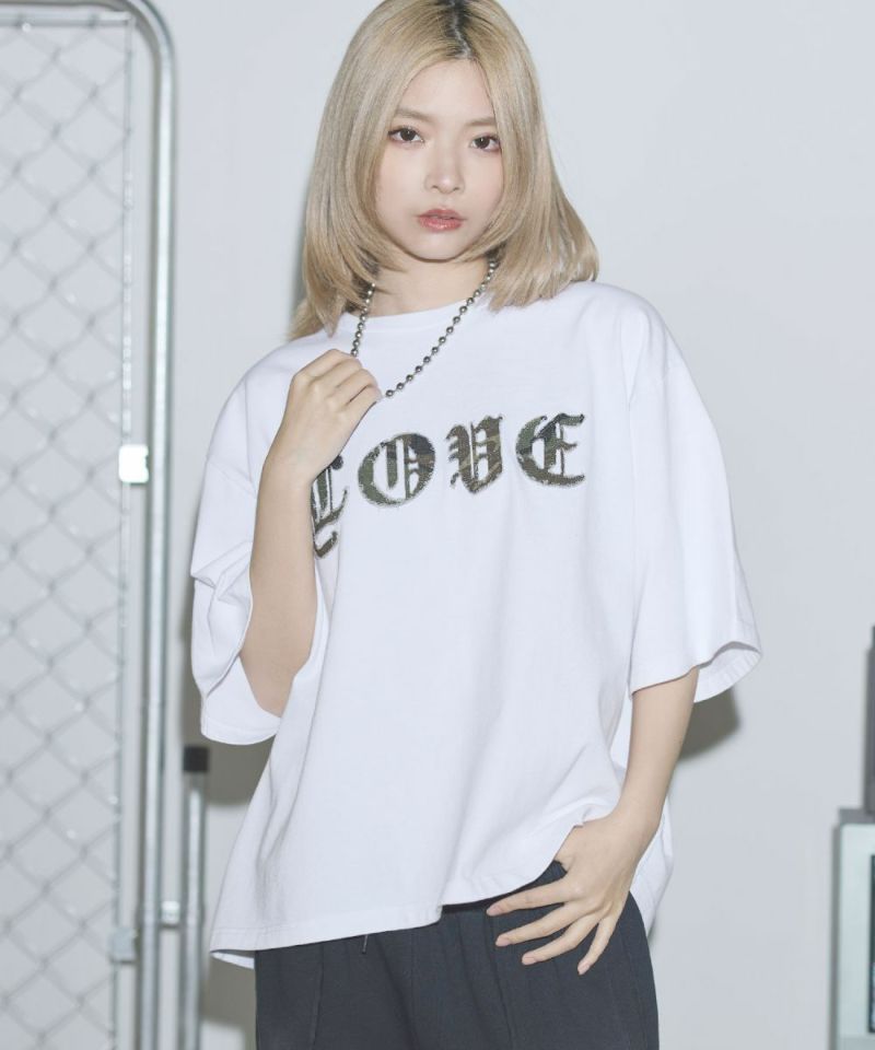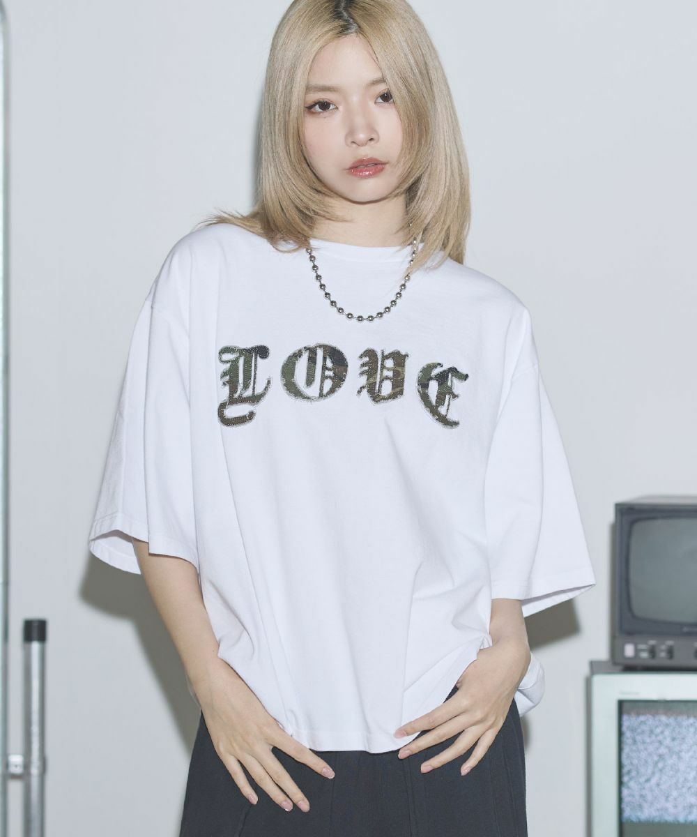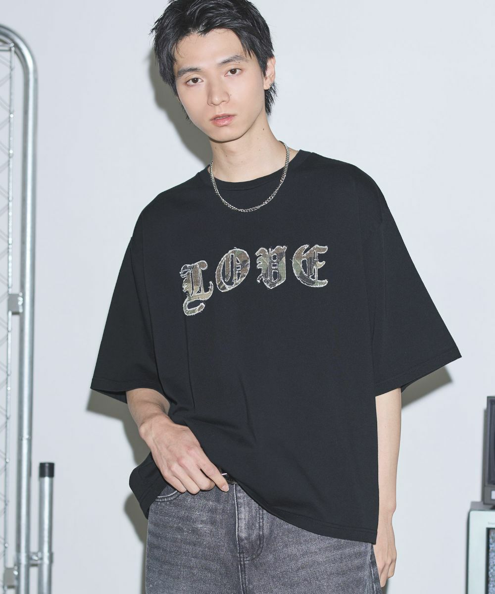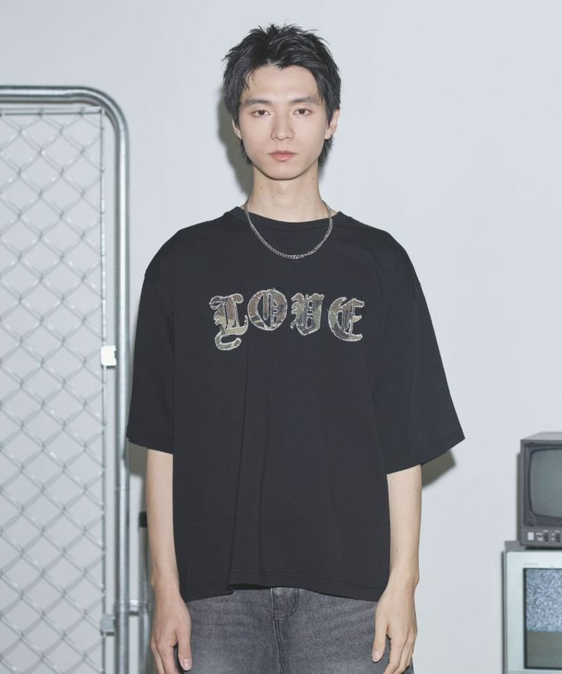 ・“LOVE”のロゴパッチが目を引くTシャツ。