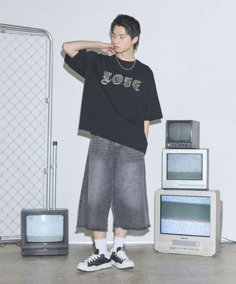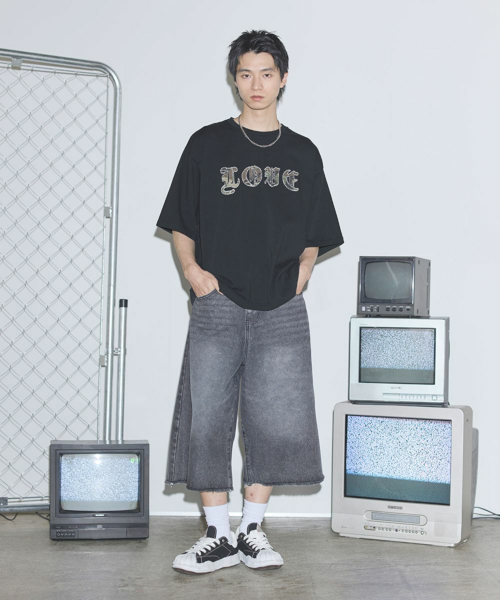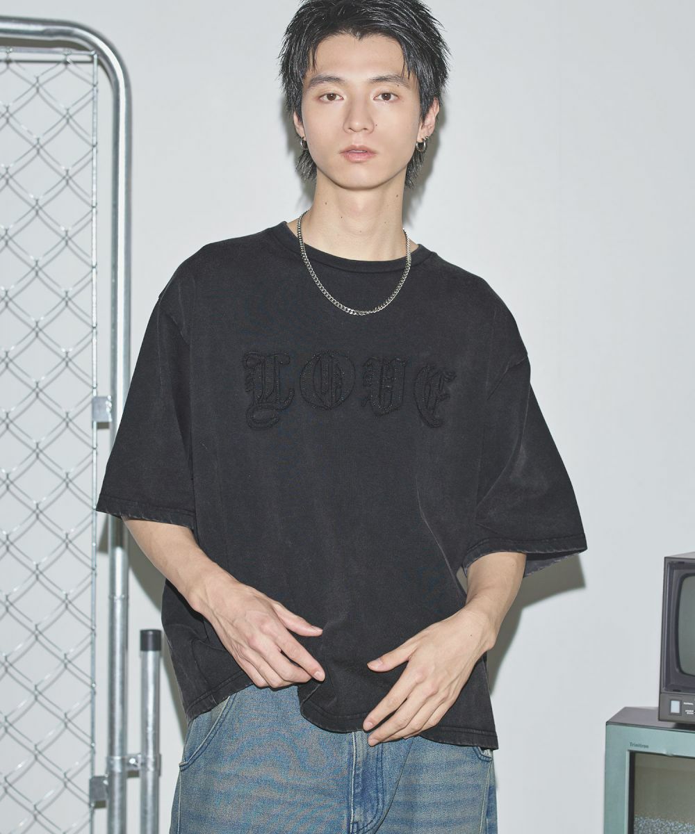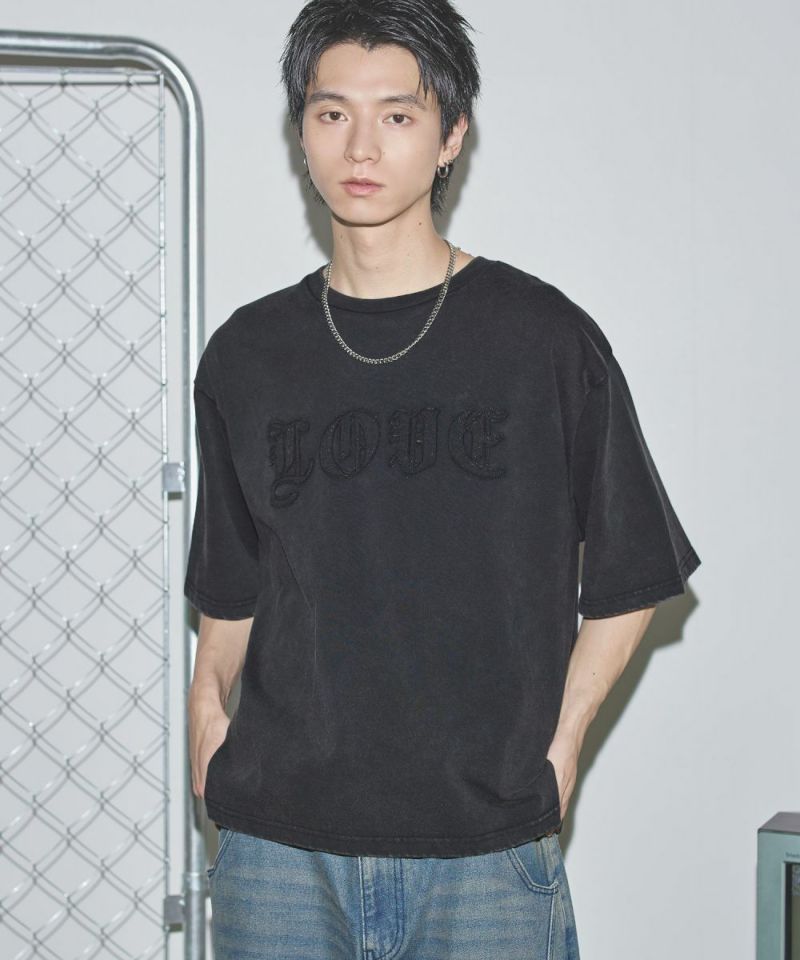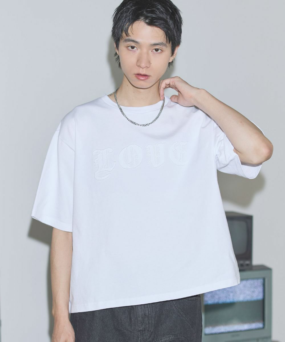 ・“LOVE”のロゴパッチが目を引くTシャツ。