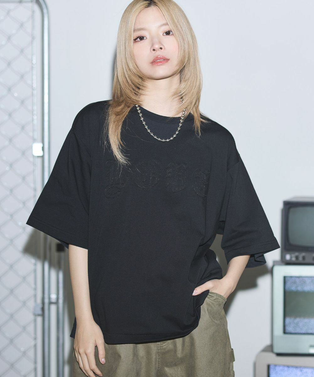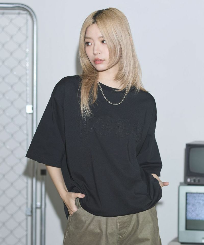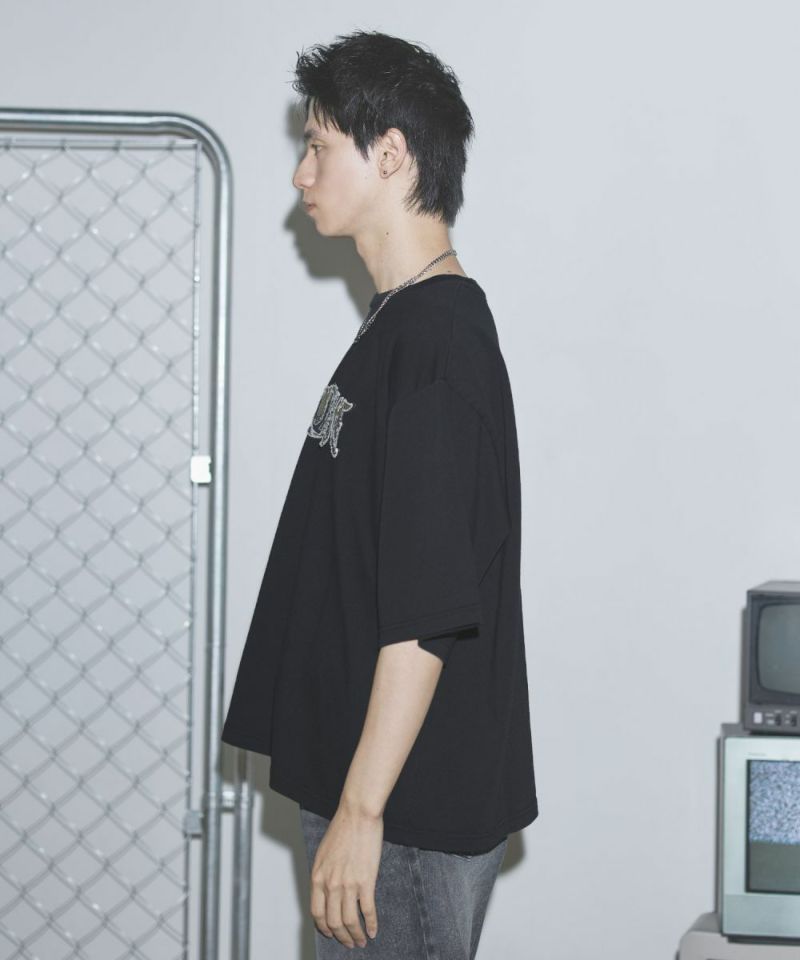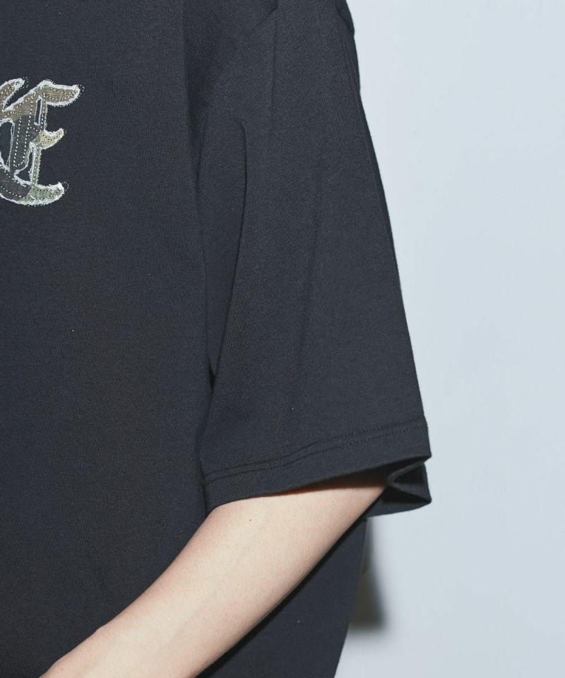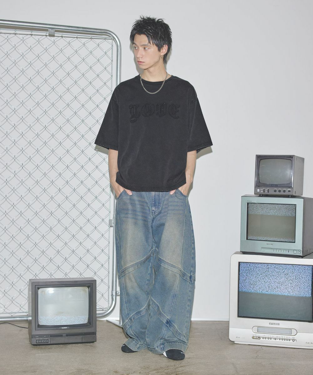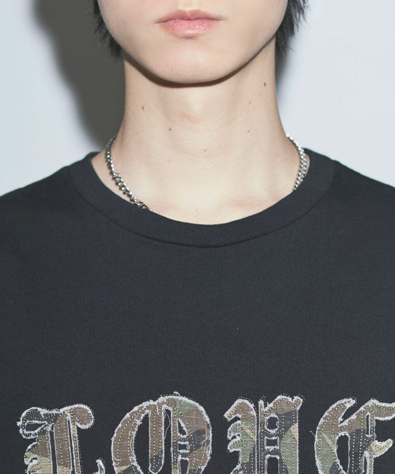 ・“LOVE”のロゴパッチが目を引くTシャツ。