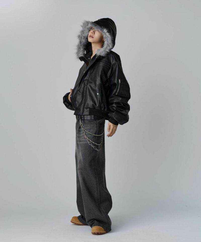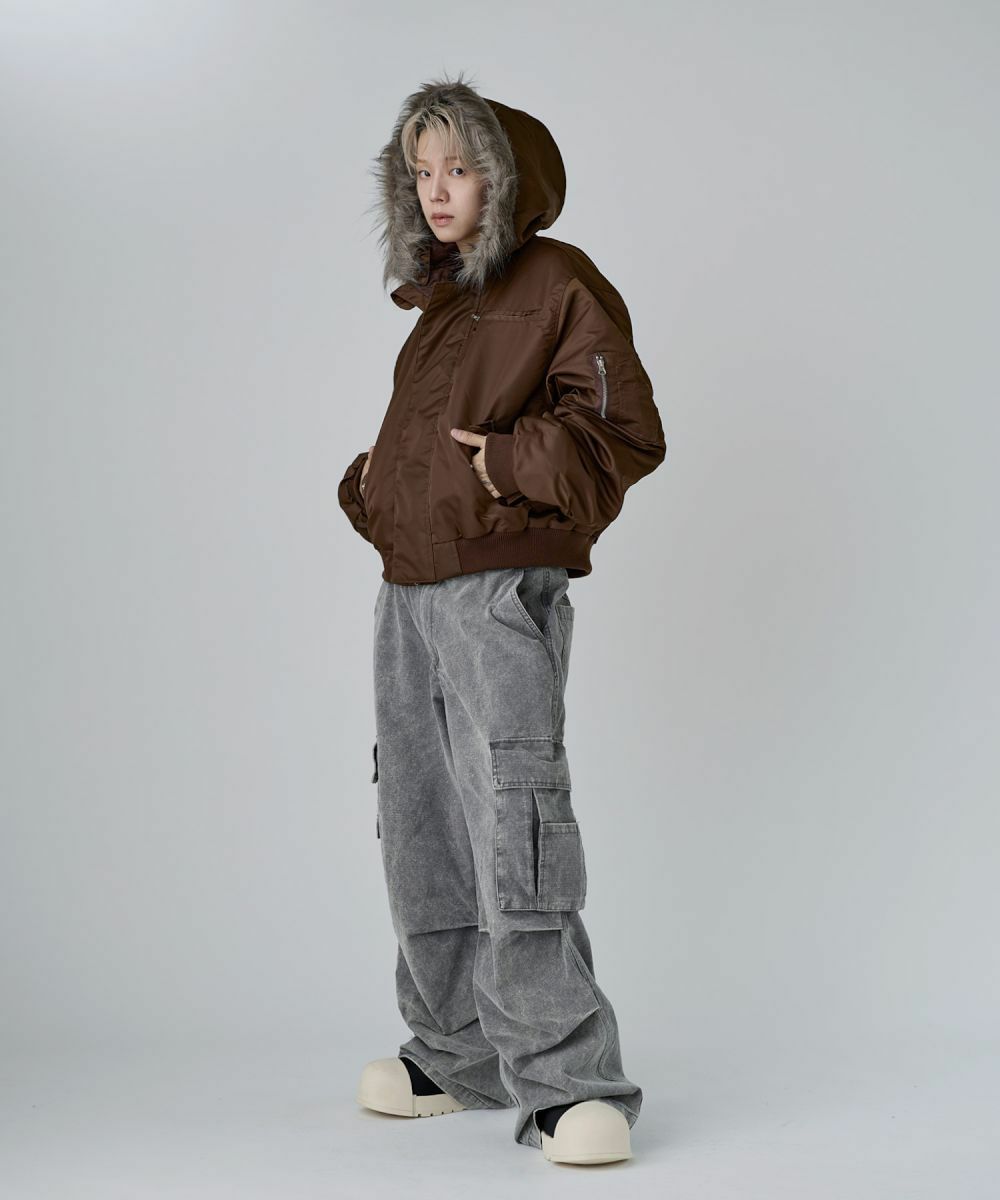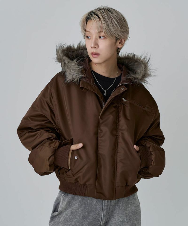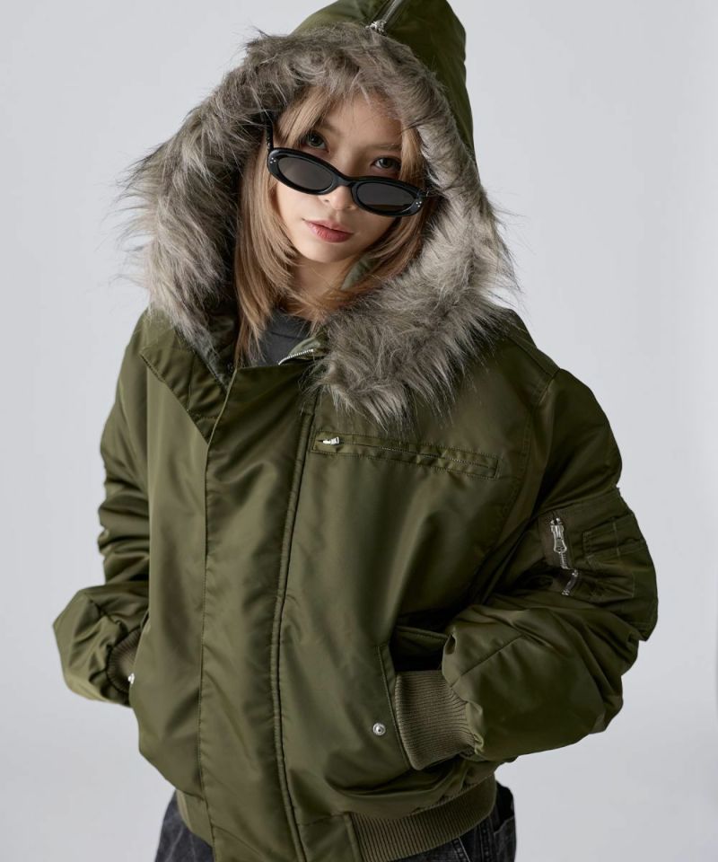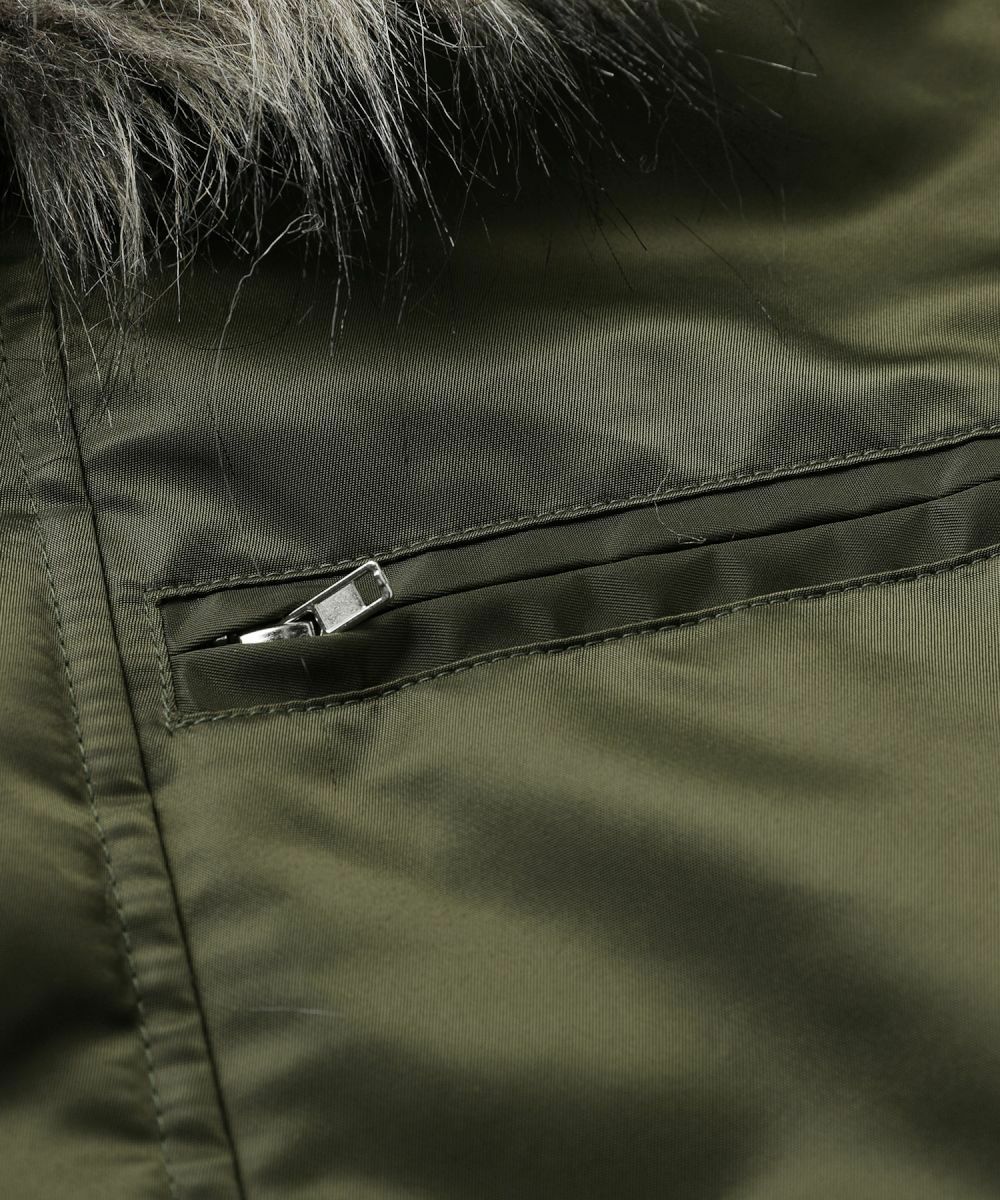 ・また取り外しの可能なファーを取り付け、開閉のできるジッパー付きの大きめのフードが特徴的な一着。
