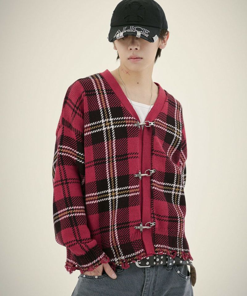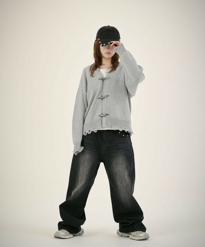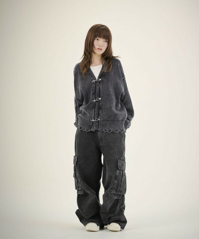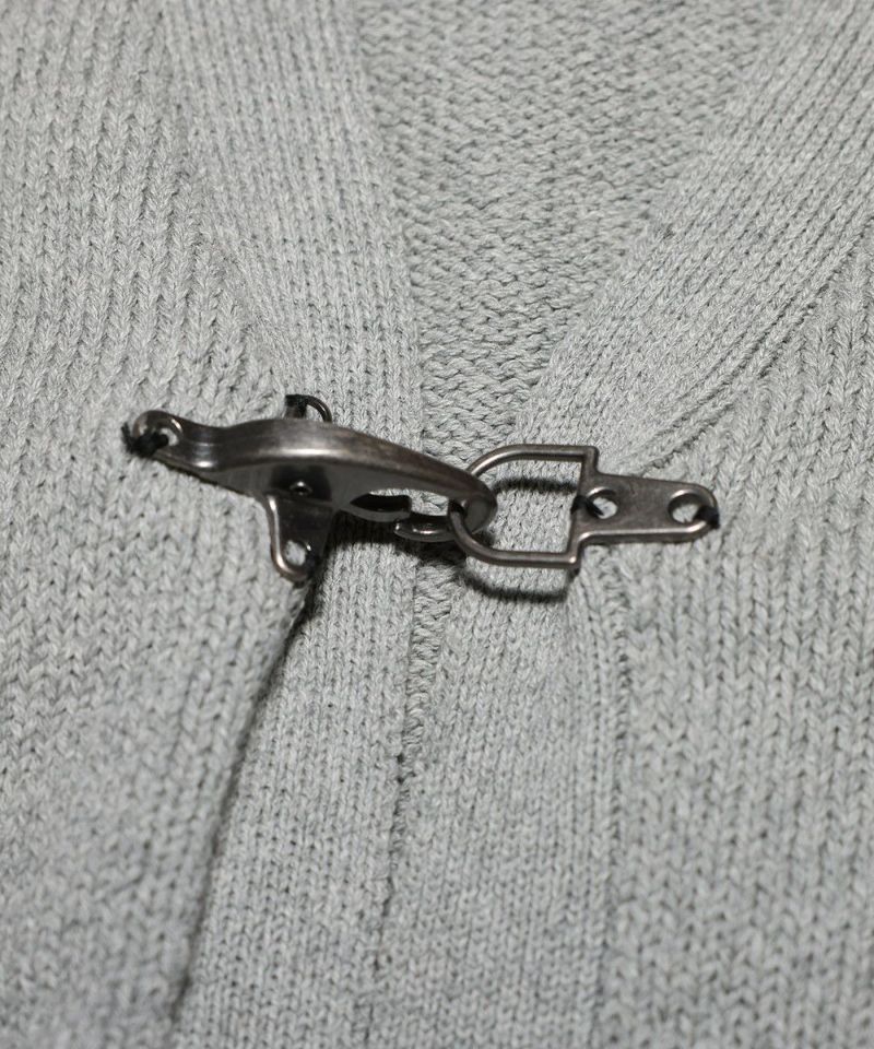 フロントに配したファイヤーマンバックルが目を引く、存在感のあるニットカーディガン。メタルパーツの無骨な表情がシンプルな中にエッジを効かせ、スタイリングのポイントになるアイテムです。