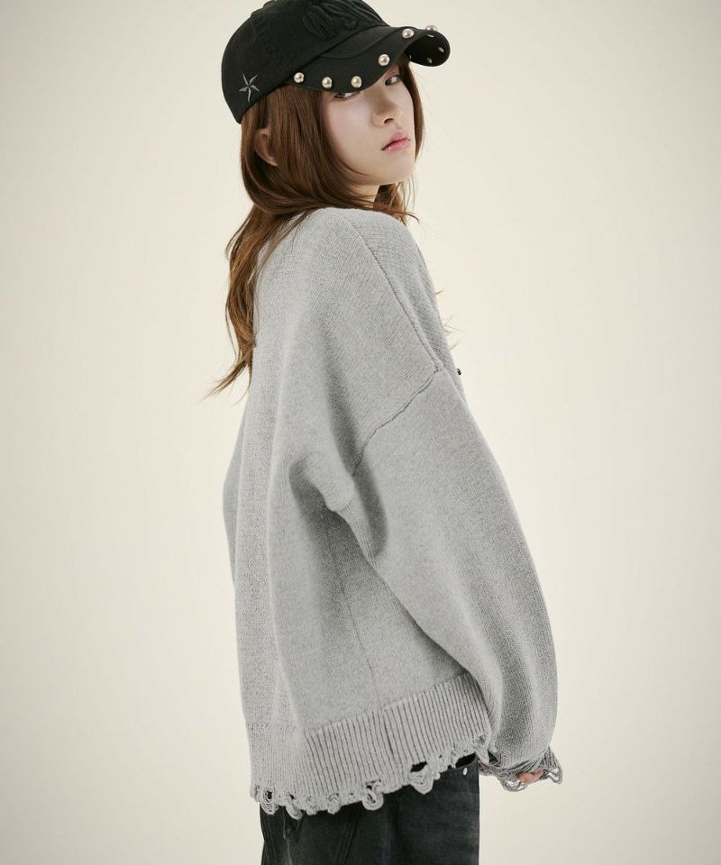 裾や袖口に施したダメージ加工がヴィンテージライクな雰囲気をプラス。程よくゆとりのあるサイジングと肩を落としたドロップショルダーで、抜け感のあるバランスに仕上がっています。